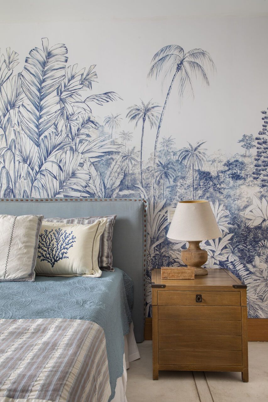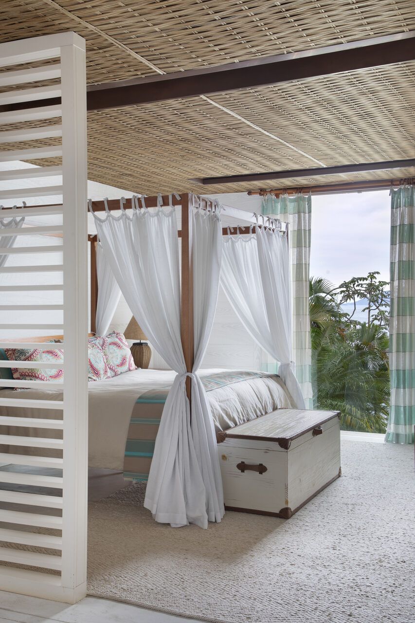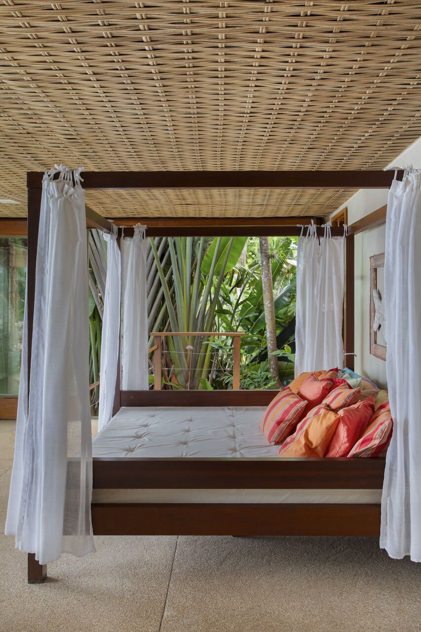 Na decoração, poucas peças foram mantidas, como a cama e as mesas de cabeceira da suíte do casal, a mesa de jantar e o camão no spa. O restante do mobiliário foi escolhido para incentivar o relaxamento e a contemplação da paisagem, com peças grandes, confortáveis e integradas ao entorno. Entre os destaques estão as poltronas Astúrias, de Carlos Motta, posicionadas na varanda voltada para o mar, que equilibram design assinado e descontração. A paleta de cores neutra, com branco, bege e off-white, recebe toques de azul e verde-água, além de madeira clara e palha, criando um pano de fundo elegante para valorizar a vista.