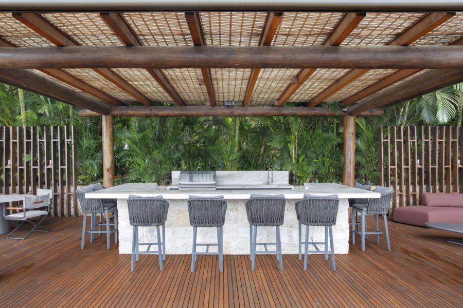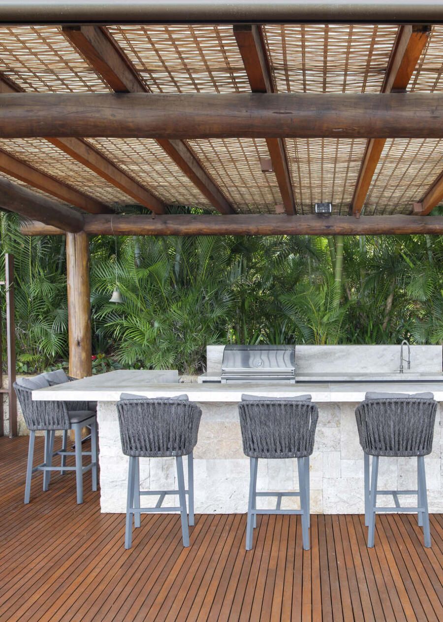 À beira-mar, um novo anexo de lazer se tornou o coração social da propriedade. Projetado do zero por Mônica Gervásio, o lounge gourmet funciona como extensão da casa principal e foi pensado para o pós-praia e para grandes confraternizações.