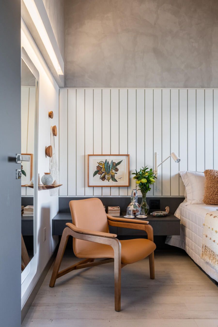 “No desenvolvimento do projeto de interiores, manteve-se o respeito à arquitetura original da casa. Foram desenvolvidos, por exemplo, painéis de madeira, que incorporam as portas da cozinha e lavabo, assim como o guarda corpo de vidro, com soluções de desenho pensadas de modo a realçar os móveis e a coberta de madeira, a qual se trata de uma grande cobertura inclinada com pé direito duplo, iluminada de forma indireta. A valorização do jardim também foi um ponto de inflexão importante no projeto, principalmente na área do SPA, onde foi criado um jardim lateral, buscando aproximar a área verde da construção e a integrar com os espaços do SPA e do quarto de hóspedes existentes neste pavimento.”