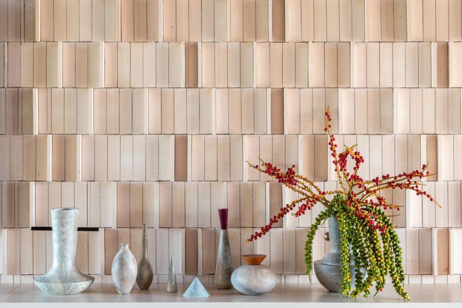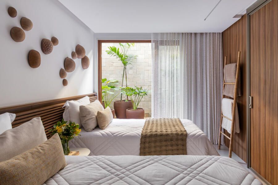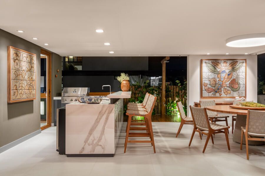 A fim de manter a característica praiana ao mesmo tempo em que investe em materiais de alta qualidade, a Porto Neves Arquitetura definiu para o acabamento dos ambientes materiais naturais, como madeira, pedra e tijolo natural. Além disso, acabamentos que remetem a texturas naturais, a exemplo do porcelanato Portobello Barcelona Cristal, que se assemelha ao aspecto da areia, e o Cottage Cannelle, que possui similaridades com uma madeira lavada na cor branca, também foram selecionados.