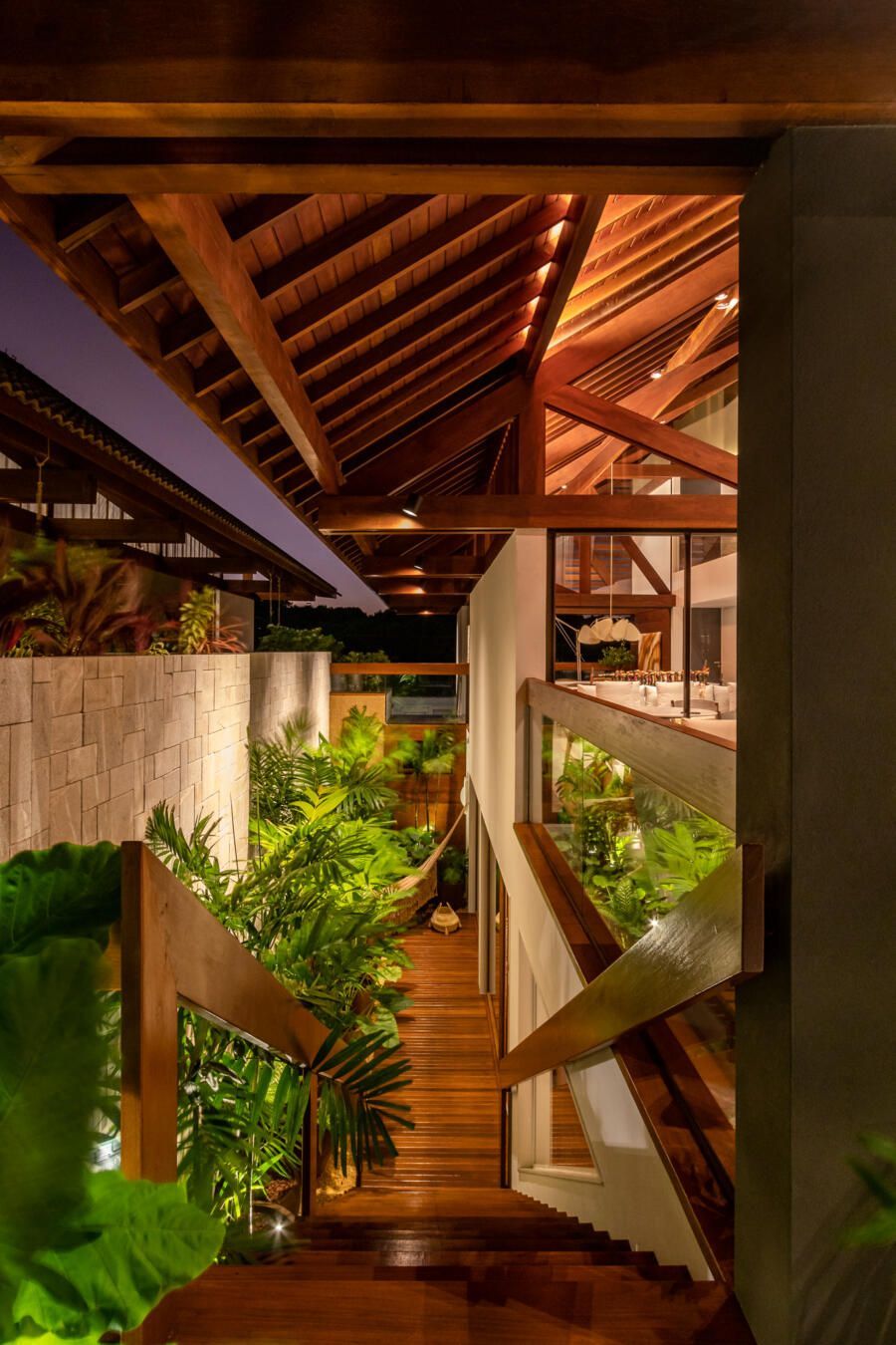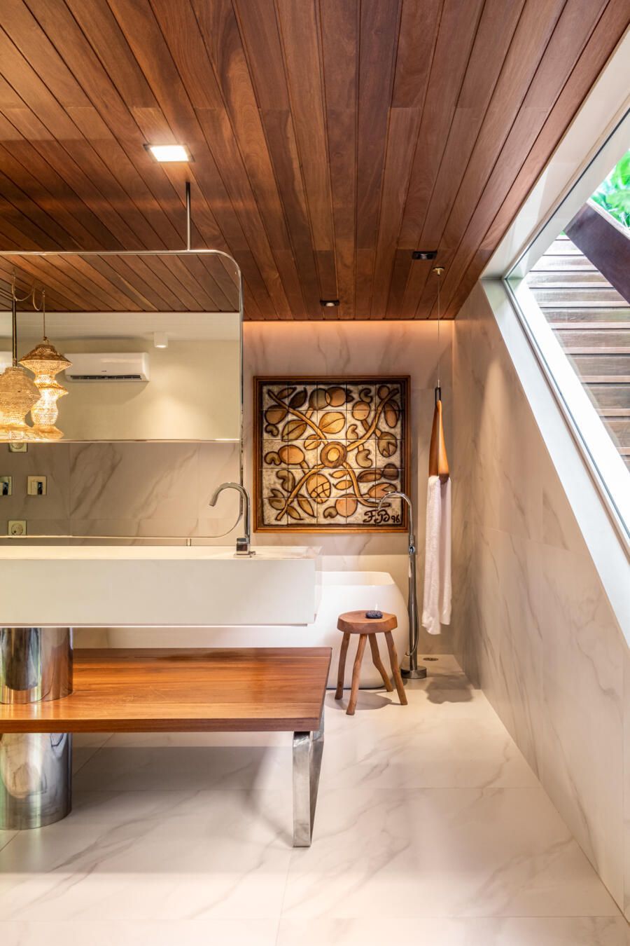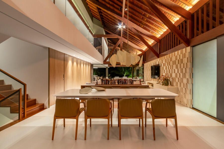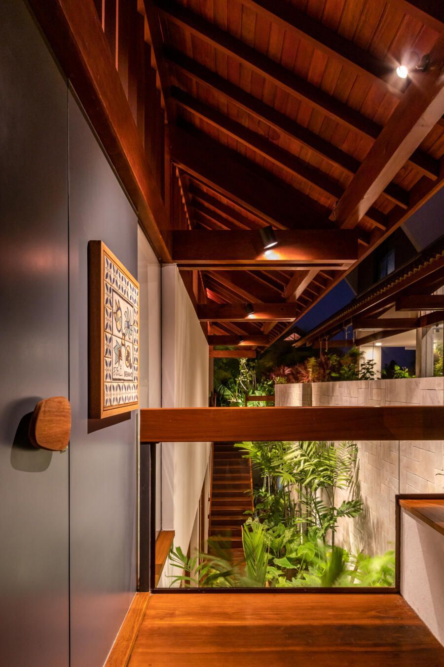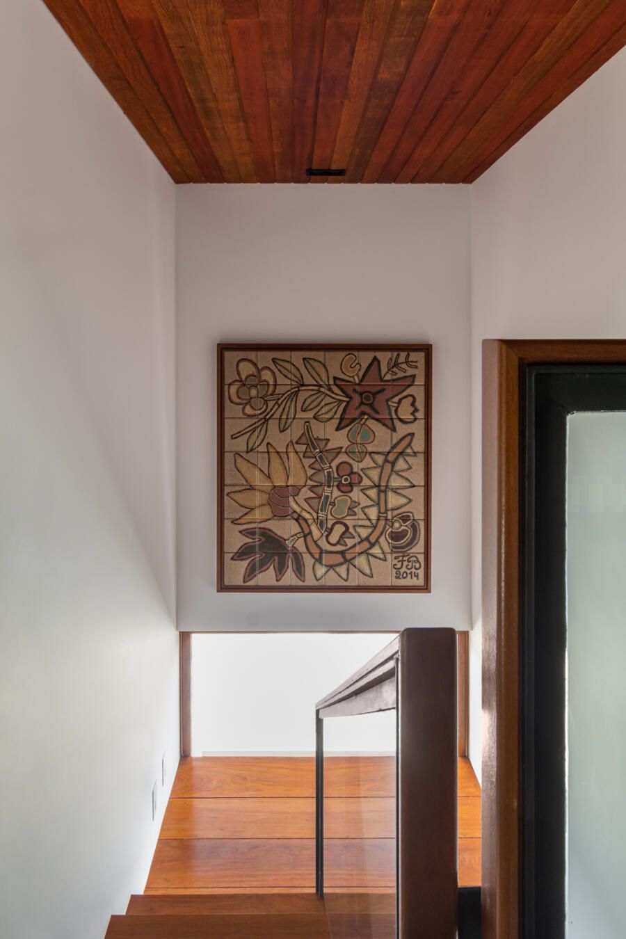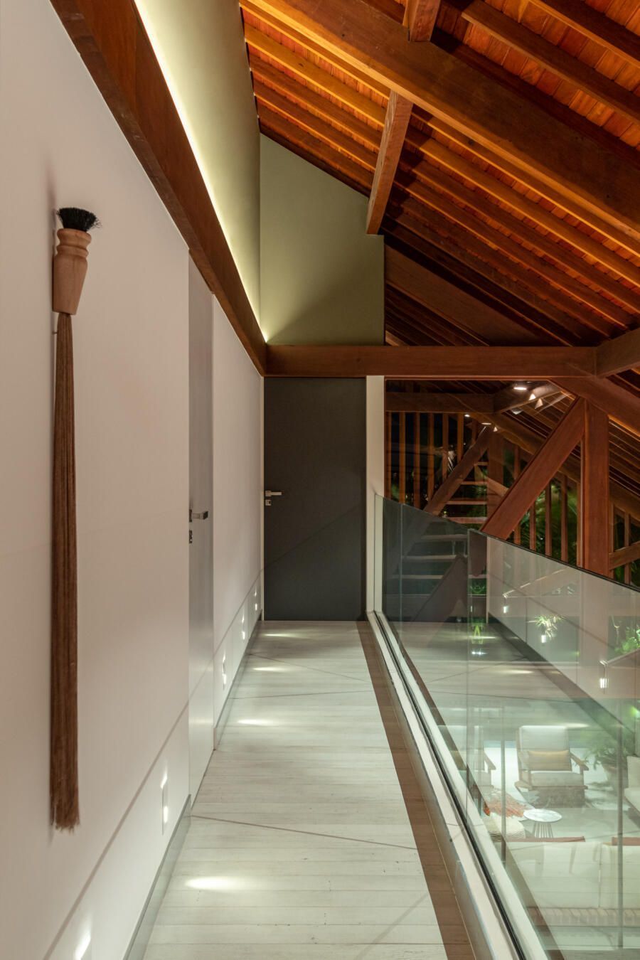 “No desenvolvimento do projeto de interiores, manteve-se o respeito à arquitetura original da casa. Foram desenvolvidos, por exemplo, painéis de madeira, que incorporam as portas da cozinha e lavabo, assim como o guarda corpo de vidro, com soluções de desenho pensadas de modo a realçar os móveis e a coberta de madeira, a qual se trata de uma grande cobertura inclinada com pé direito duplo, iluminada de forma indireta. A valorização do jardim também foi um ponto de inflexão importante no projeto, principalmente na área do SPA, onde foi criado um jardim lateral, buscando aproximar a área verde da construção e a integrar com os espaços do SPA e do quarto de hóspedes existentes neste pavimento.”