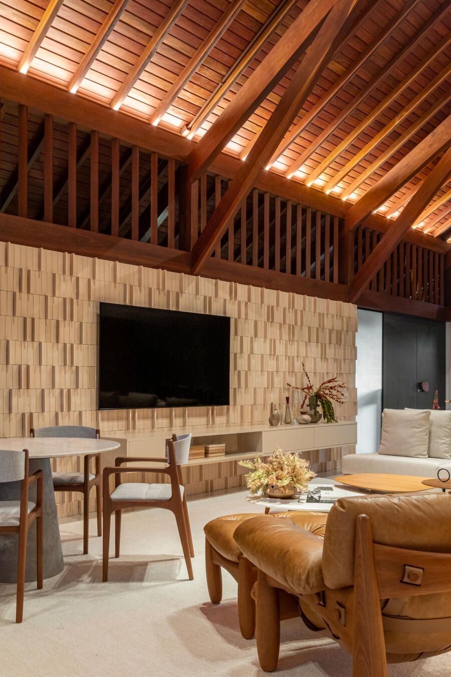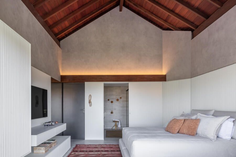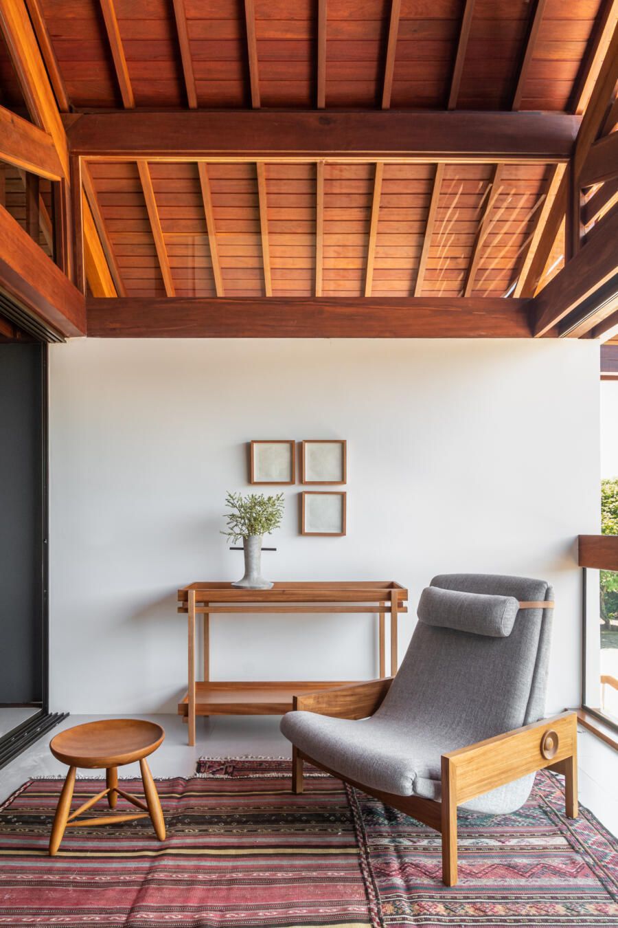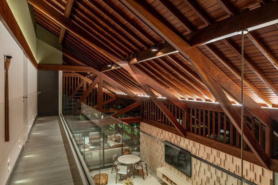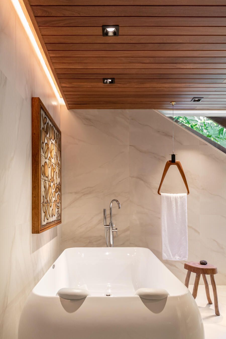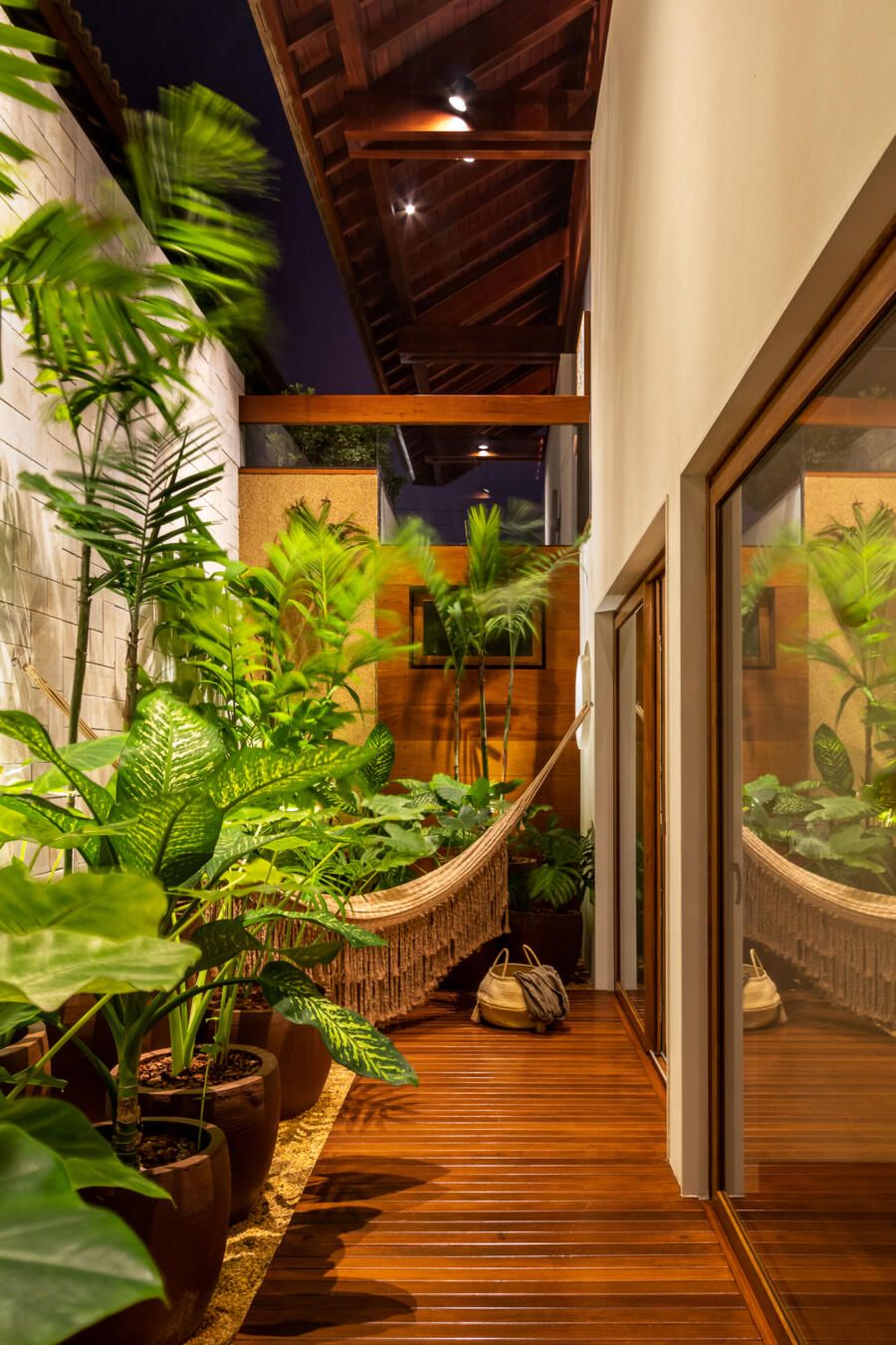 “No desenvolvimento do projeto de interiores, manteve-se o respeito à arquitetura original da casa. Foram desenvolvidos, por exemplo, painéis de madeira, que incorporam as portas da cozinha e lavabo, assim como o guarda corpo de vidro, com soluções de desenho pensadas de modo a realçar os móveis e a coberta de madeira, a qual se trata de uma grande cobertura inclinada com pé direito duplo, iluminada de forma indireta. A valorização do jardim também foi um ponto de inflexão importante no projeto, principalmente na área do SPA, onde foi criado um jardim lateral, buscando aproximar a área verde da construção e a integrar com os espaços do SPA e do quarto de hóspedes existentes neste pavimento.”