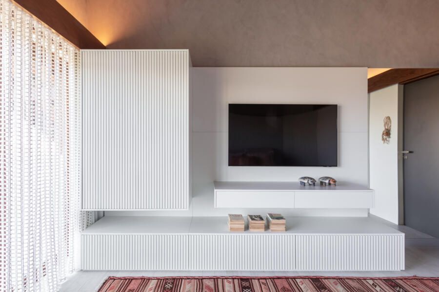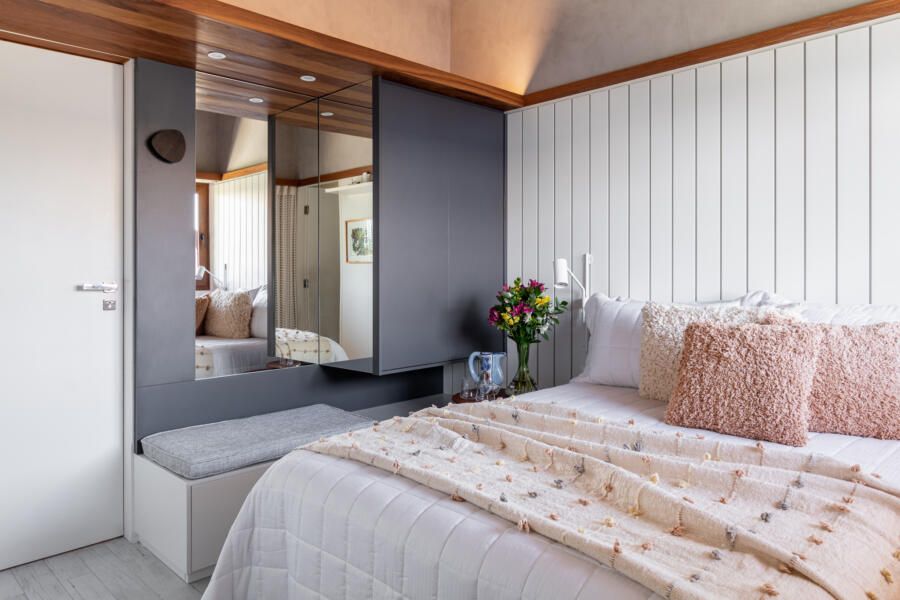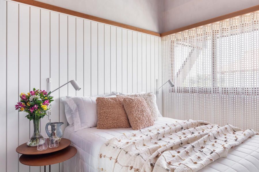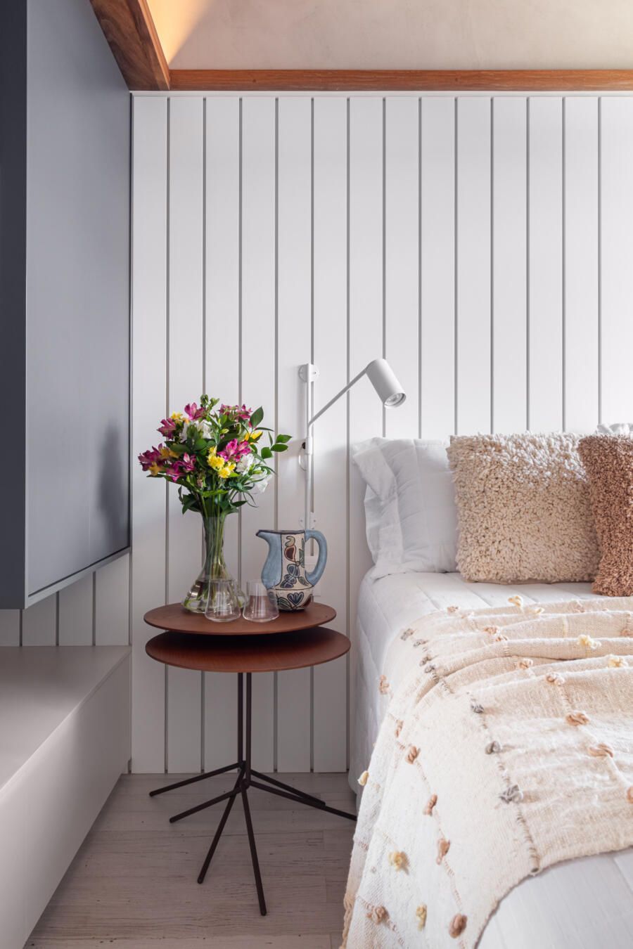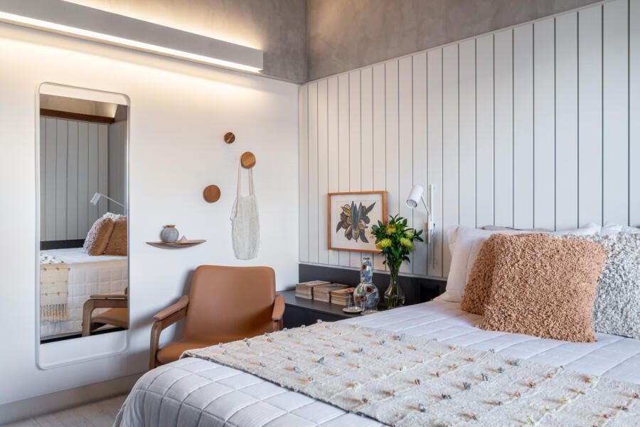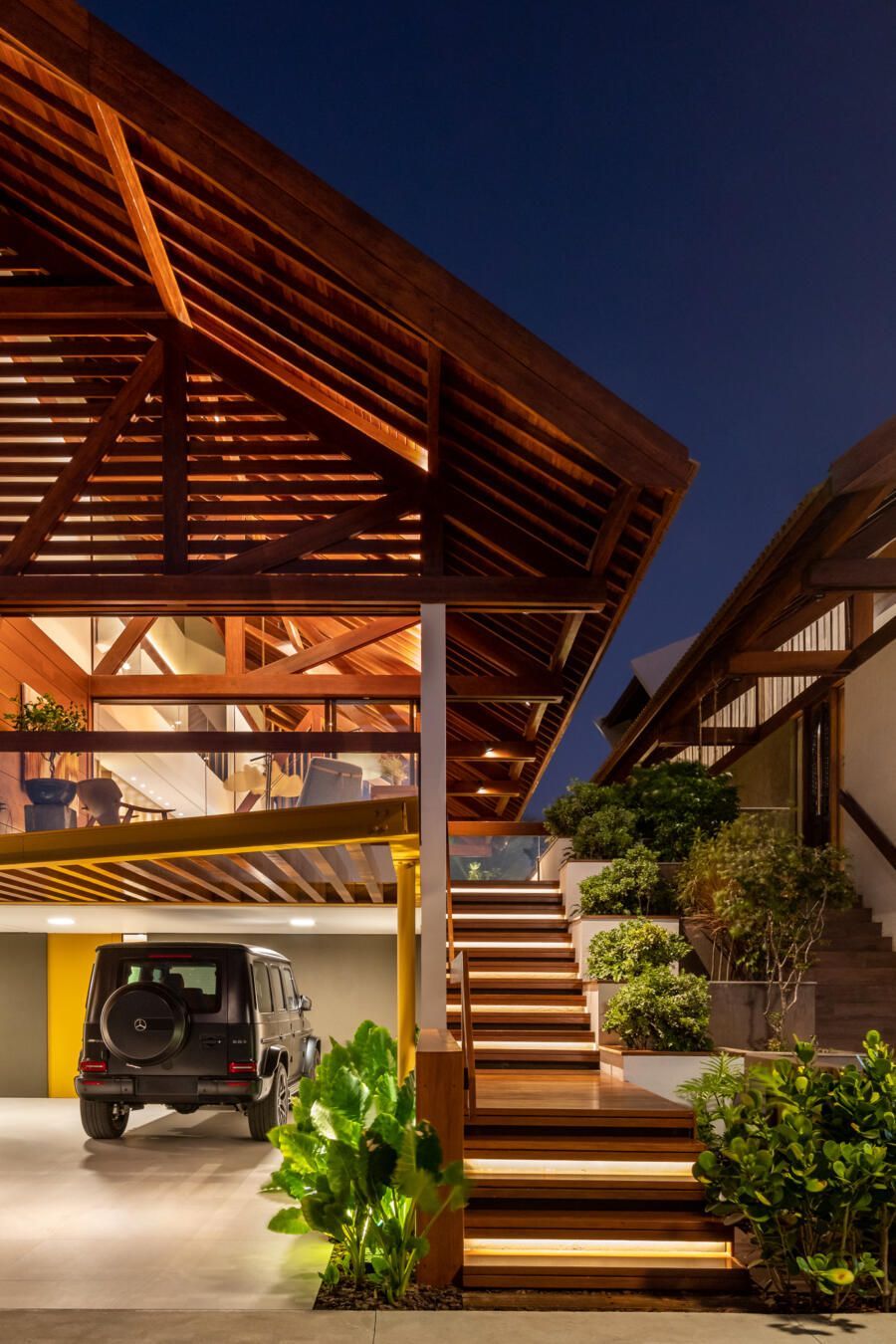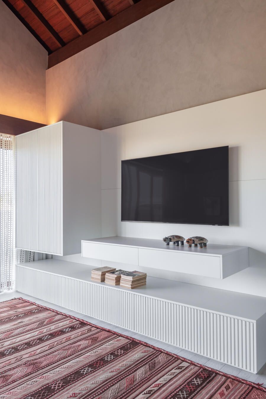 “No desenvolvimento do projeto de interiores, manteve-se o respeito à arquitetura original da casa. Foram desenvolvidos, por exemplo, painéis de madeira, que incorporam as portas da cozinha e lavabo, assim como o guarda corpo de vidro, com soluções de desenho pensadas de modo a realçar os móveis e a coberta de madeira, a qual se trata de uma grande cobertura inclinada com pé direito duplo, iluminada de forma indireta. A valorização do jardim também foi um ponto de inflexão importante no projeto, principalmente na área do SPA, onde foi criado um jardim lateral, buscando aproximar a área verde da construção e a integrar com os espaços do SPA e do quarto de hóspedes existentes neste pavimento.”