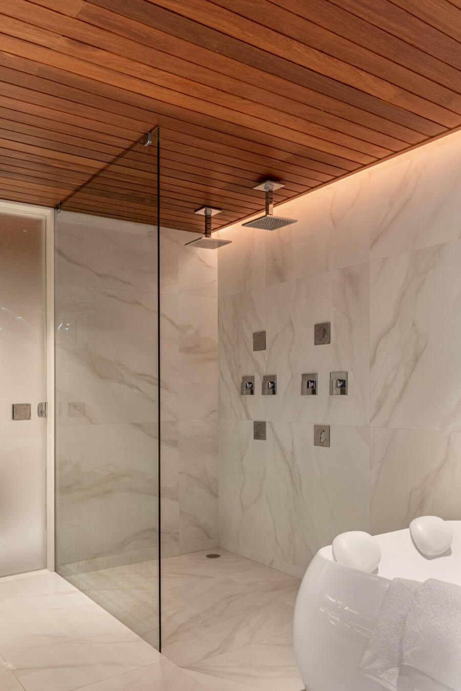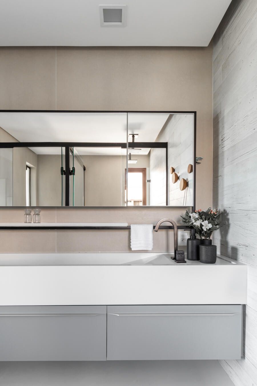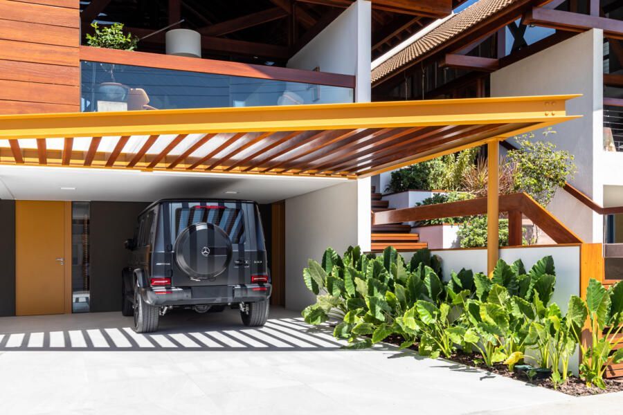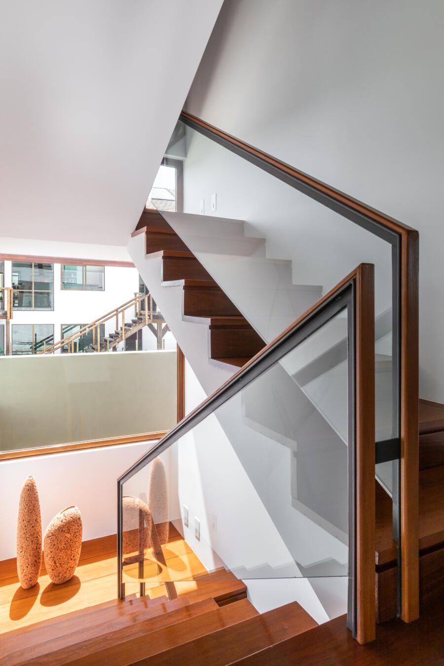 A arquitetura original do imóvel foi mantida e novos espaços foram criados, como a área de SPA e a sauna. Além disso, a piscina também foi redesenhada e outros detalhes construtivos para escadas, esquadrias internas e guarda-corpos de vidro foram elaborados no projeto de interiores.