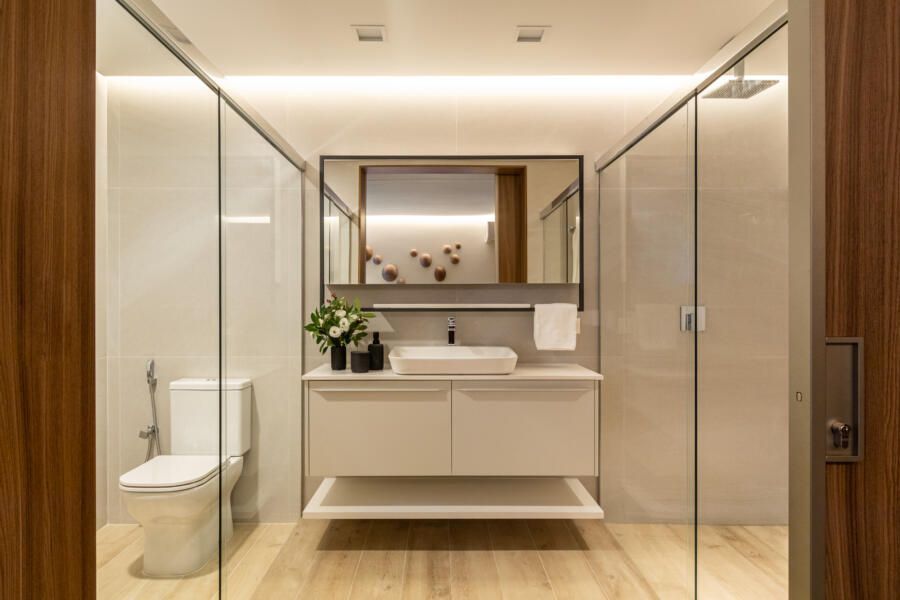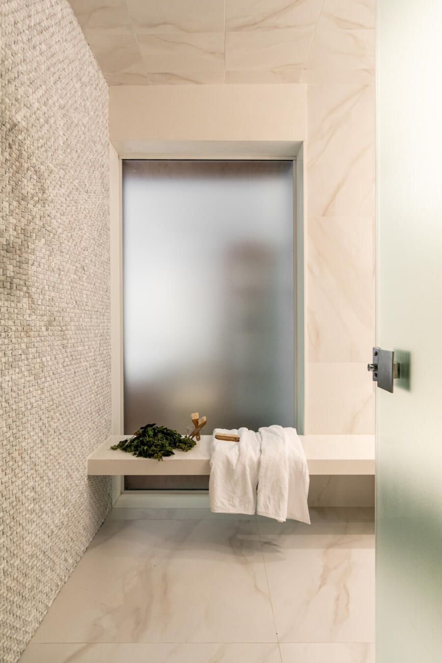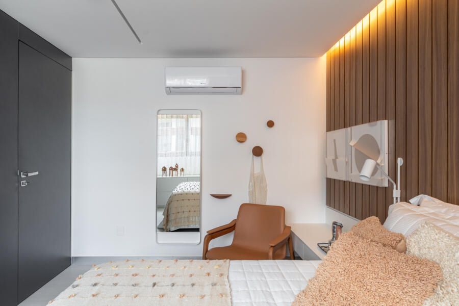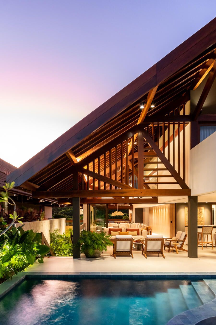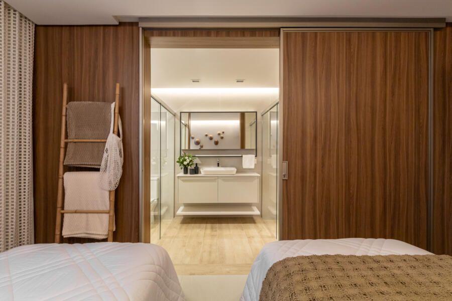 A arquitetura original do imóvel foi mantida e novos espaços foram criados, como a área de SPA e a sauna. Além disso, a piscina também foi redesenhada e outros detalhes construtivos para escadas, esquadrias internas e guarda-corpos de vidro foram elaborados no projeto de interiores.