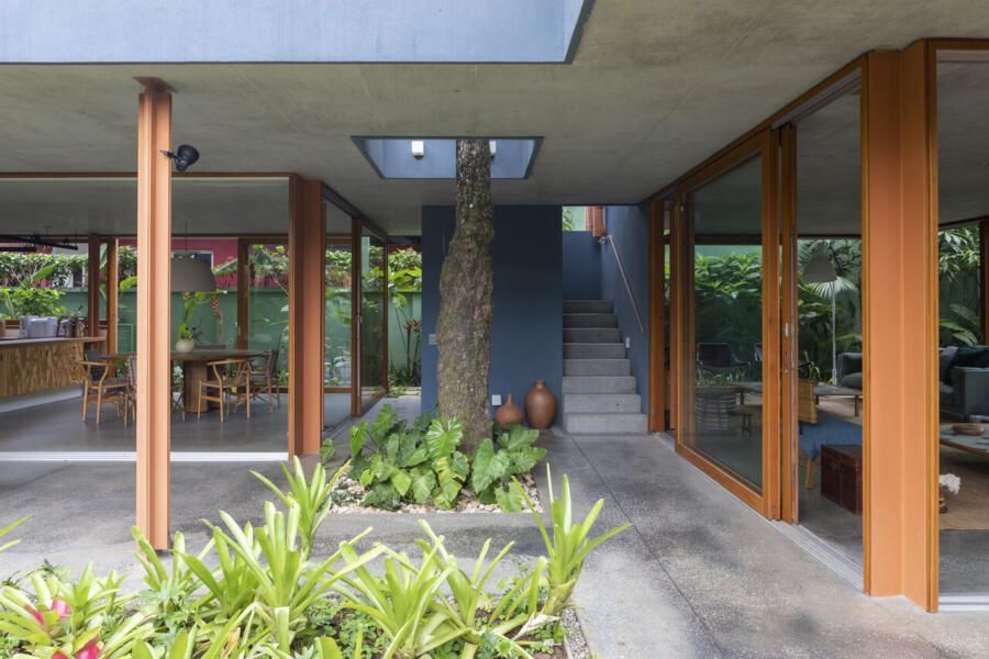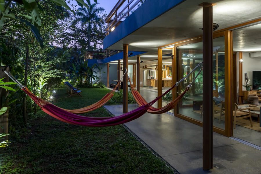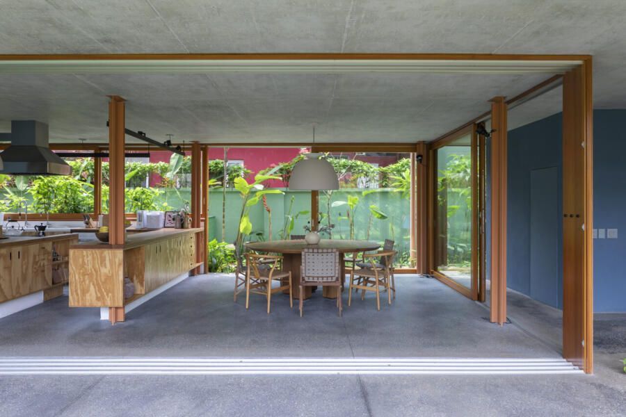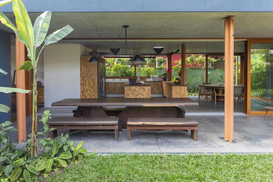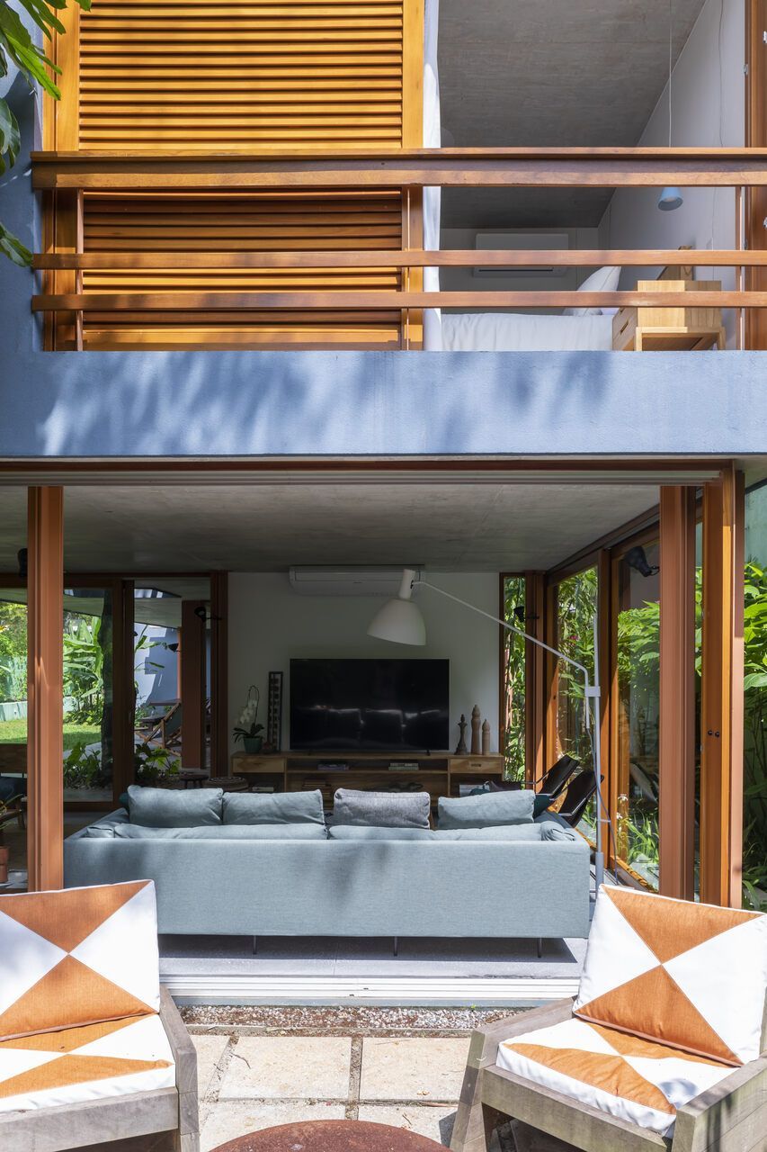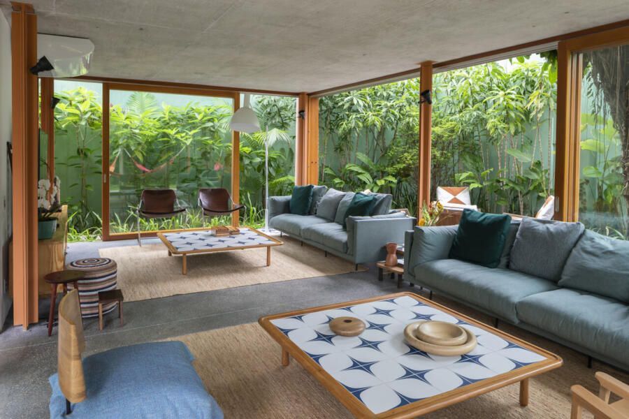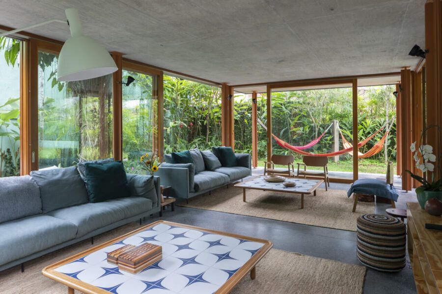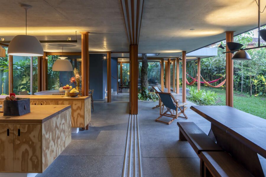 No térreo, o concreto escuro com pedriscos cobre todo o piso sem interrupções. As portas de correr, enormes, podem se abrir completamente, transformando a casa em uma grande varanda. Na sala de TV, sofás verdes se integram ao jardim, que ganha poltronas e um lenheiro em aço corten usado tanto como fogareiro quanto como mesa. Ali perto, um redário se estende entre cobertura e gramado, dissolvendo ainda mais os limites.