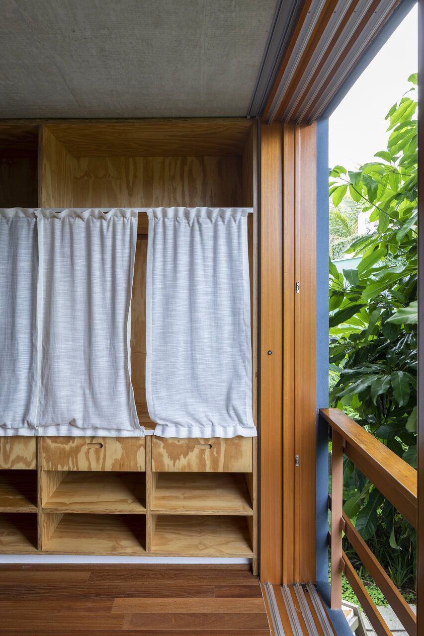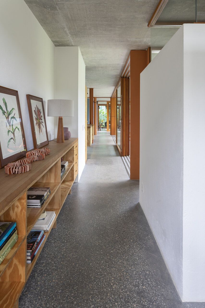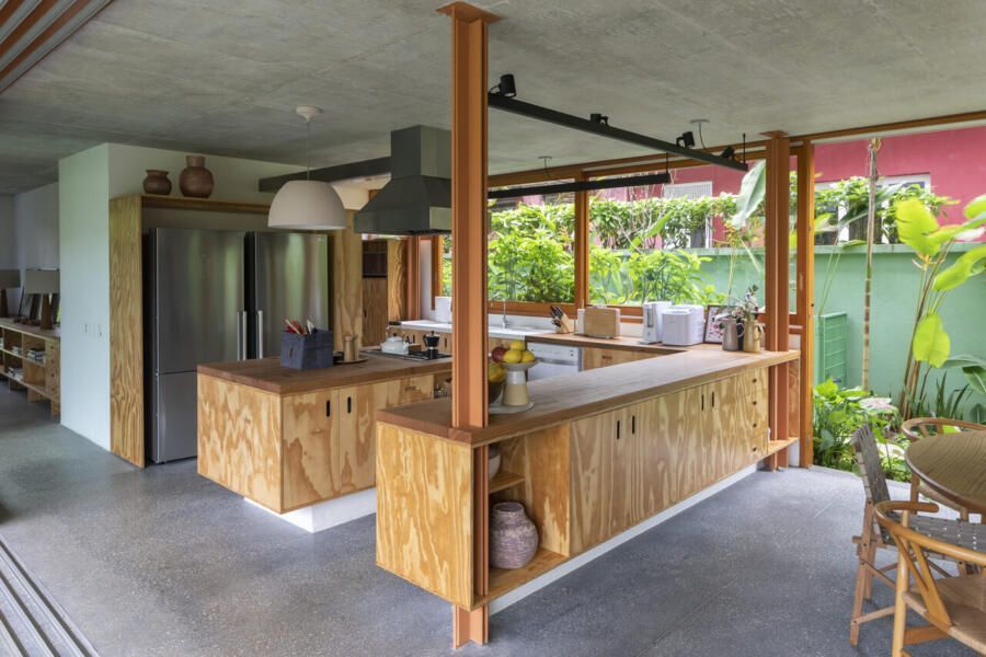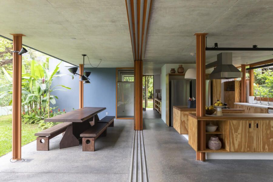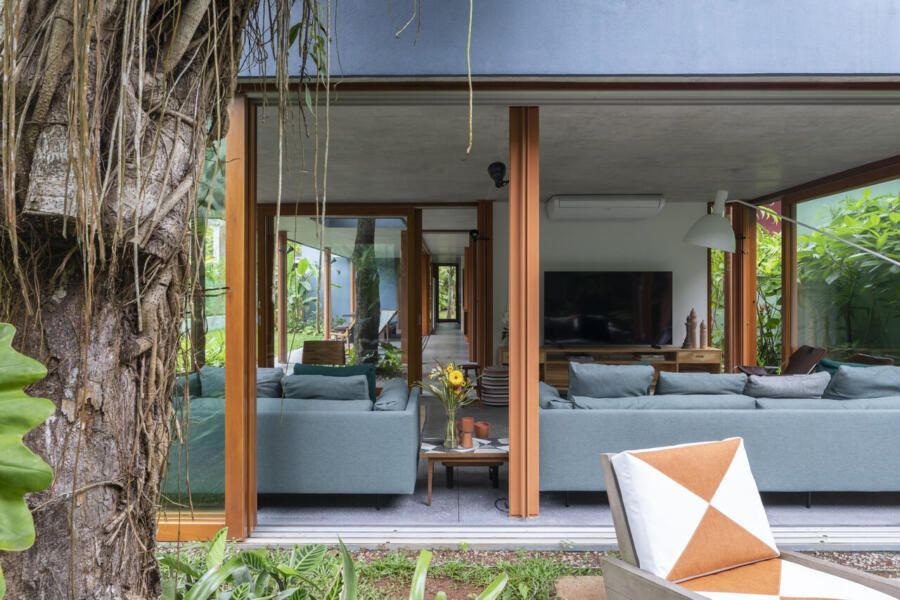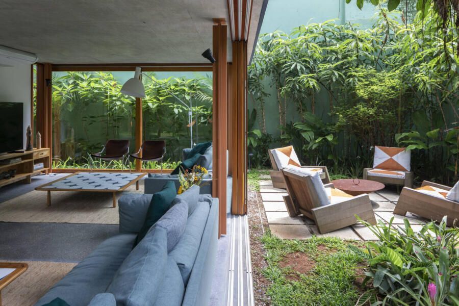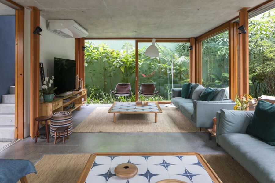 No térreo, o concreto escuro com pedriscos cobre todo o piso sem interrupções. As portas de correr, enormes, podem se abrir completamente, transformando a casa em uma grande varanda. Na sala de TV, sofás verdes se integram ao jardim, que ganha poltronas e um lenheiro em aço corten usado tanto como fogareiro quanto como mesa. Ali perto, um redário se estende entre cobertura e gramado, dissolvendo ainda mais os limites.