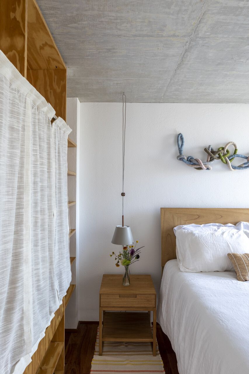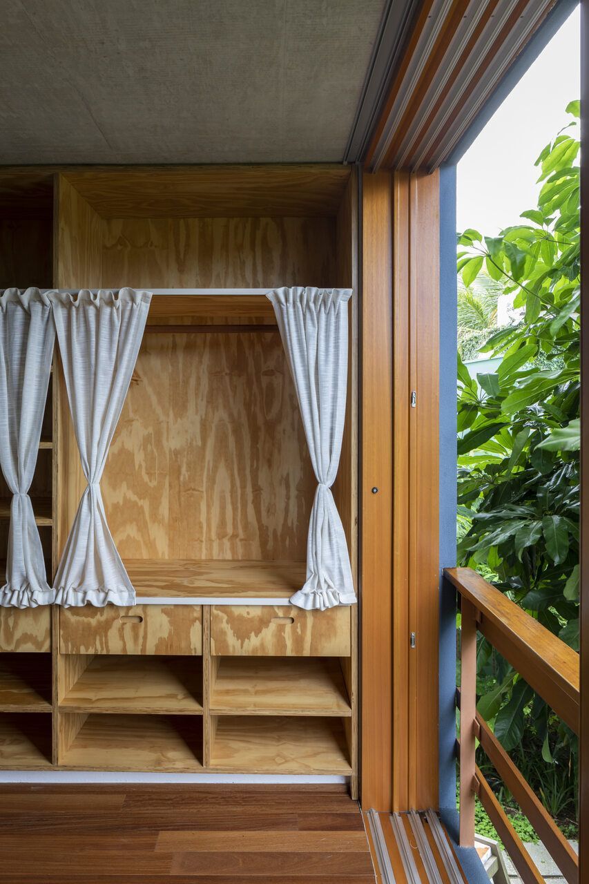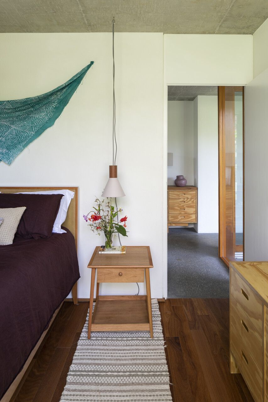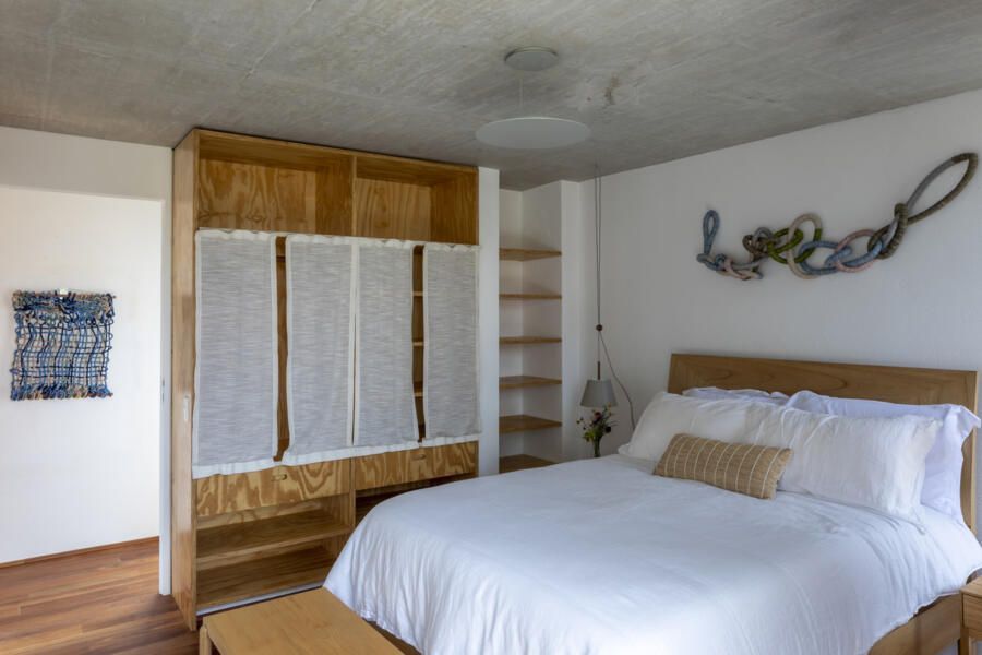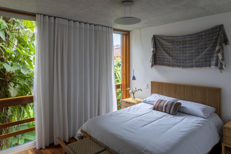 Os interiores revelam uma atmosfera contemporânea, mas com a naturalidade de uma verdadeira casa de praia. Tons de terracota, verdes e azuis se misturam a tapetes artesanais, sisal e hemp, criando texturas que remetem à terra e ao mar. Os quartos, seis ao todo, foram desenhados em madeira clara, com cabeceiras confortáveis, tapetes coloridos e luminárias delicadas, leves o suficiente para balançar com a brisa. Cortinas de linho e armários ventilados completam a sensação de frescor e simplicidade.