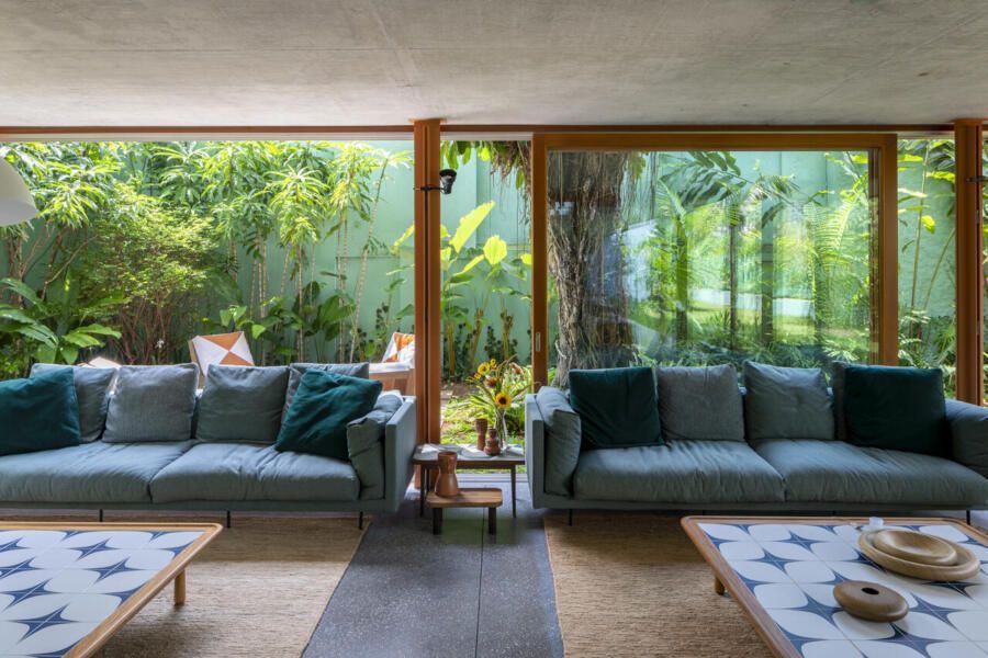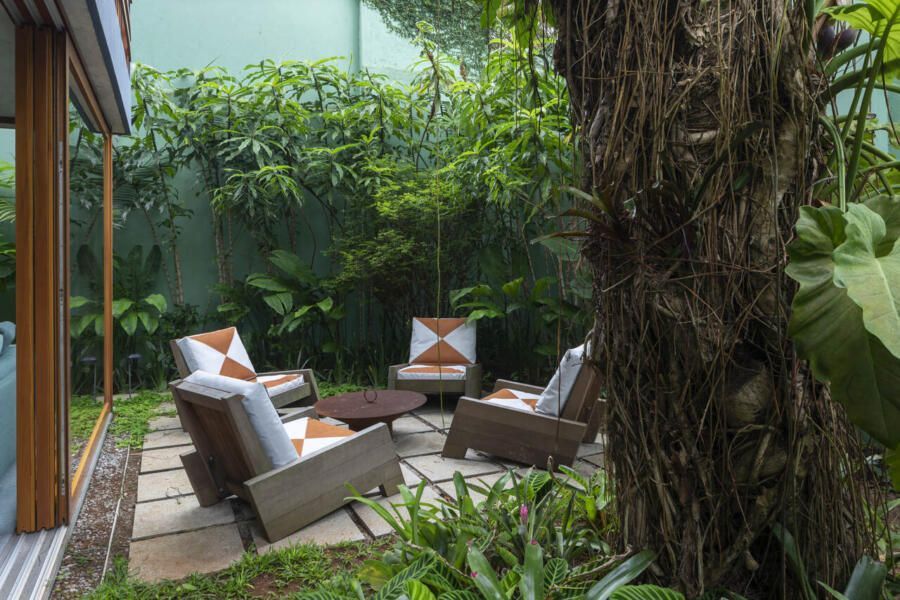 O terreno guardava árvores que foram preservadas, além de receber um delicado pomar desenhado pela paisagista Julieta Fialho. A natureza se mantém como protagonista e atravessa os ambientes: varandas, salas e jardins se confundem, dissolvendo fronteiras. A intenção sempre foi a fluidez, com espaços que acolhem, mas que também permitem a liberdade de mudar. Móveis leves, sofás baixos, mesas que circulam entre dentro e fora, poltronas que se agrupam sob a sombra de uma árvore. Cada escolha traduz a ideia de um lar flexível, pronto para receber pessoas e histórias.