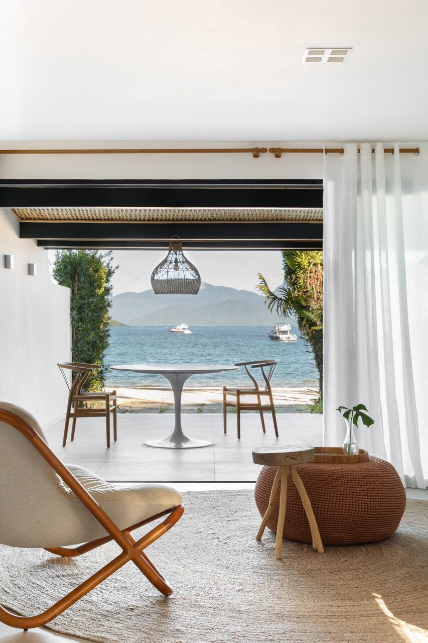 Voltada para as ilhas paradisíacas de Angra dos Reis, esta casa de praia combina decoração minimalista, tons claros e materiais naturais para valorizar a verdadeira protagonista do projeto: a vista privilegiada para o mar, emoldurada pela ampla sala de estar.