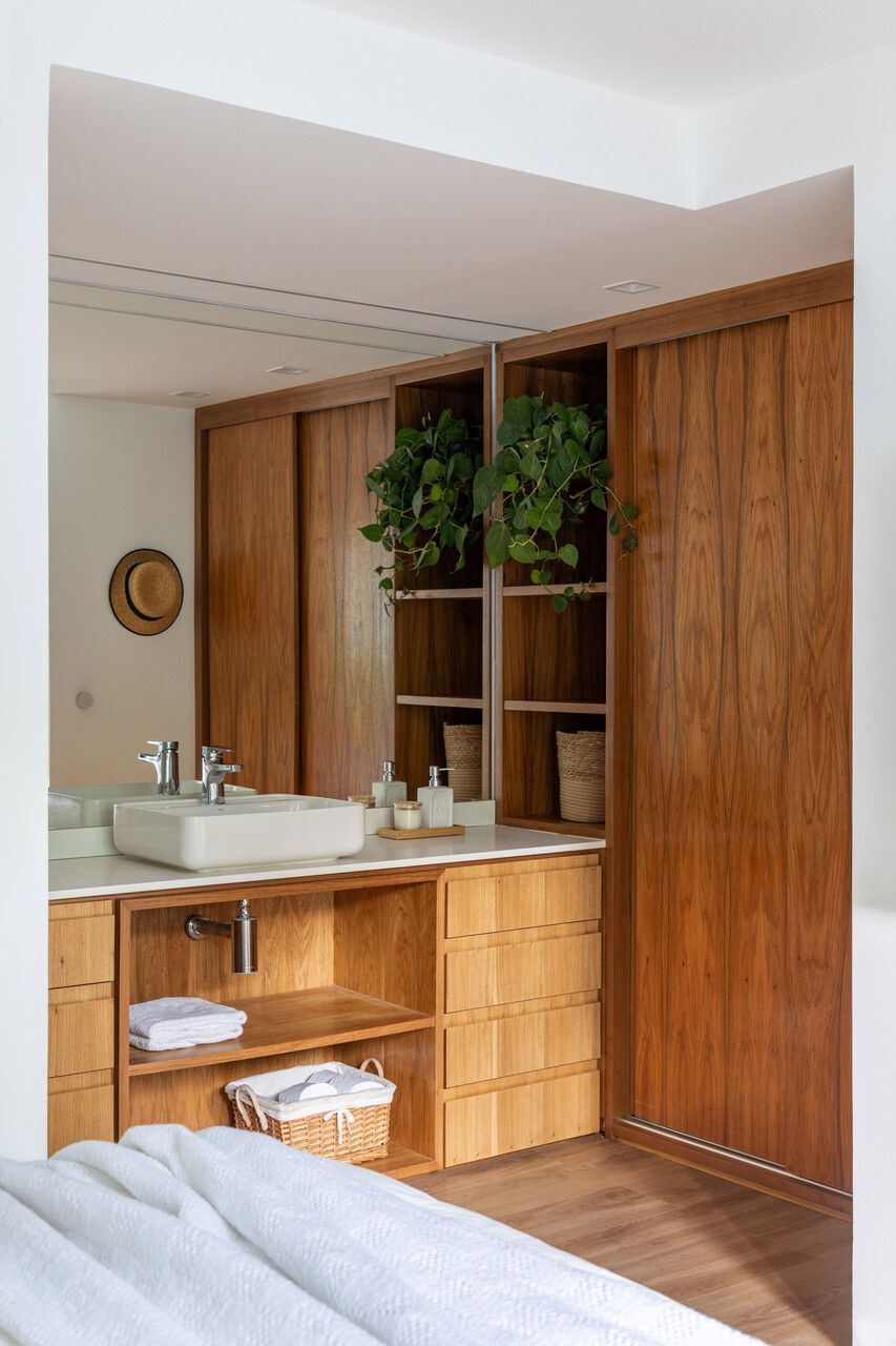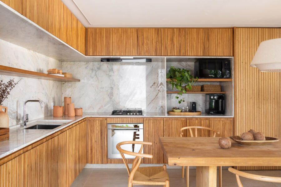 “Optamos por uma paleta clara e neutra, com paredes brancas, piso de porcelanato em tom areia, bancadas em mármore branco Paraná, marcenarias em ripas de Freijó e móveis com estrutura de madeira. As fibras naturais aparecem nos detalhes, como o tapete redondo, o espelho de parede, o assento das cadeiras e o abajur que ambientam a área de convivência.”