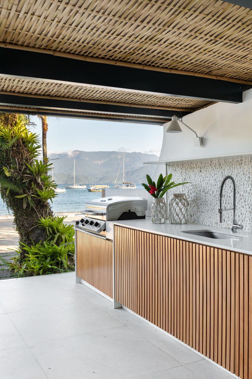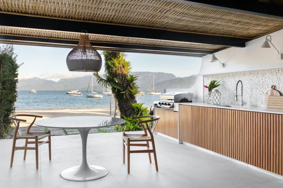 A proposta estética minimalista buscou valorizar materiais naturais e suas texturas, criando uma atmosfera de tranquilidade e sofisticação despretensiosa. Na varanda gourmet, um dos pontos altos do projeto, o telhado é forrado em bambu natural trançado, com uma extensa bancada de apoio com churrasqueira, armários em madeira Cumaru e vista direta para o mar.