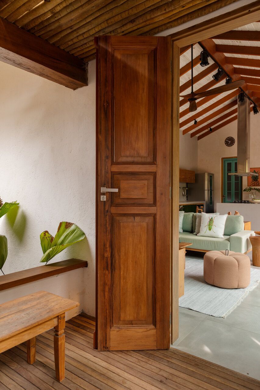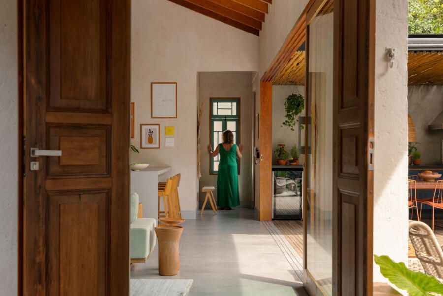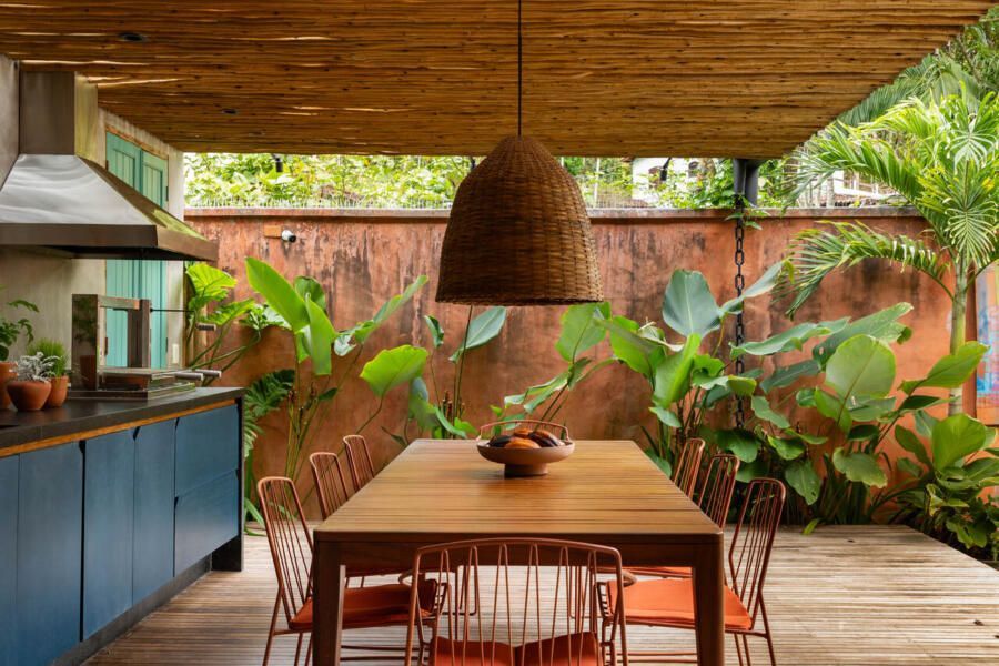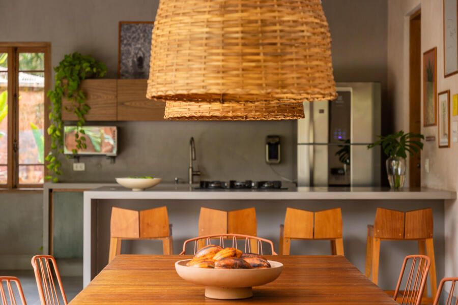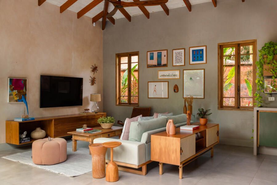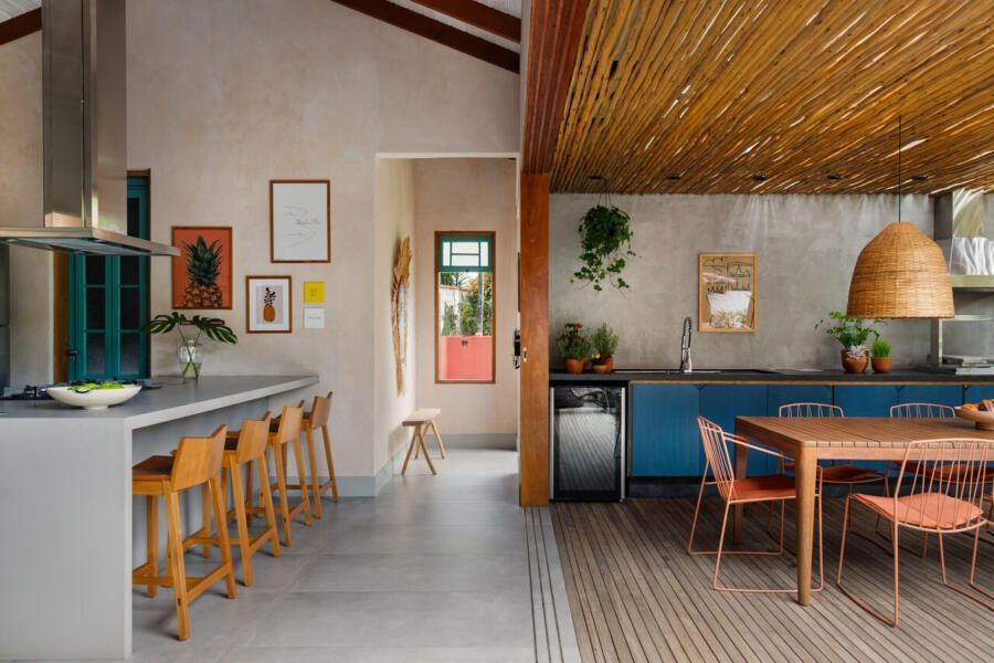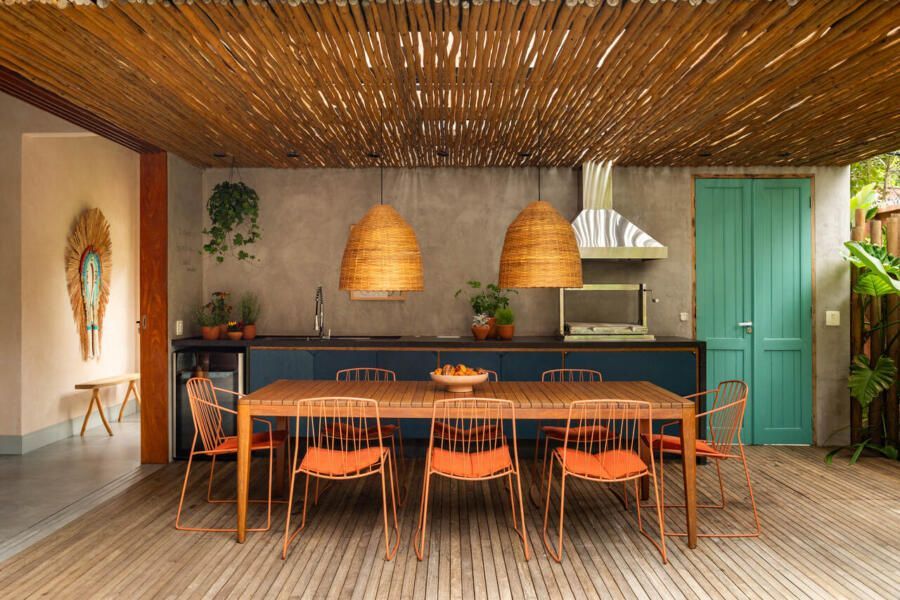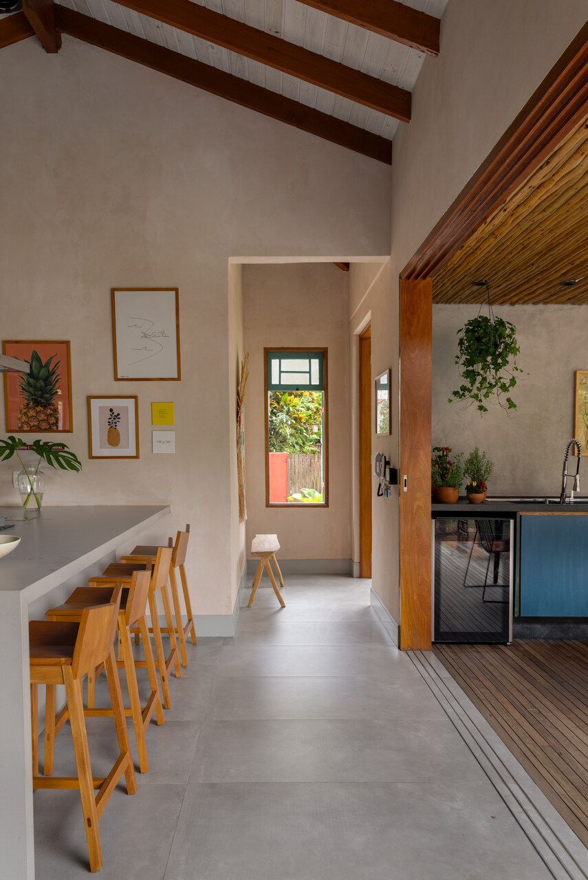 A materialidade do projeto é uma homenagem às texturas naturais e à memória afetiva do litoral. Enquanto o piso de cimento queimado e a marcenaria em tons de freijó e cedro trazem um ar contemporâneo aos interiores, elementos como o pergolado com brise em biriba (eucalipto roliço) filtram o sol e conferem um aspecto rústico e acolhedor. Detalhes como as janelas de demolição em pinho-de-riga e a textura areia nas paredes externas reforçam esse diálogo entre o novo e o tradicional, criando uma estética atemporal.