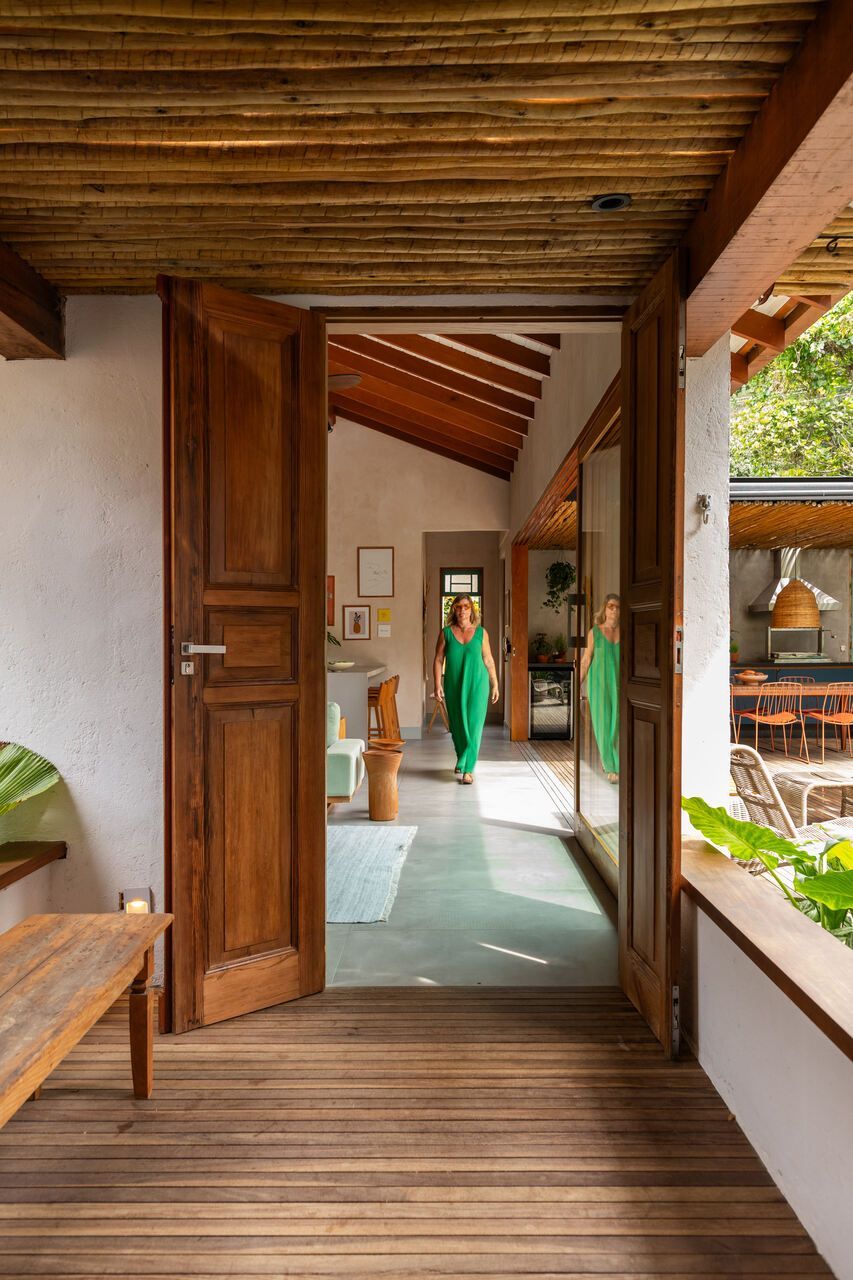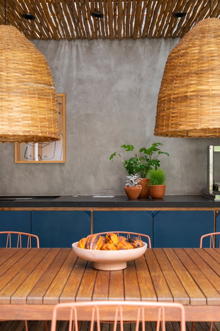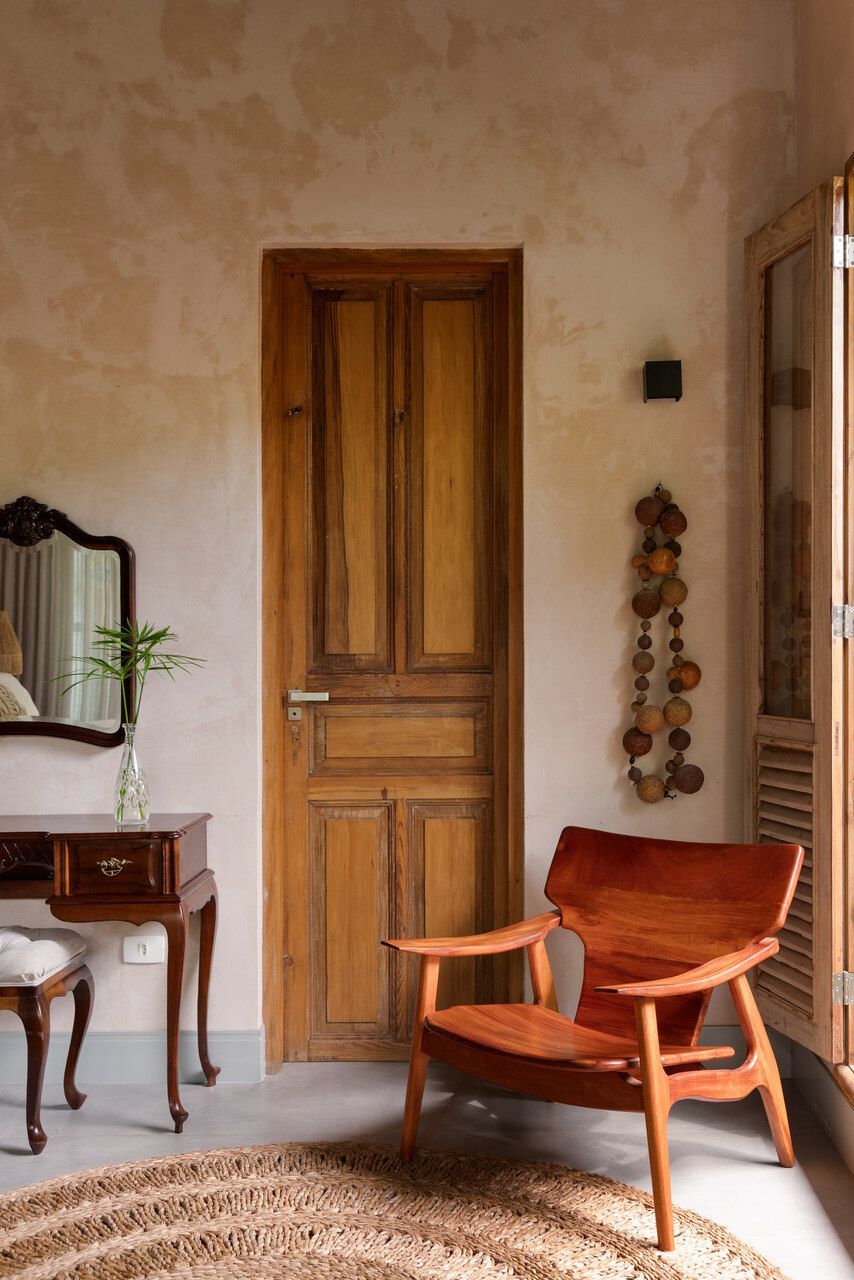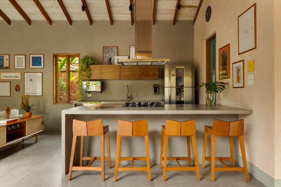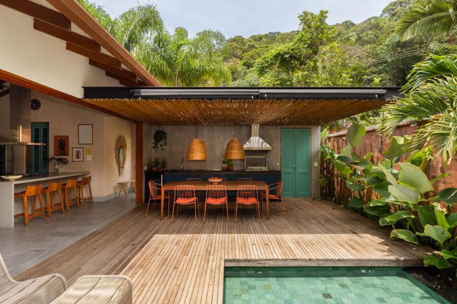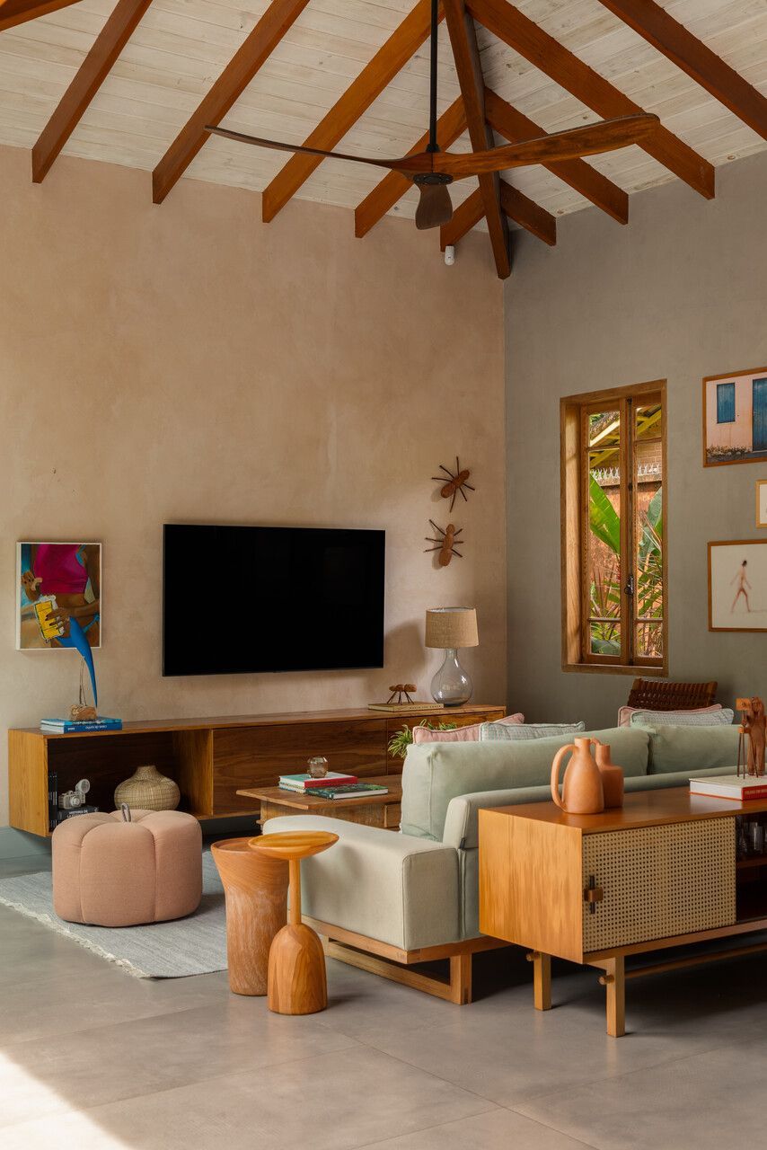 A materialidade do projeto é uma homenagem às texturas naturais e à memória afetiva do litoral. Enquanto o piso de cimento queimado e a marcenaria em tons de freijó e cedro trazem um ar contemporâneo aos interiores, elementos como o pergolado com brise em biriba (eucalipto roliço) filtram o sol e conferem um aspecto rústico e acolhedor. Detalhes como as janelas de demolição em pinho-de-riga e a textura areia nas paredes externas reforçam esse diálogo entre o novo e o tradicional, criando uma estética atemporal.
