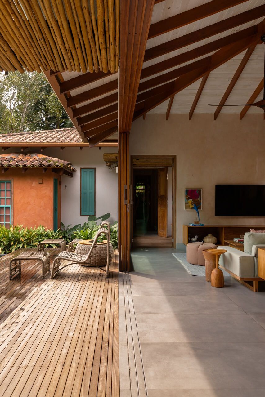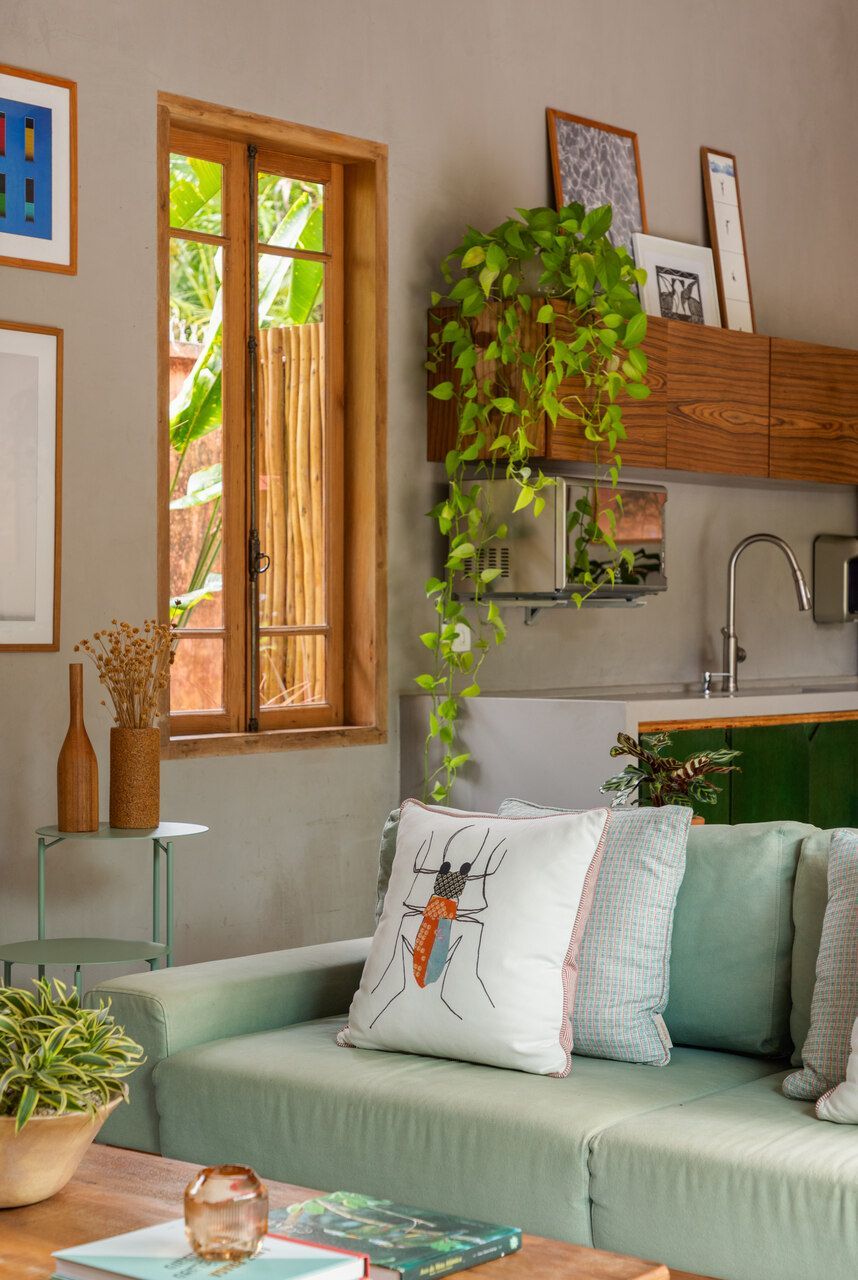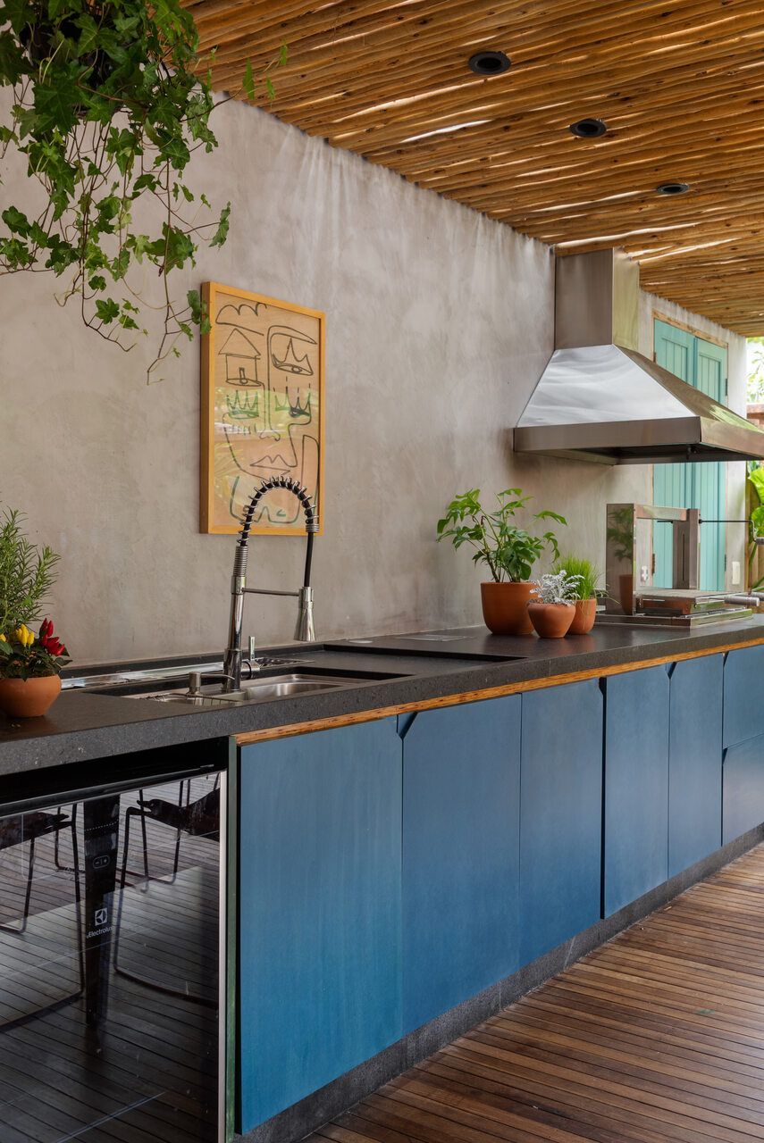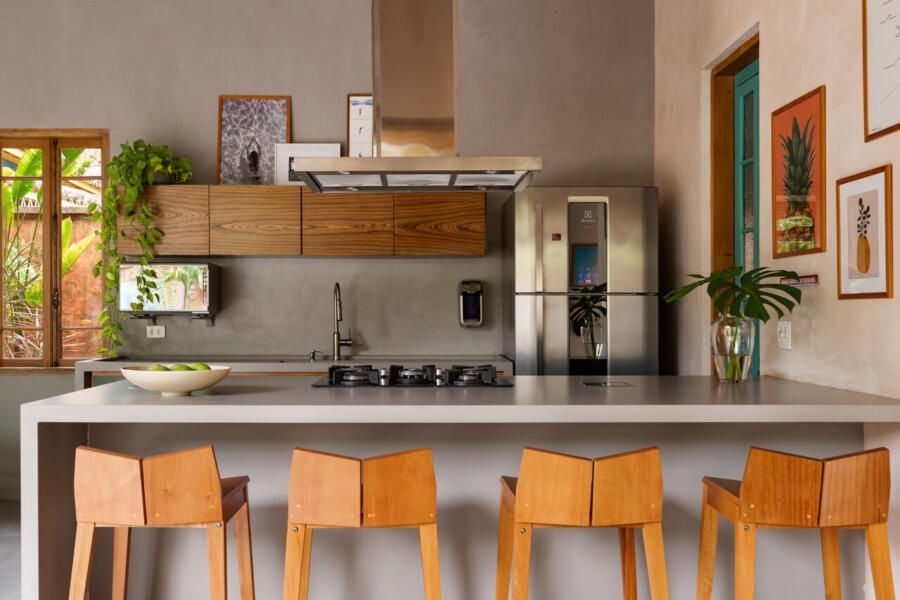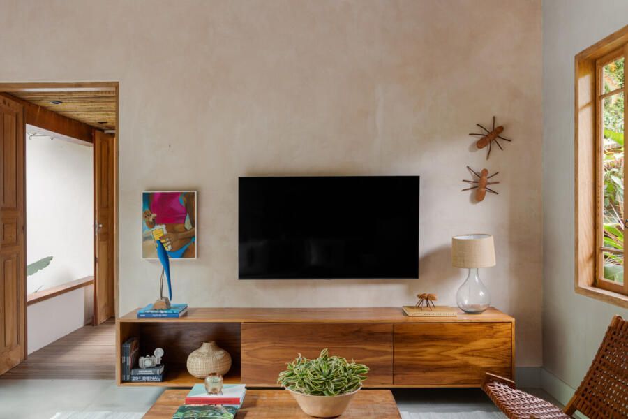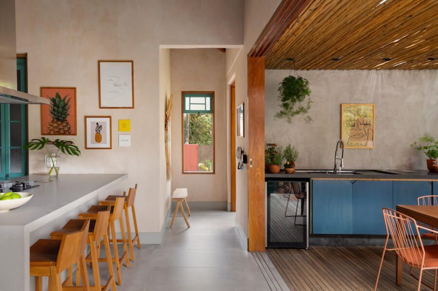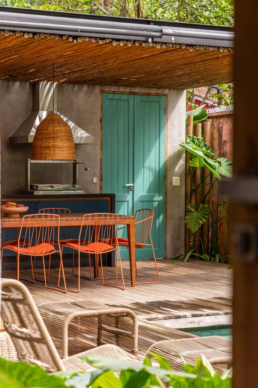 A materialidade do projeto é uma homenagem às texturas naturais e à memória afetiva do litoral. Enquanto o piso de cimento queimado e a marcenaria em tons de freijó e cedro trazem um ar contemporâneo aos interiores, elementos como o pergolado com brise em biriba (eucalipto roliço) filtram o sol e conferem um aspecto rústico e acolhedor. Detalhes como as janelas de demolição em pinho-de-riga e a textura areia nas paredes externas reforçam esse diálogo entre o novo e o tradicional, criando uma estética atemporal.