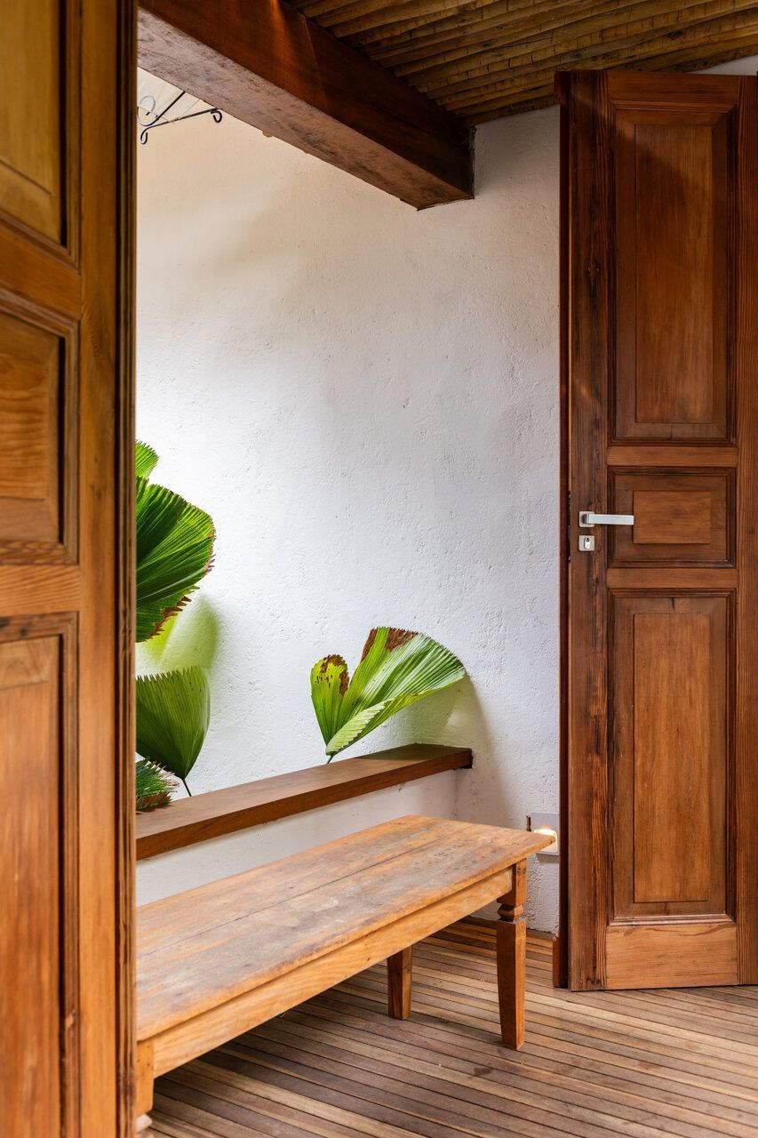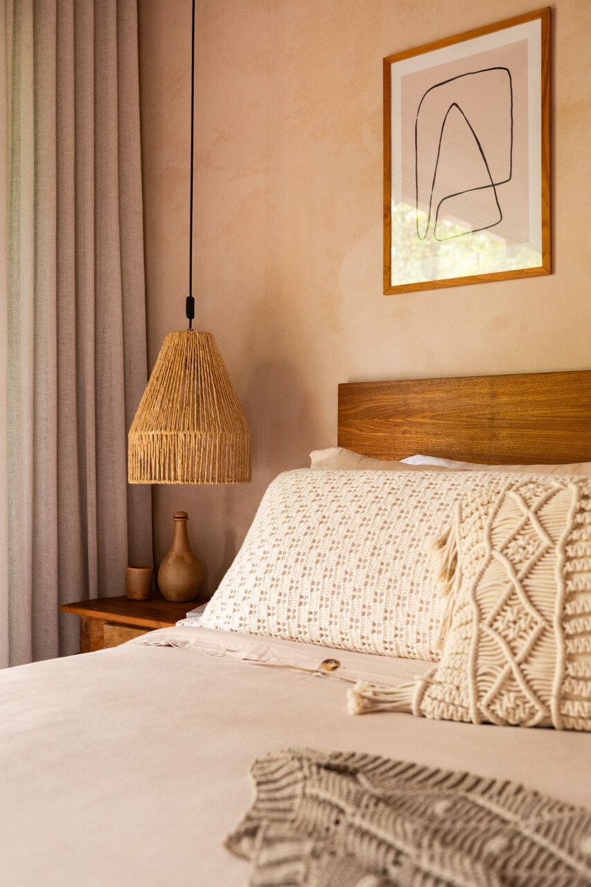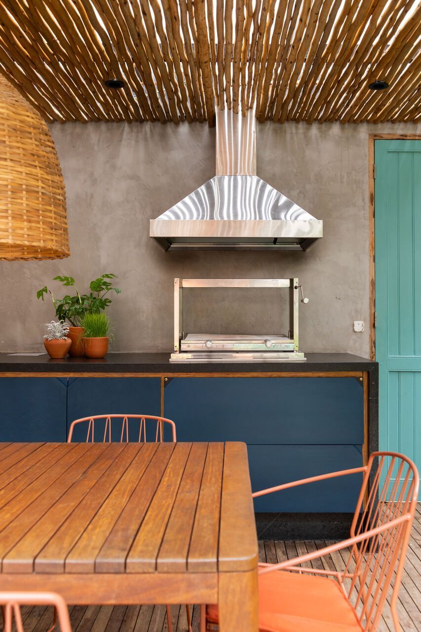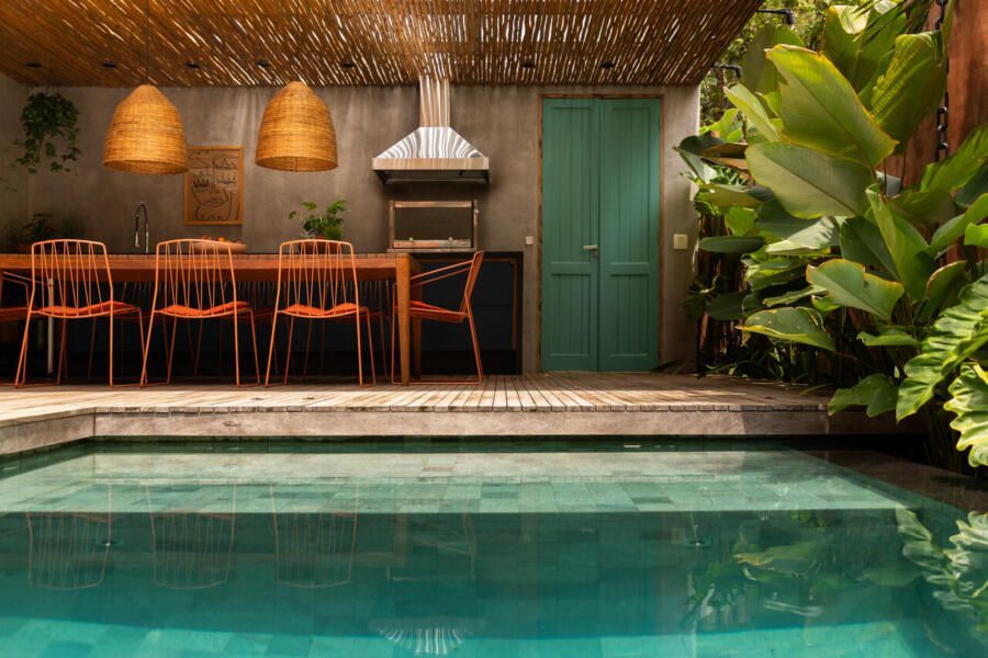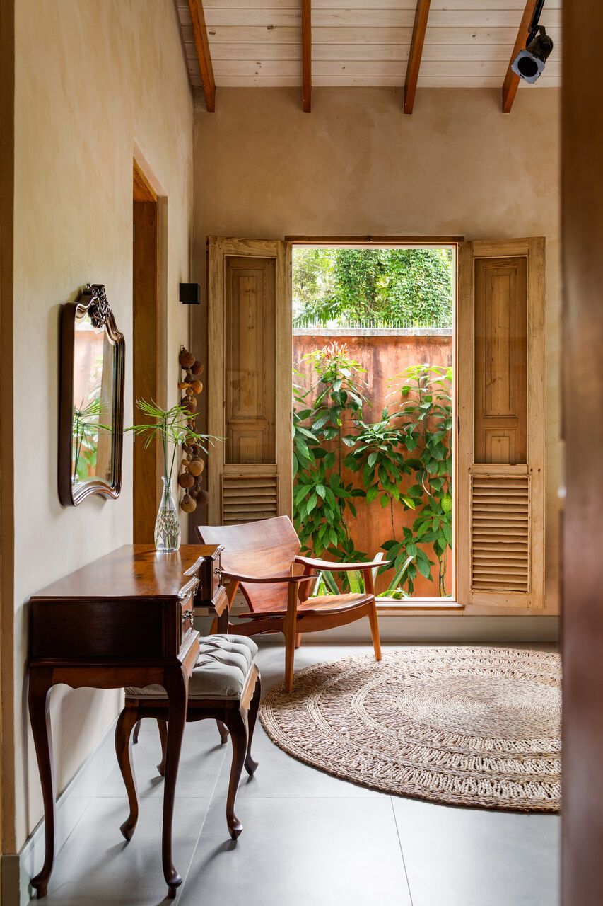A materialidade do projeto é uma homenagem às texturas naturais e à memória afetiva do litoral. Enquanto o piso de cimento queimado e a marcenaria em tons de freijó e cedro trazem um ar contemporâneo aos interiores, elementos como o pergolado com brise em biriba (eucalipto roliço) filtram o sol e conferem um aspecto rústico e acolhedor. Detalhes como as janelas de demolição em pinho-de-riga e a textura areia nas paredes externas reforçam esse diálogo entre o novo e o tradicional, criando uma estética atemporal.