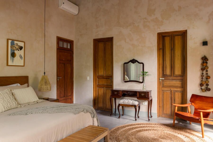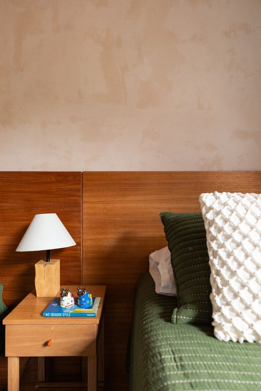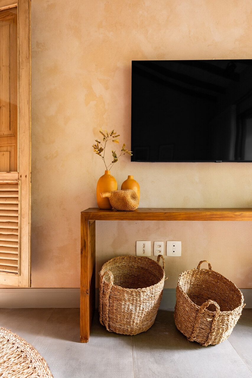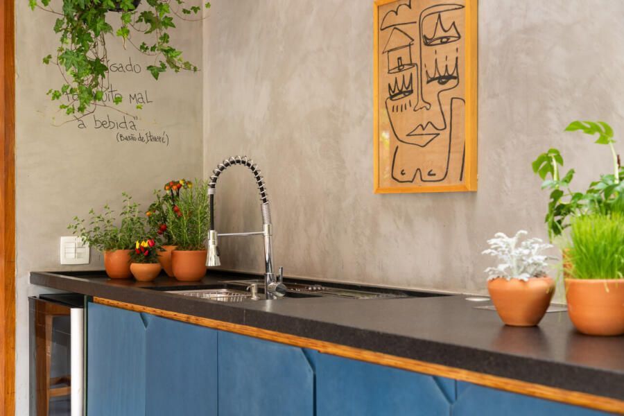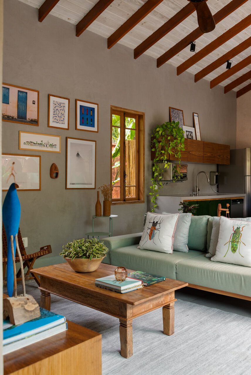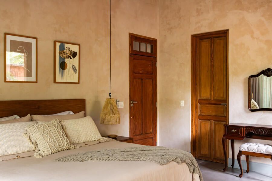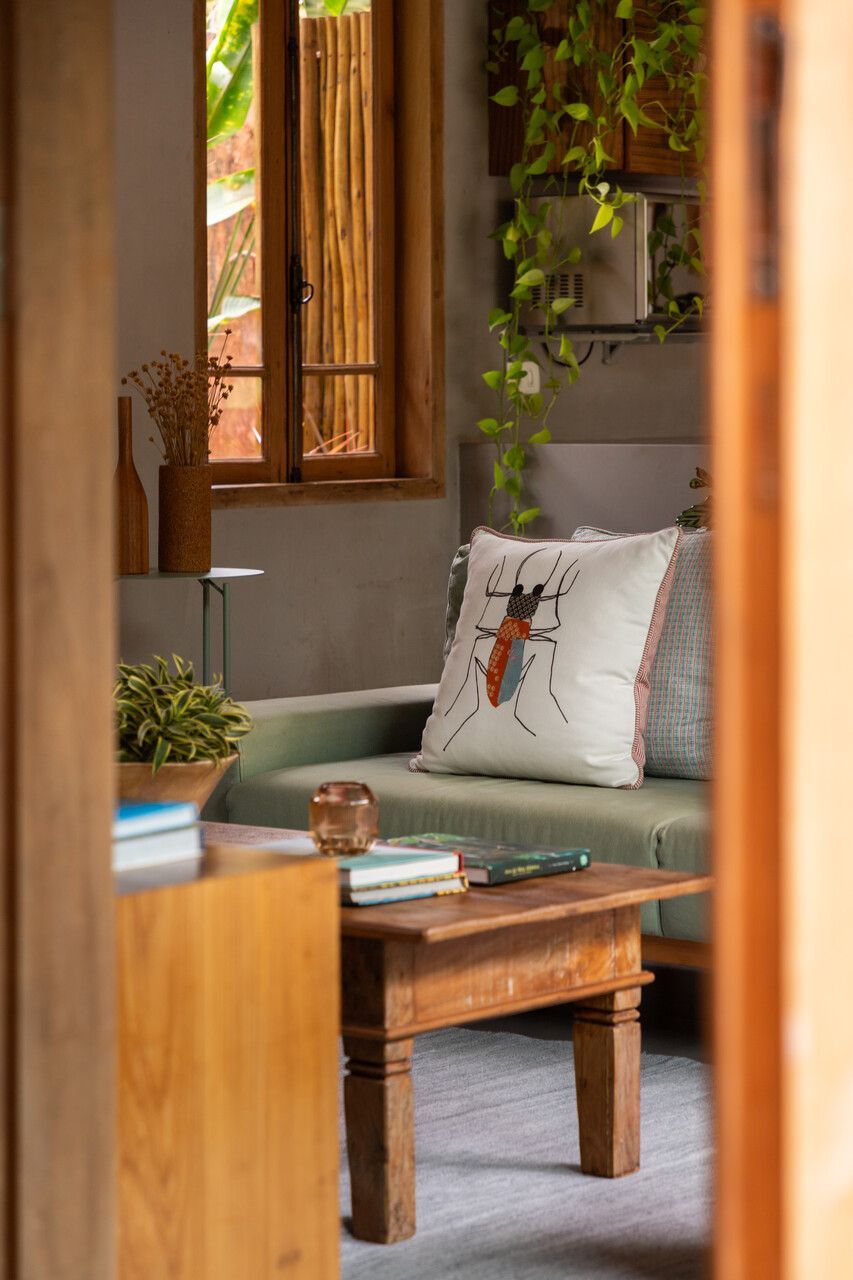 A materialidade do projeto é uma homenagem às texturas naturais e à memória afetiva do litoral. Enquanto o piso de cimento queimado e a marcenaria em tons de freijó e cedro trazem um ar contemporâneo aos interiores, elementos como o pergolado com brise em biriba (eucalipto roliço) filtram o sol e conferem um aspecto rústico e acolhedor. Detalhes como as janelas de demolição em pinho-de-riga e a textura areia nas paredes externas reforçam esse diálogo entre o novo e o tradicional, criando uma estética atemporal.