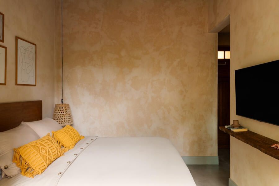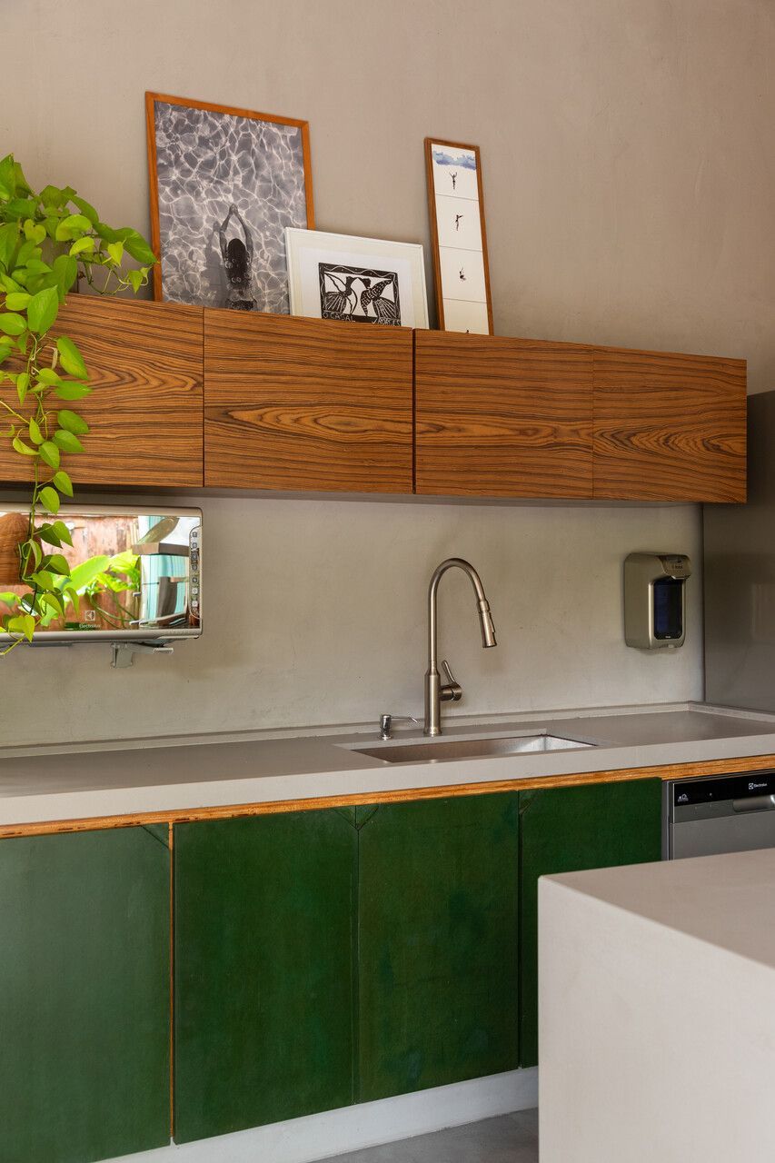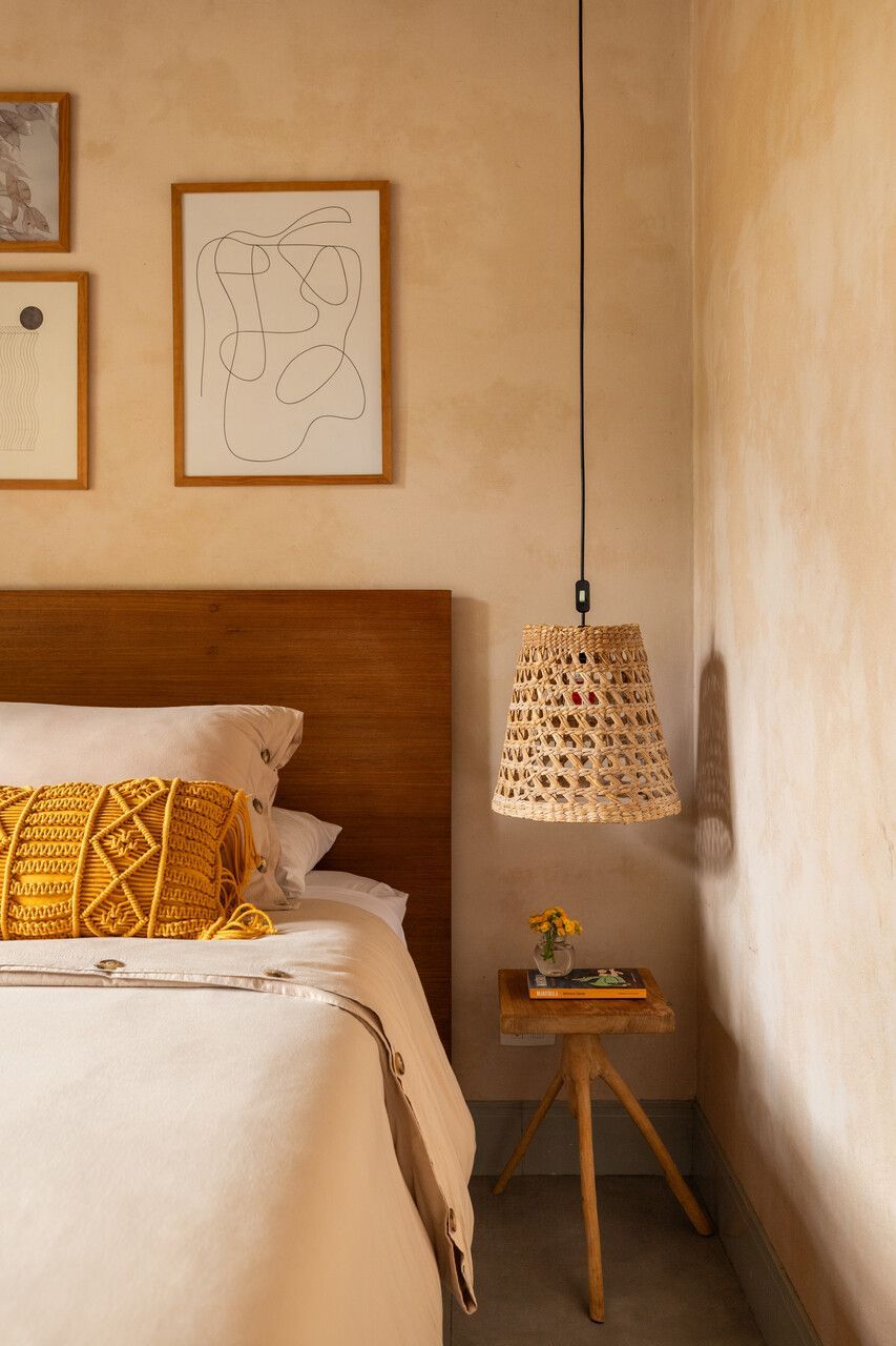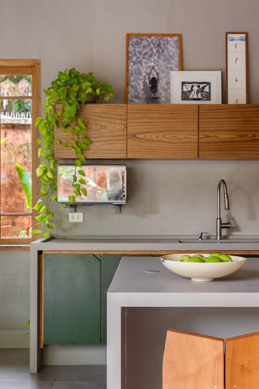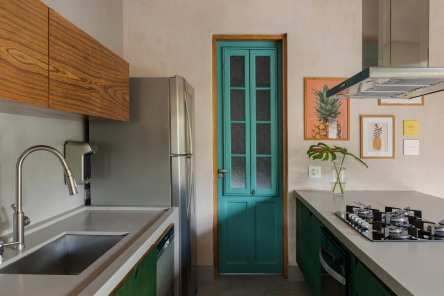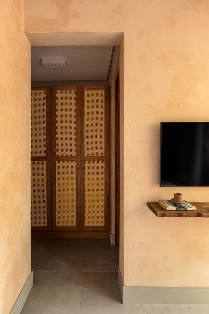 A materialidade do projeto é uma homenagem às texturas naturais e à memória afetiva do litoral. Enquanto o piso de cimento queimado e a marcenaria em tons de freijó e cedro trazem um ar contemporâneo aos interiores, elementos como o pergolado com brise em biriba (eucalipto roliço) filtram o sol e conferem um aspecto rústico e acolhedor. Detalhes como as janelas de demolição em pinho-de-riga e a textura areia nas paredes externas reforçam esse diálogo entre o novo e o tradicional, criando uma estética atemporal.
