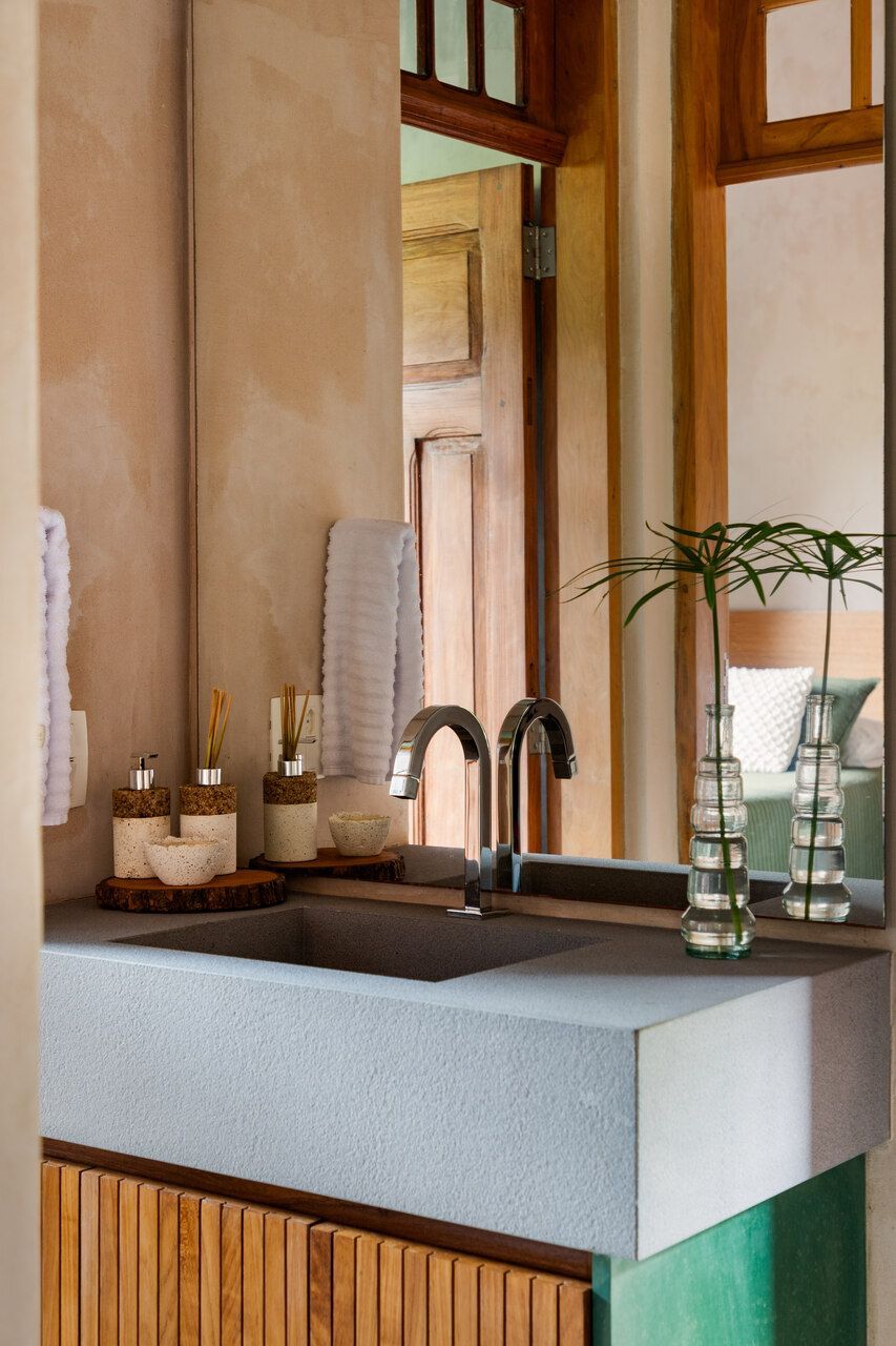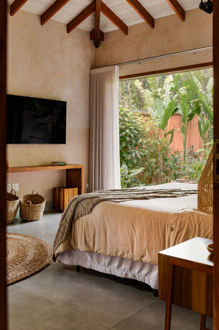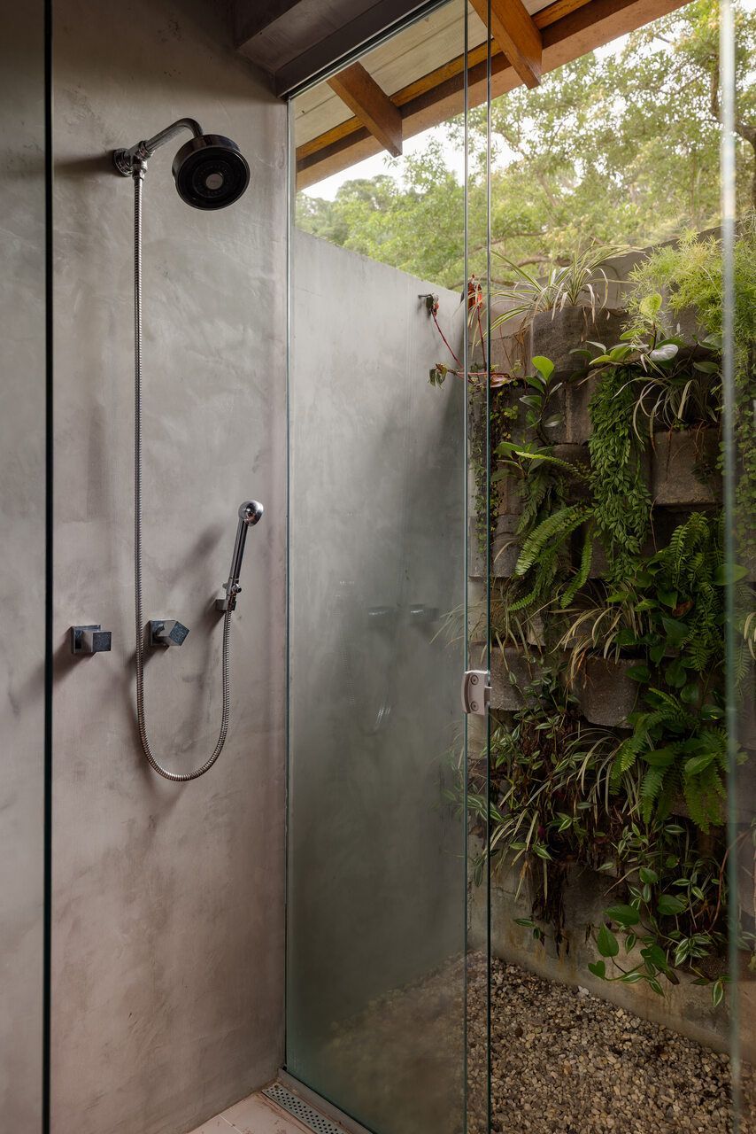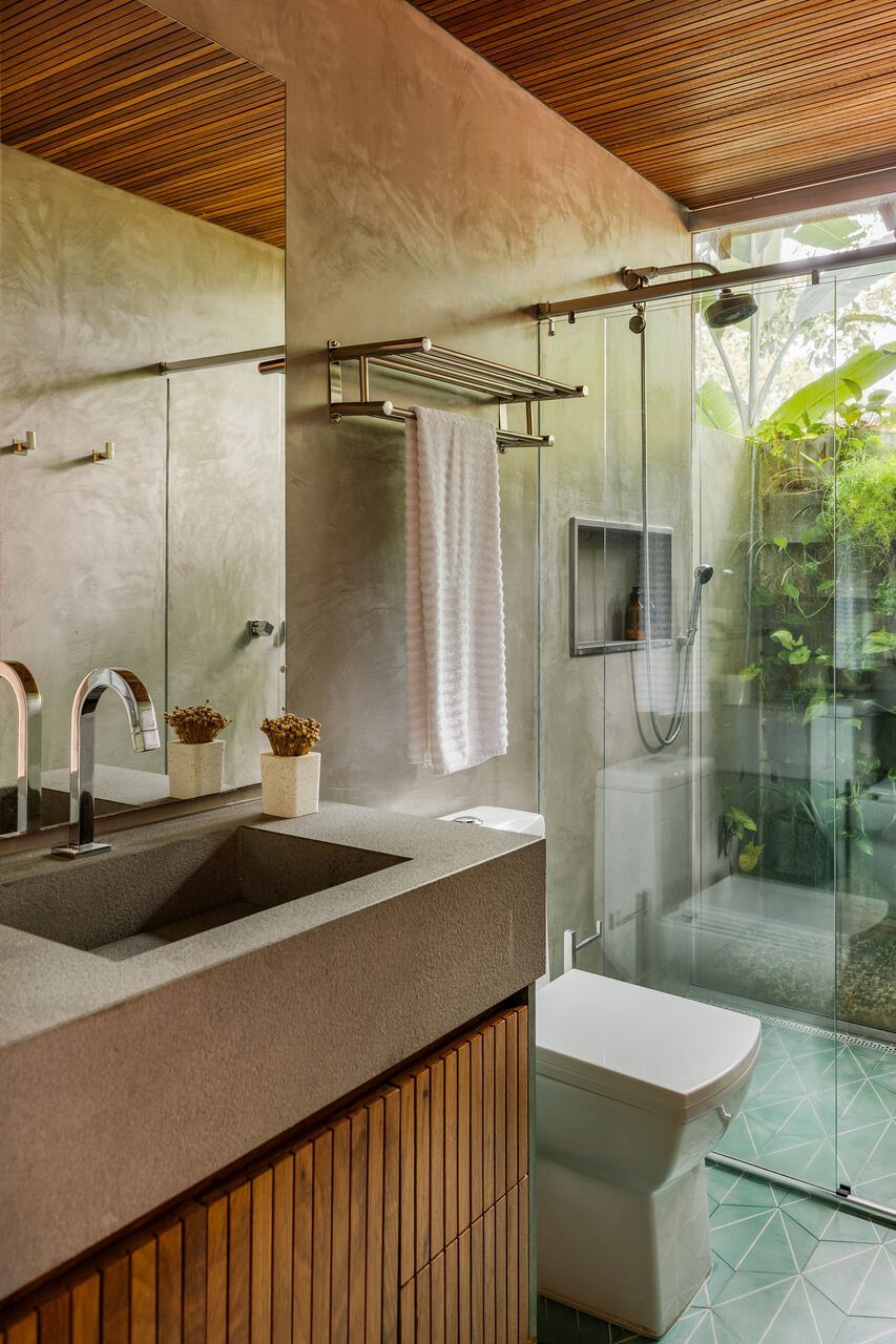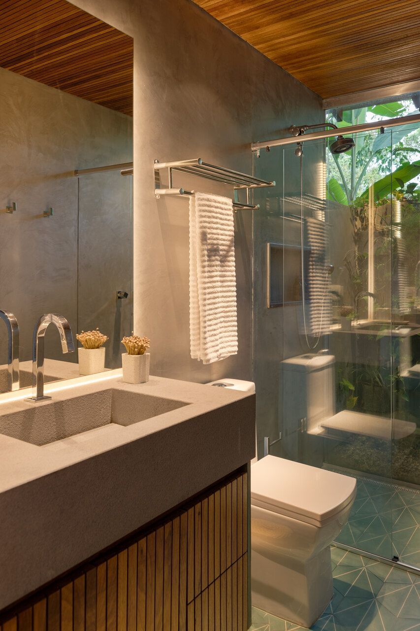 Na área íntima, as três suítes foram desenhadas como santuários de tranquilidade, cada uma com seu próprio deck privativo voltado para a vegetação. Um dos diferenciais técnicos do escritório aparece nos banheiros, que se abrem para jardins exclusivos, permitindo que a ventilação e a iluminação zenital entrem livremente sem comprometer a privacidade. O uso de ladrilhos hidráulicos nos pisos desses ambientes traz um toque artesanal que complementa a proposta de uma casa feita para ser sentida.