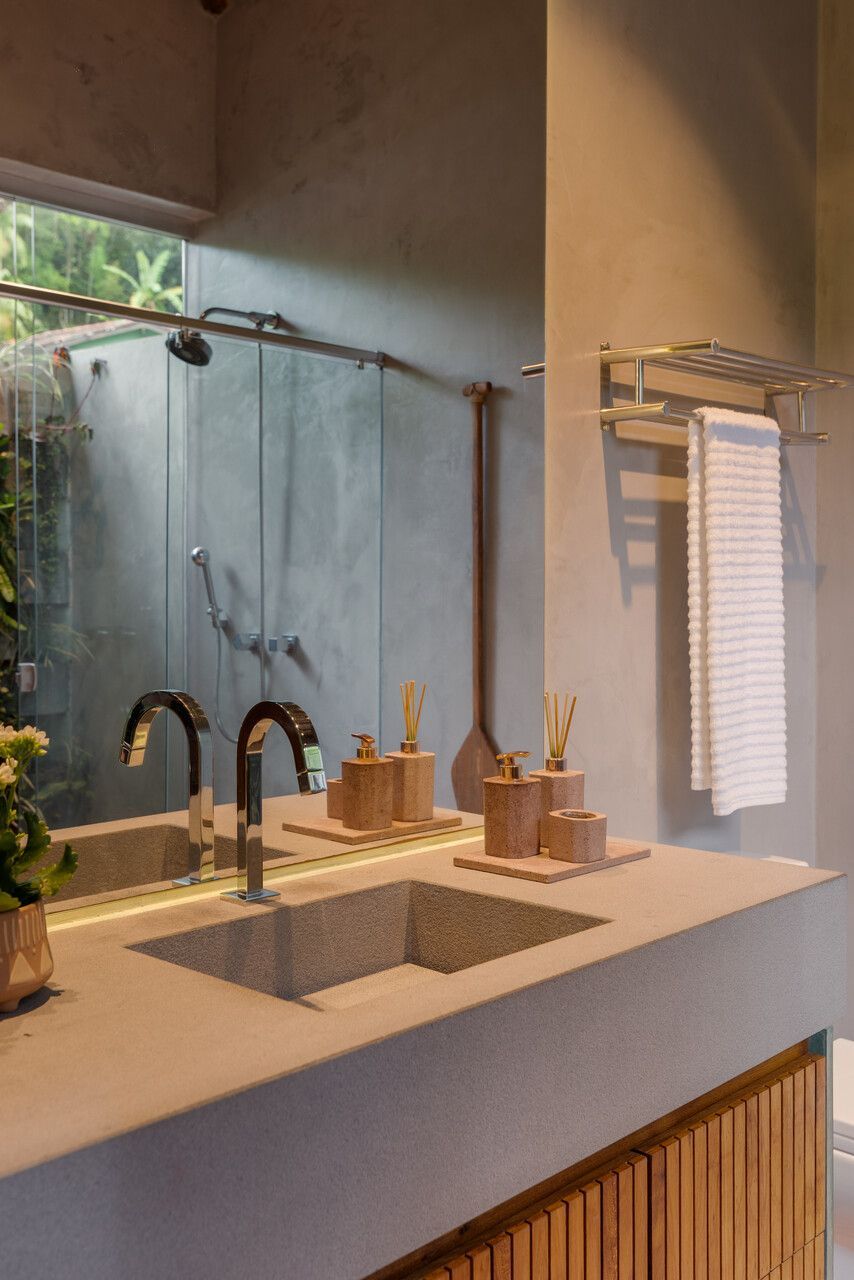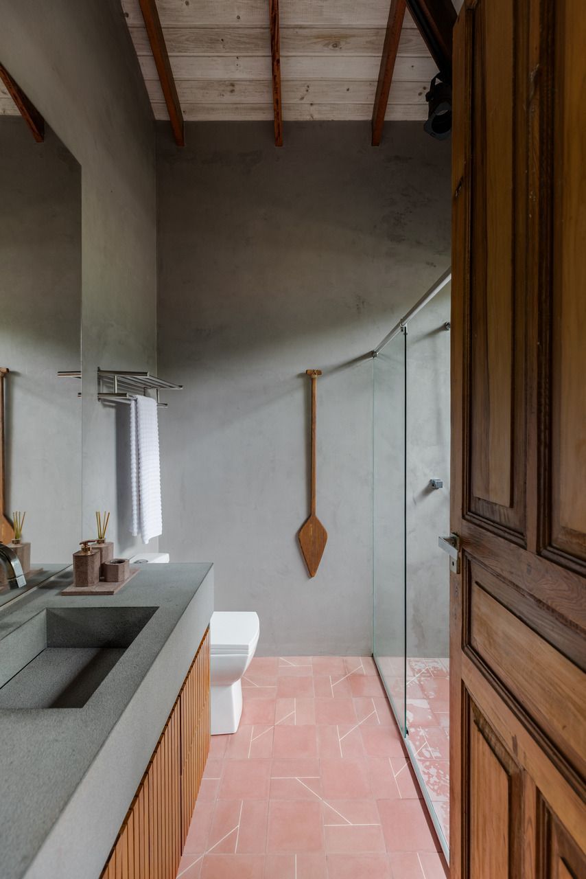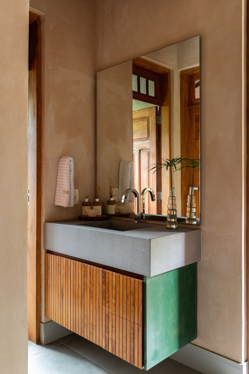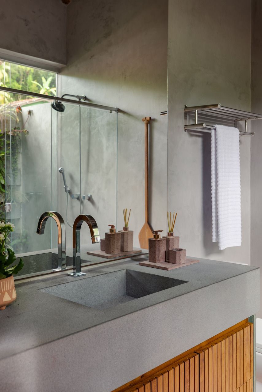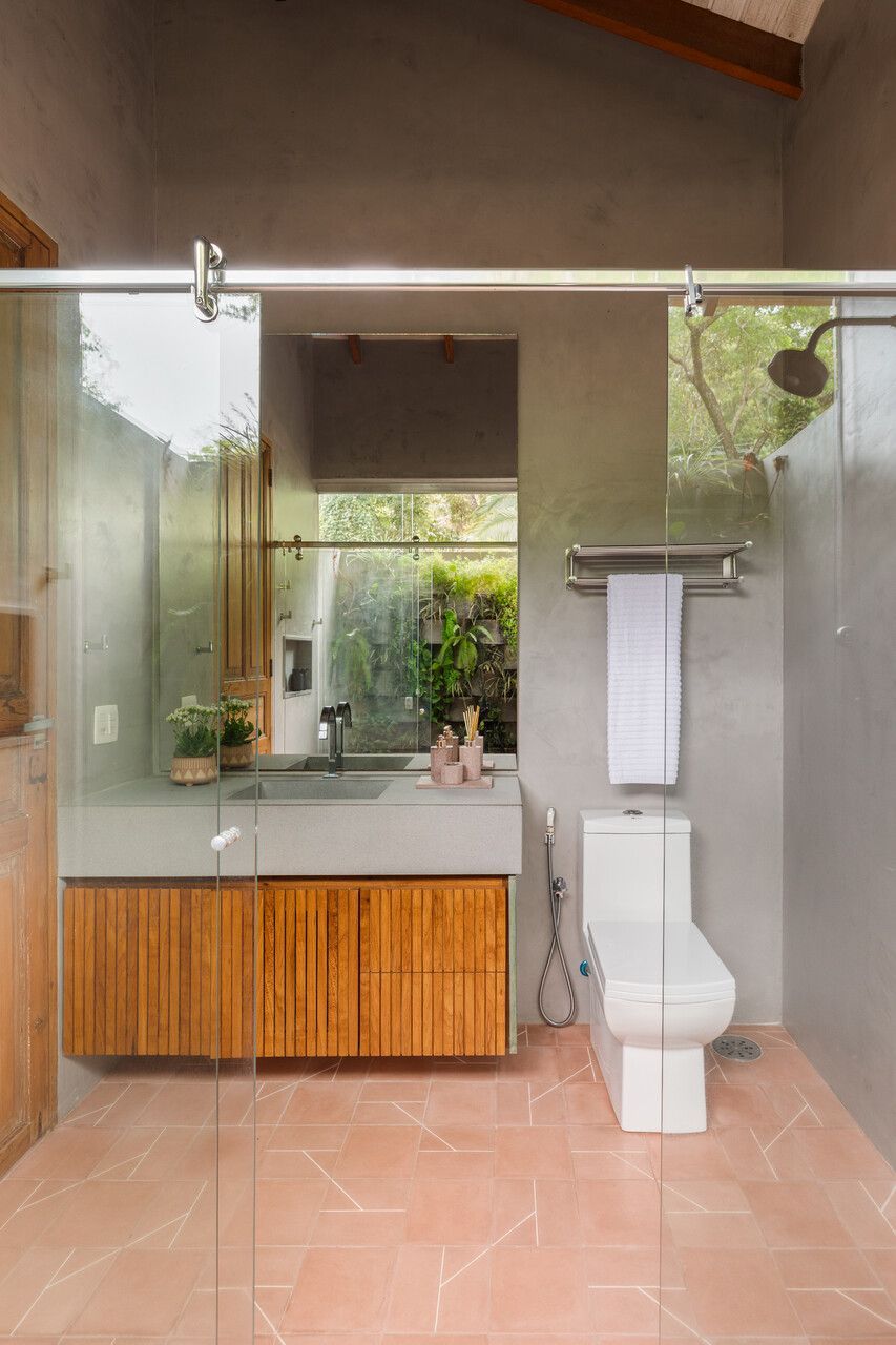 Na área íntima, as três suítes foram desenhadas como santuários de tranquilidade, cada uma com seu próprio deck privativo voltado para a vegetação. Um dos diferenciais técnicos do escritório aparece nos banheiros, que se abrem para jardins exclusivos, permitindo que a ventilação e a iluminação zenital entrem livremente sem comprometer a privacidade. O uso de ladrilhos hidráulicos nos pisos desses ambientes traz um toque artesanal que complementa a proposta de uma casa feita para ser sentida.