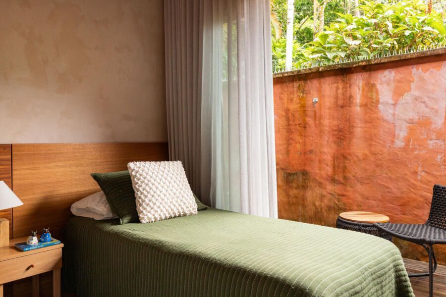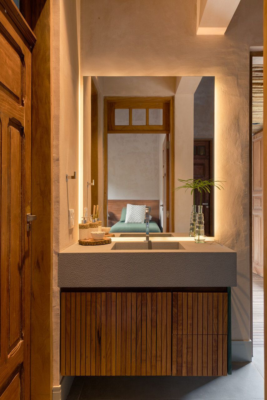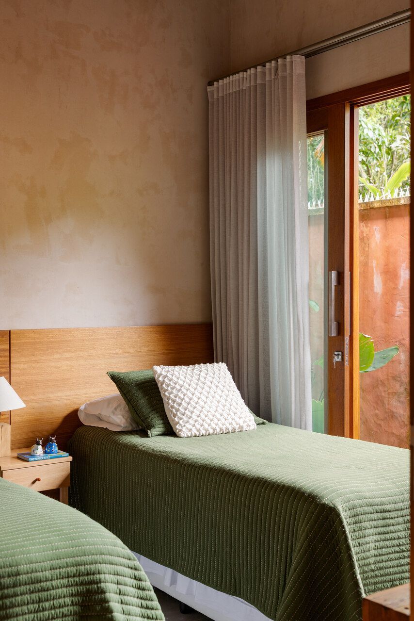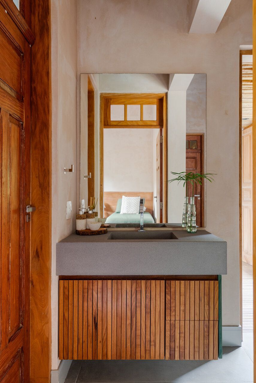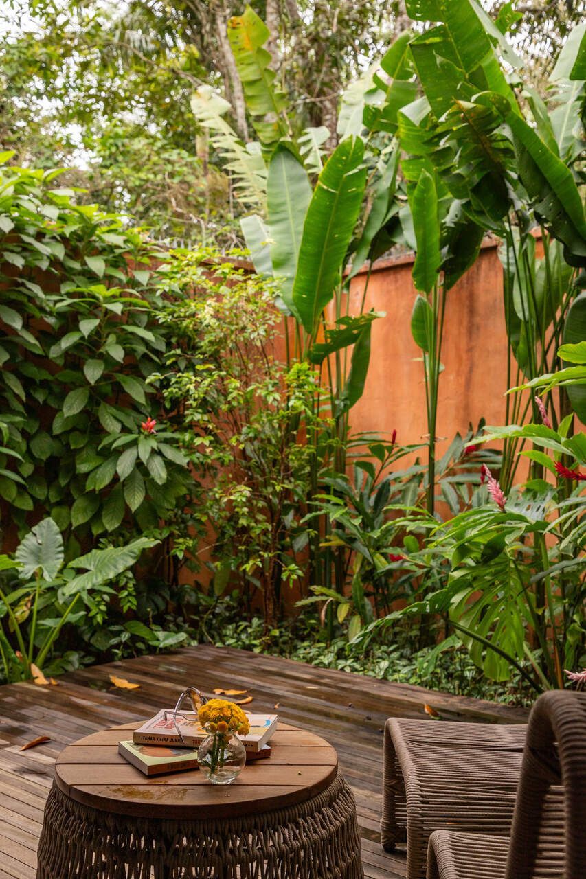 Na área íntima, as três suítes foram desenhadas como santuários de tranquilidade, cada uma com seu próprio deck privativo voltado para a vegetação. Um dos diferenciais técnicos do escritório aparece nos banheiros, que se abrem para jardins exclusivos, permitindo que a ventilação e a iluminação zenital entrem livremente sem comprometer a privacidade. O uso de ladrilhos hidráulicos nos pisos desses ambientes traz um toque artesanal que complementa a proposta de uma casa feita para ser sentida.