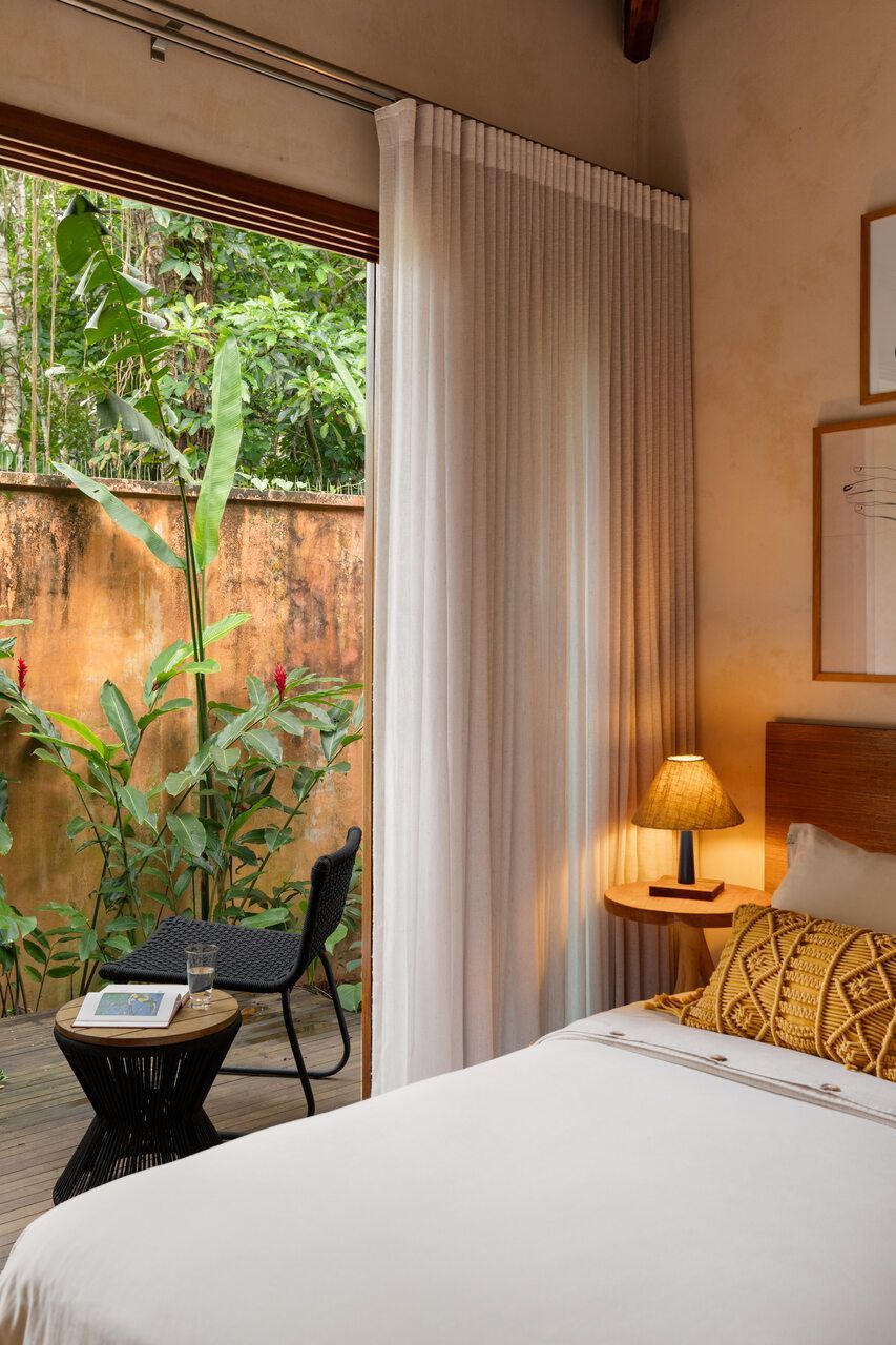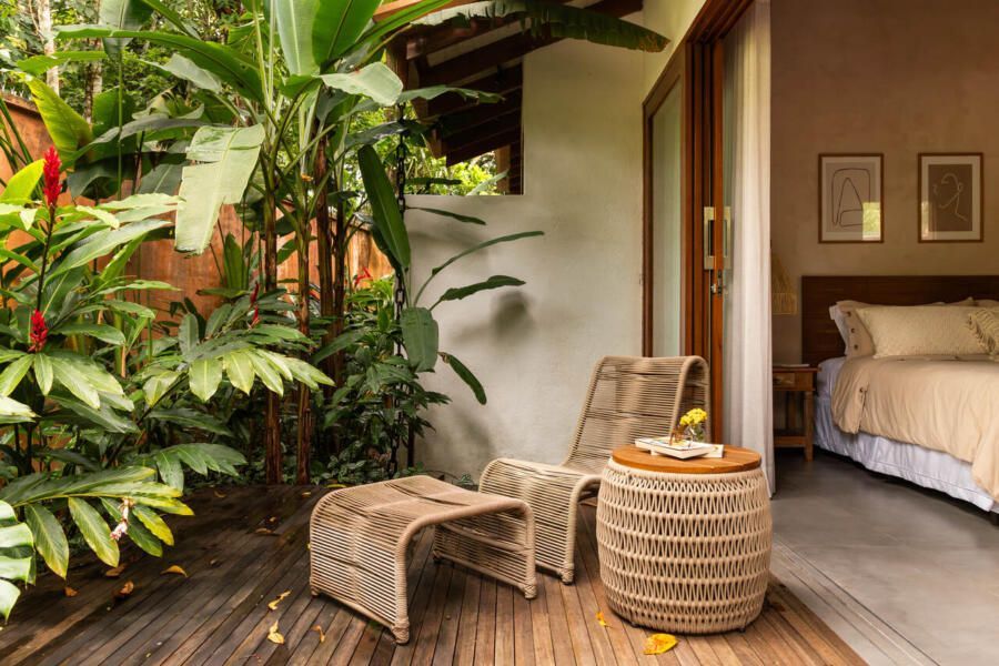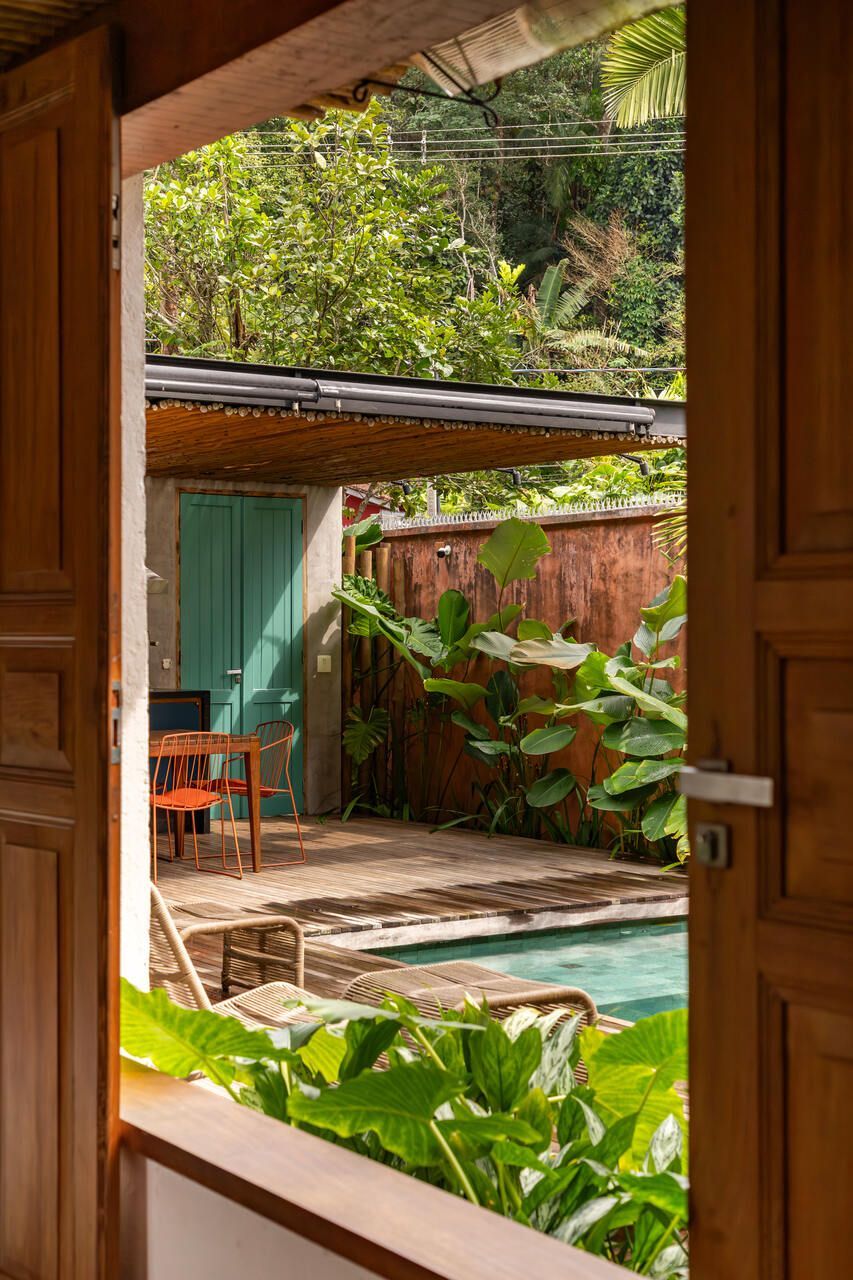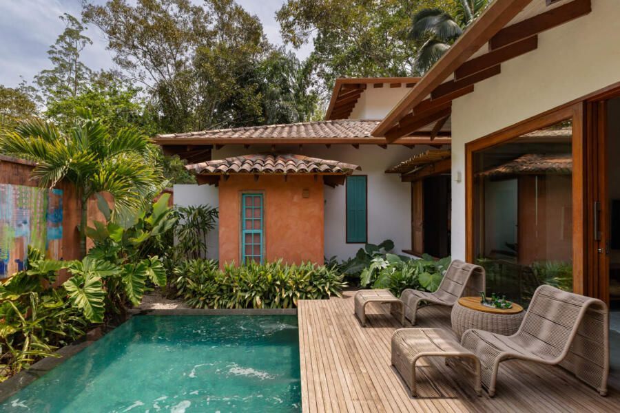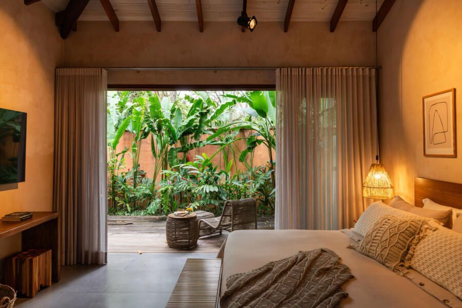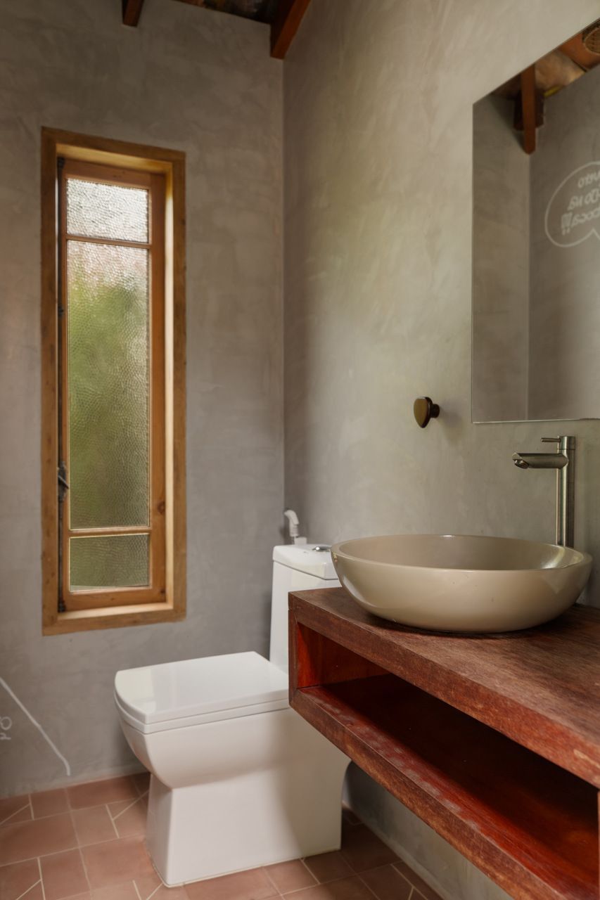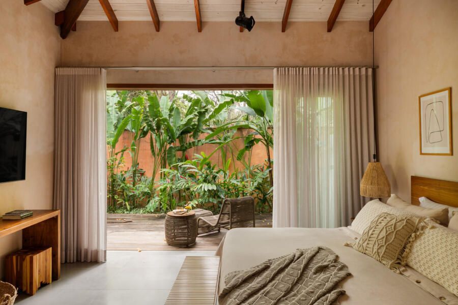 Na área íntima, as três suítes foram desenhadas como santuários de tranquilidade, cada uma com seu próprio deck privativo voltado para a vegetação. Um dos diferenciais técnicos do escritório aparece nos banheiros, que se abrem para jardins exclusivos, permitindo que a ventilação e a iluminação zenital entrem livremente sem comprometer a privacidade. O uso de ladrilhos hidráulicos nos pisos desses ambientes traz um toque artesanal que complementa a proposta de uma casa feita para ser sentida.