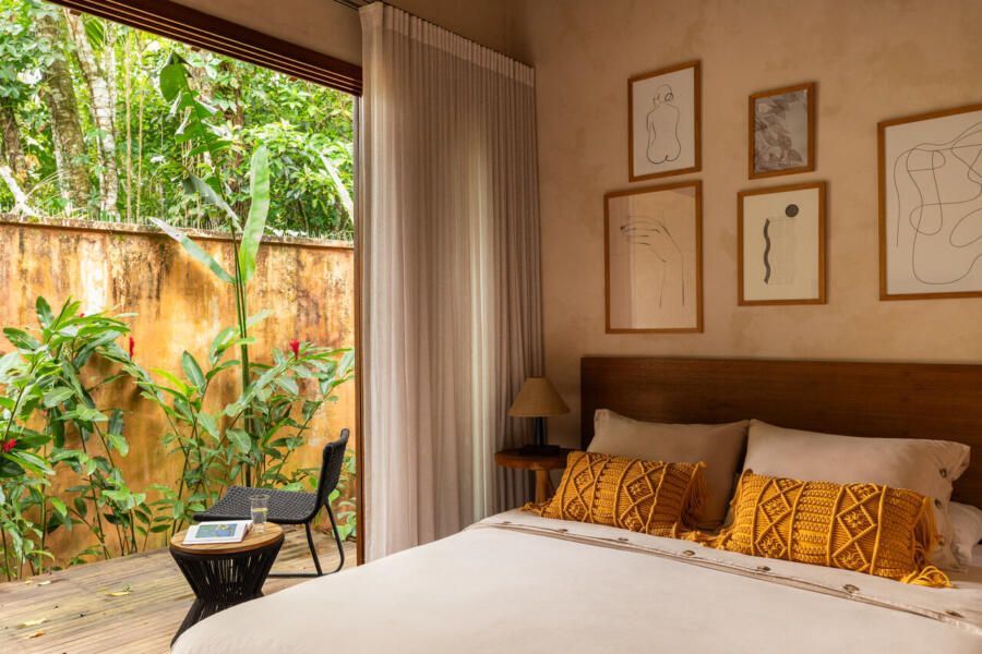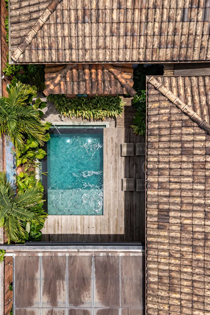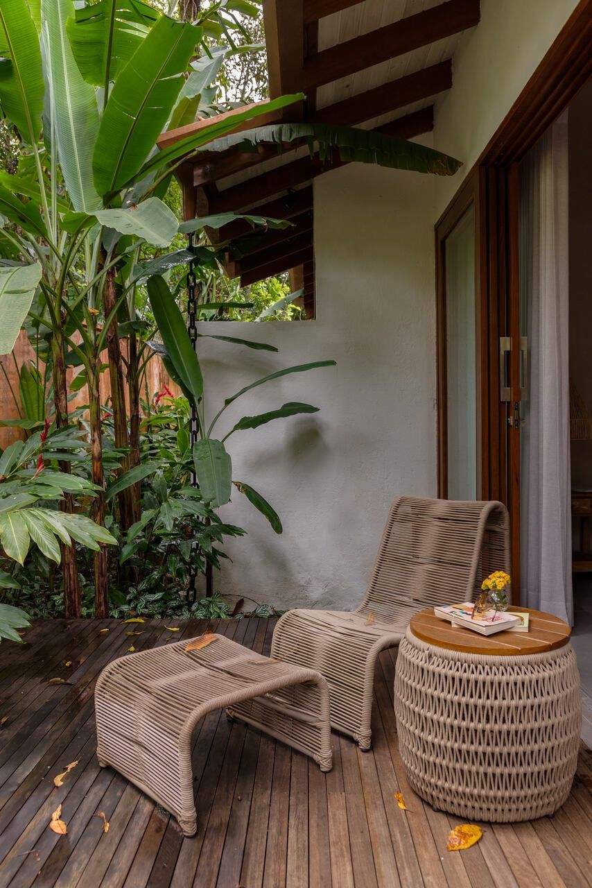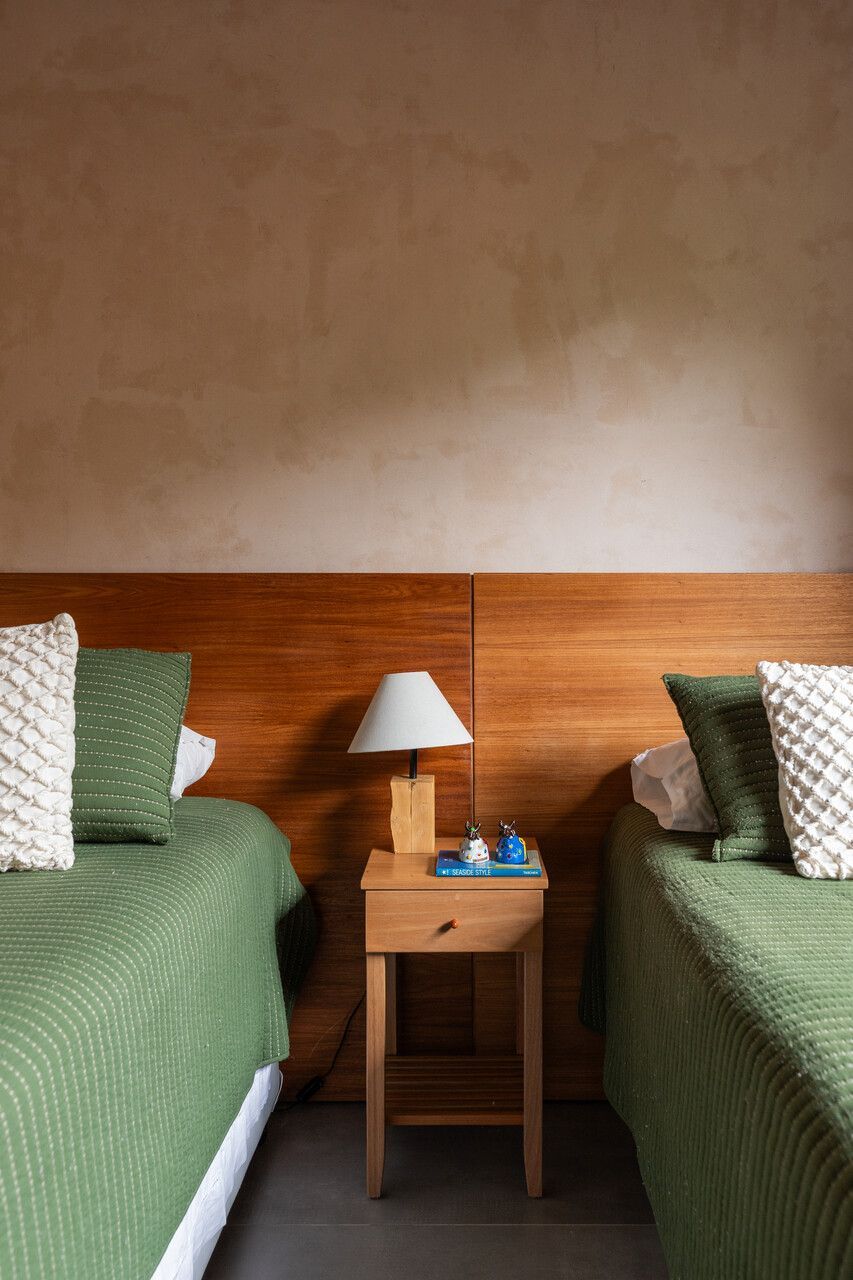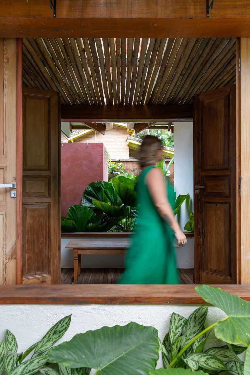 Na área íntima, as três suítes foram desenhadas como santuários de tranquilidade, cada uma com seu próprio deck privativo voltado para a vegetação. Um dos diferenciais técnicos do escritório aparece nos banheiros, que se abrem para jardins exclusivos, permitindo que a ventilação e a iluminação zenital entrem livremente sem comprometer a privacidade. O uso de ladrilhos hidráulicos nos pisos desses ambientes traz um toque artesanal que complementa a proposta de uma casa feita para ser sentida.