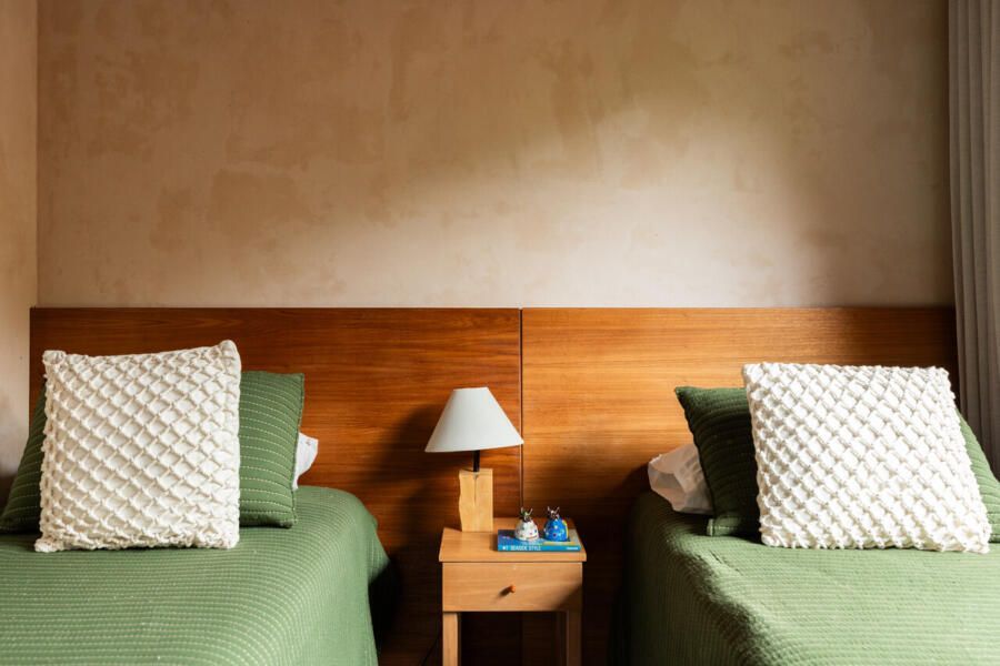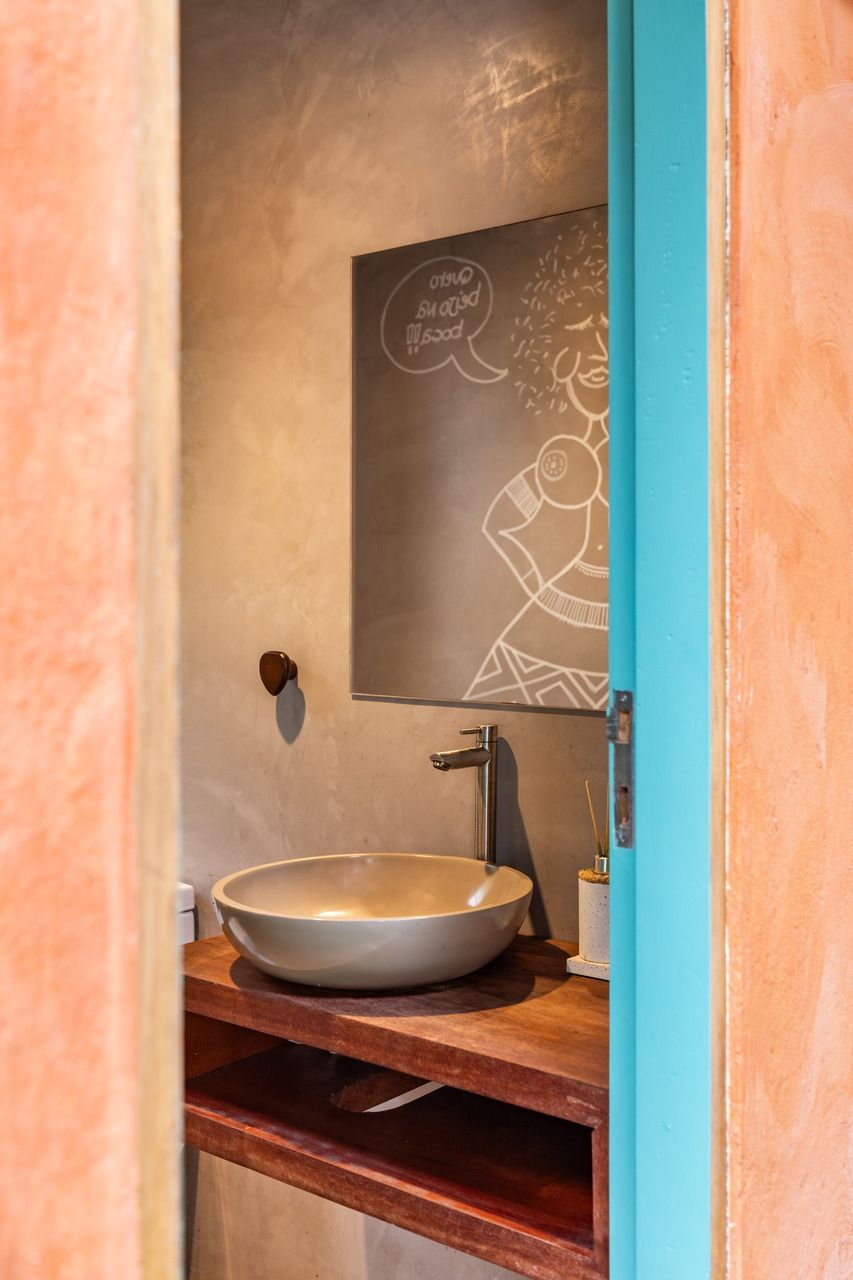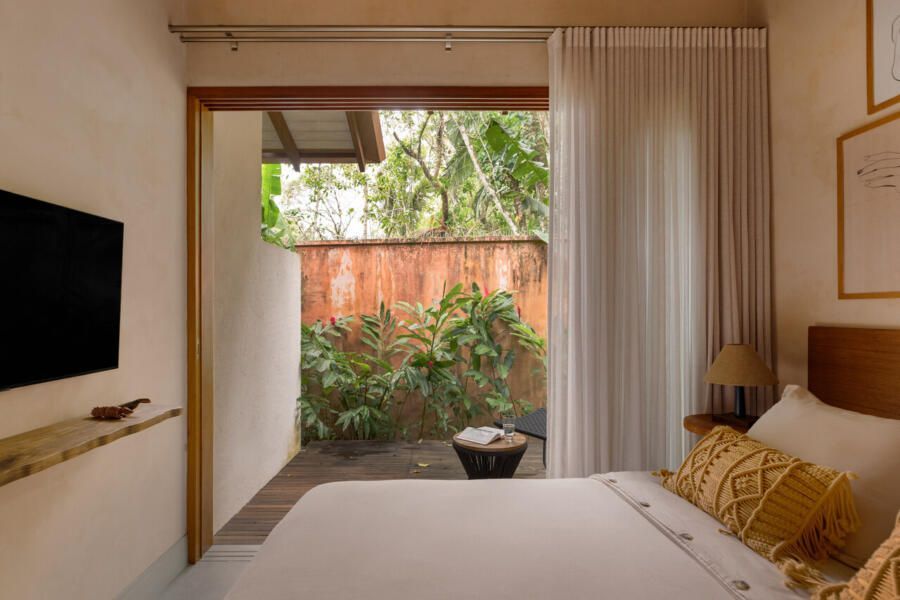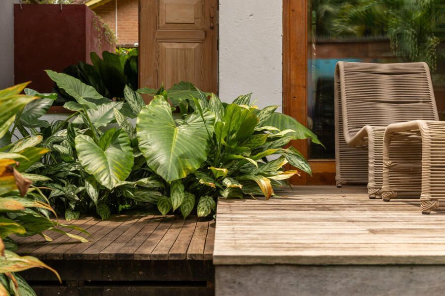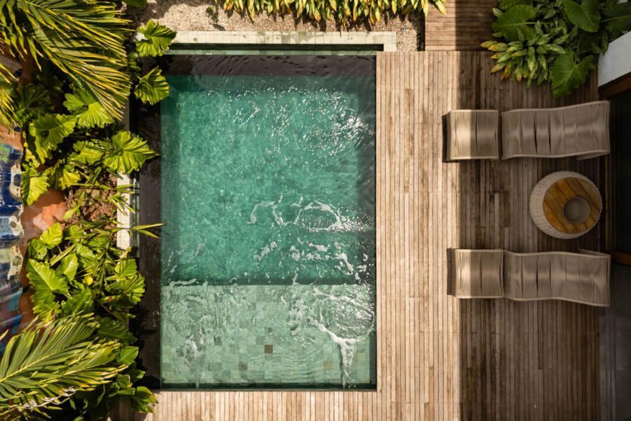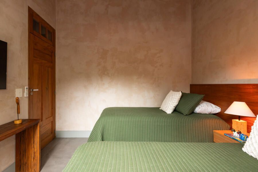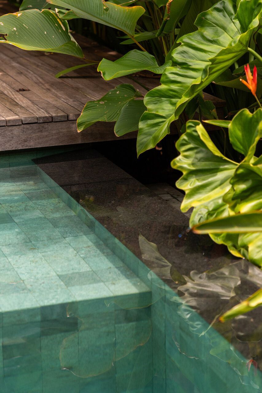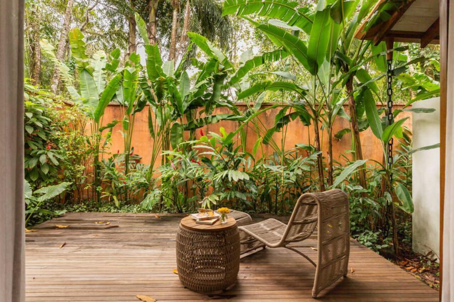 Na área íntima, as três suítes foram desenhadas como santuários de tranquilidade, cada uma com seu próprio deck privativo voltado para a vegetação. Um dos diferenciais técnicos do escritório aparece nos banheiros, que se abrem para jardins exclusivos, permitindo que a ventilação e a iluminação zenital entrem livremente sem comprometer a privacidade. O uso de ladrilhos hidráulicos nos pisos desses ambientes traz um toque artesanal que complementa a proposta de uma casa feita para ser sentida.