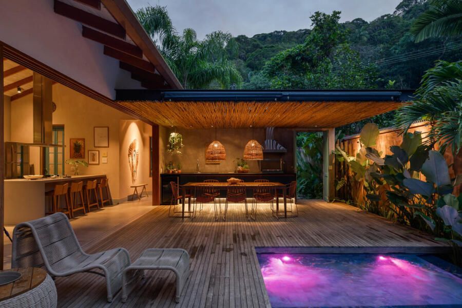 O paisagismo tropical, que abraça toda a casa, funciona como uma barreira natural de frescor e privacidade, sendo parte indissociável da arquitetura. O projeto luminotécnico foi planejado para, ao cair da noite, destacar as texturas das pedras e madeiras, criando uma atmosfera intimista que valoriza as formas da residência. Cada detalhe foi pensado para que a casa parecesse pertencer ao lugar desde sempre, respeitando o contexto da mata e o clima litorâneo.
