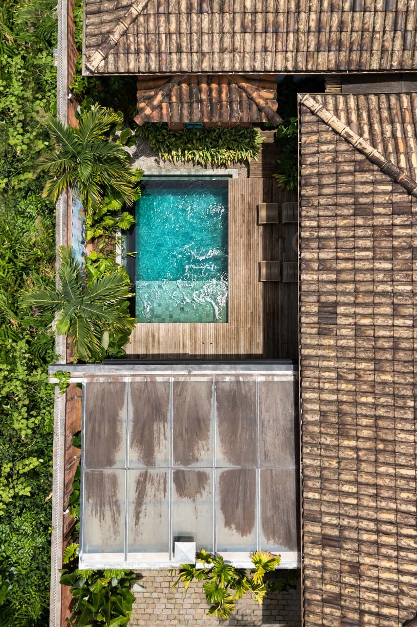 A planta organiza-se de forma fluida através de dois blocos principais que se conectam por uma passarela coberta e aberta ao jardim. Essa solução não apenas separa as áreas sociais e íntimas, como transforma o deslocamento interno em uma experiência constante de contato com a natureza. No setor social, a integração é o ponto alto: a sala de TV, a cozinha e a varanda gourmet fundem-se em um único pavilhão de convivência, estendendo-se visualmente até o deck de madeira cumaru e a piscina revestida em pedra hijau.