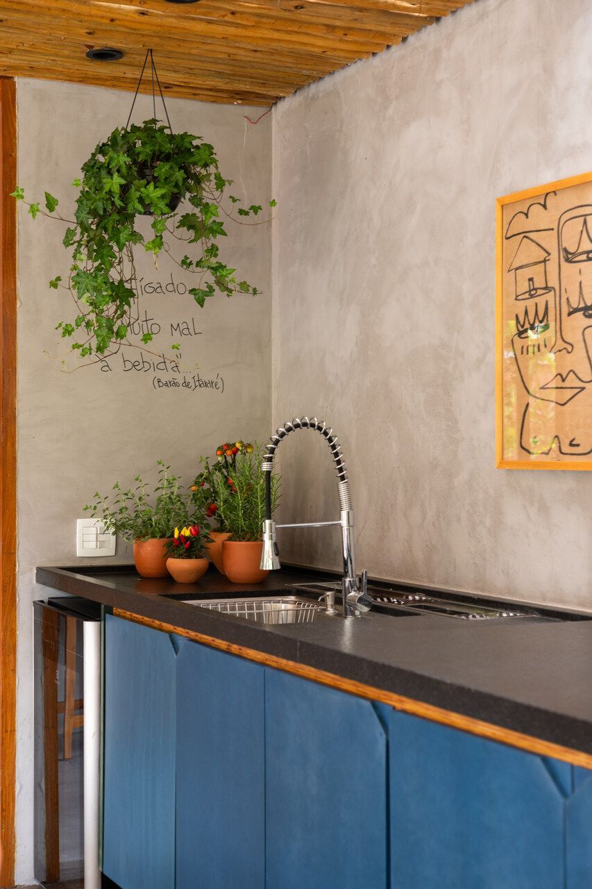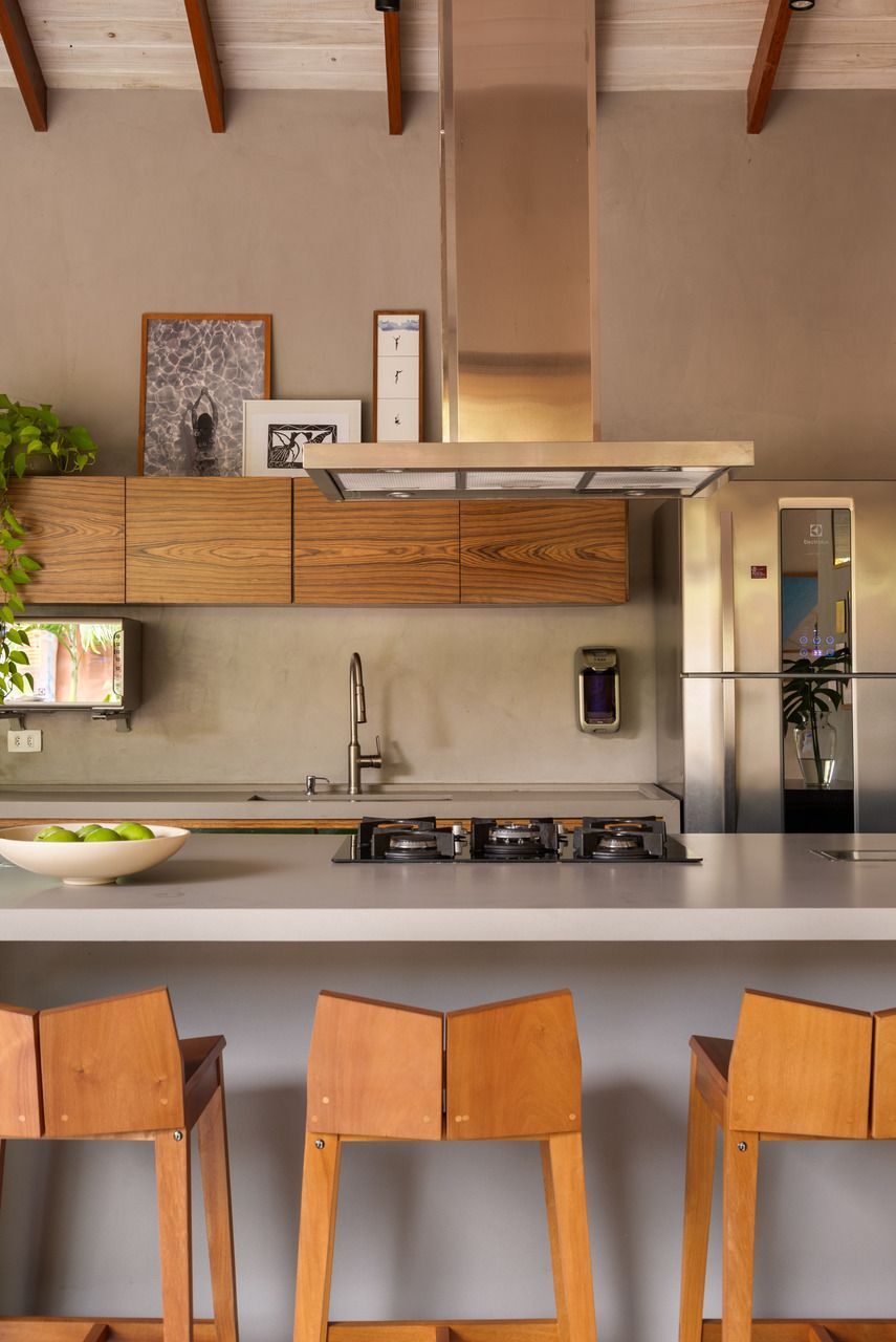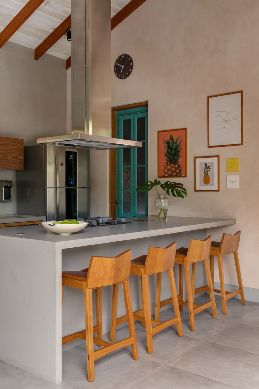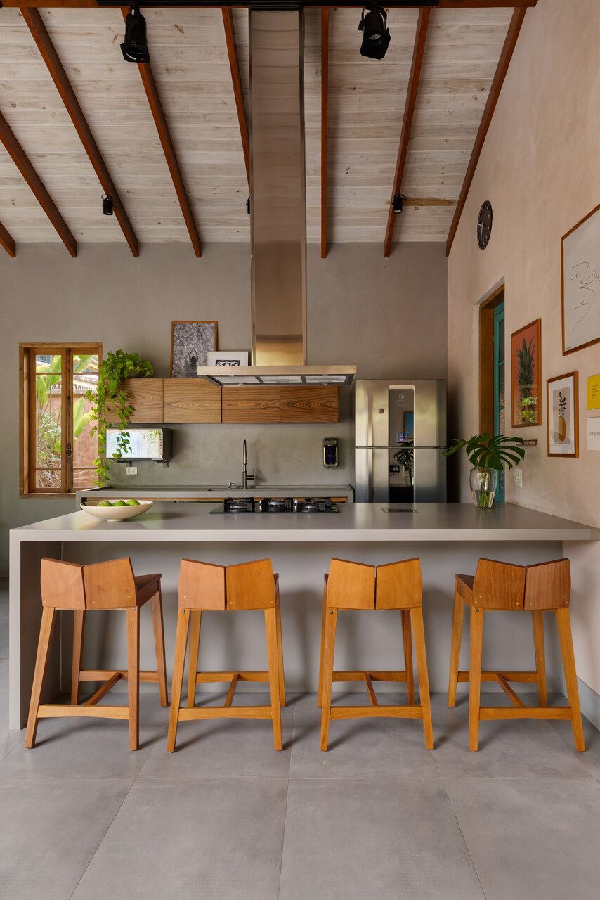 A curadoria de mobiliário e acabamentos equilibra peças de design assinado, como as de Fernando Jaeger, com soluções práticas para uma casa que também funciona como ativo para locação de temporada. Na cozinha e área gourmet, o uso de materiais como Valchromat e tampos em Corian trazem sofisticação técnica, enquanto a automação e o sistema de som embutido garantem o conforto moderno oculto sob a aparência singela da construção.