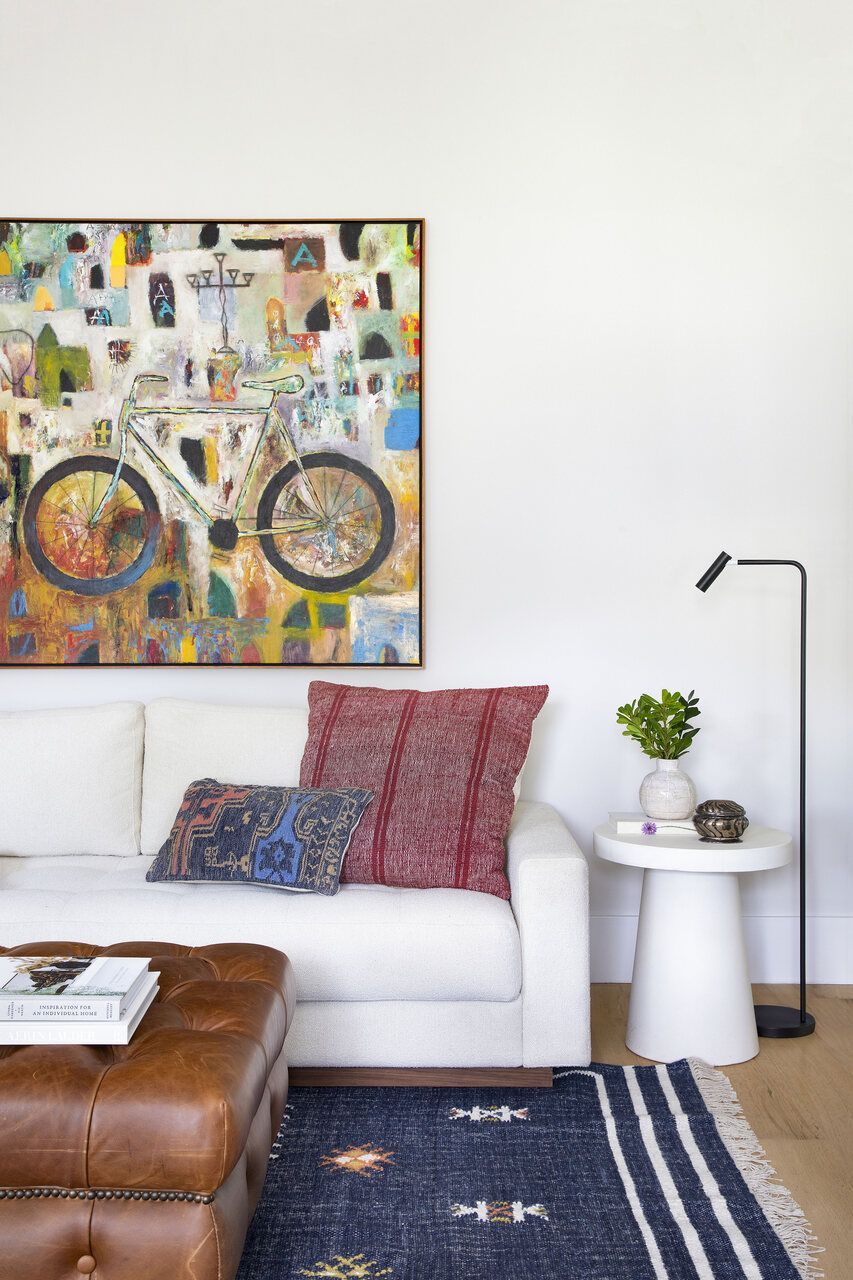 No home office, que também cumpre a função de quarto de hóspedes, o desafio foi aproveitar ao máximo uma área compacta. A solução veio com marcenaria sob medida, uma escrivaninha menor de formato orgânico sobreposta a um móvel baixo sob as janelas e uma nova estante criada a partir da remoção parcial de uma parede. A escrivaninha curva reforça a sensação de fluidez, enquanto o sofá-cama, o pufe de couro e o mix de tapetes ajudam a compor uma atmosfera acolhedora e informal, alinhada ao espírito coastal da casa.