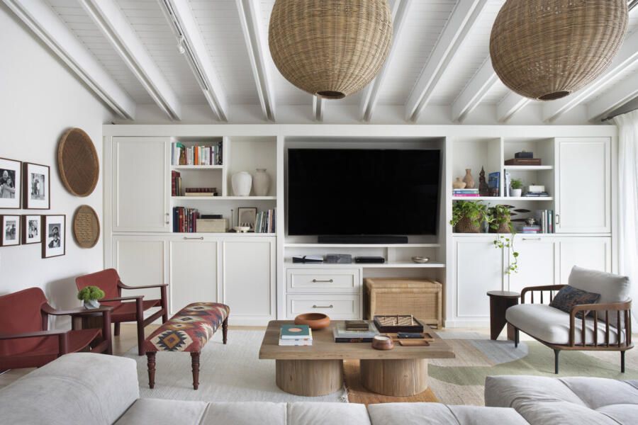O family room foi pensado como um espaço descontraído, onde os filhos adolescentes pudessem receber amigos com conforto. A estante branca existente foi mantida e serviu como ponto de equilíbrio para a nova composição. A paleta cromática segue o conceito coastal de maneira sutil: tons terrosos aparecem nas poltronas e nos acessórios, enquanto nuances suaves de azul e verde surgem no tapete sobreposto, trazendo frescor sem cair na obviedade. A parede atrás das poltronas ganhou uma galeria de fotos da família, adicionando camadas de memória afetiva, enquanto o banco longo com assento em tapete Kilim e a madeira presente na mesa de centro e no baú aquecem o ambiente.