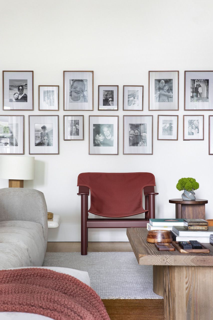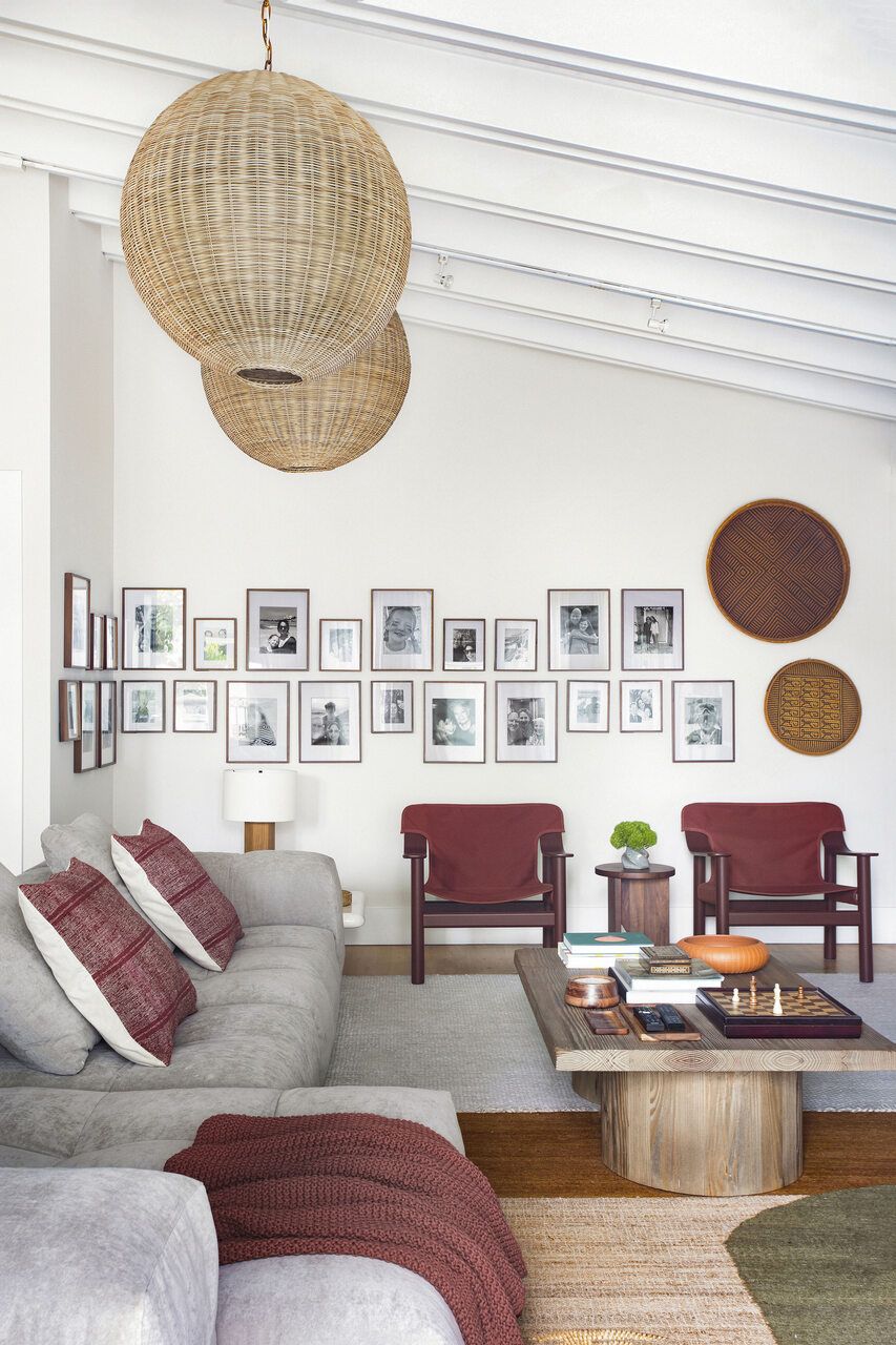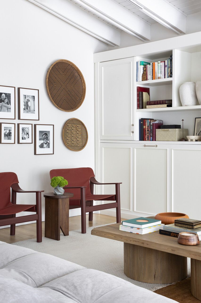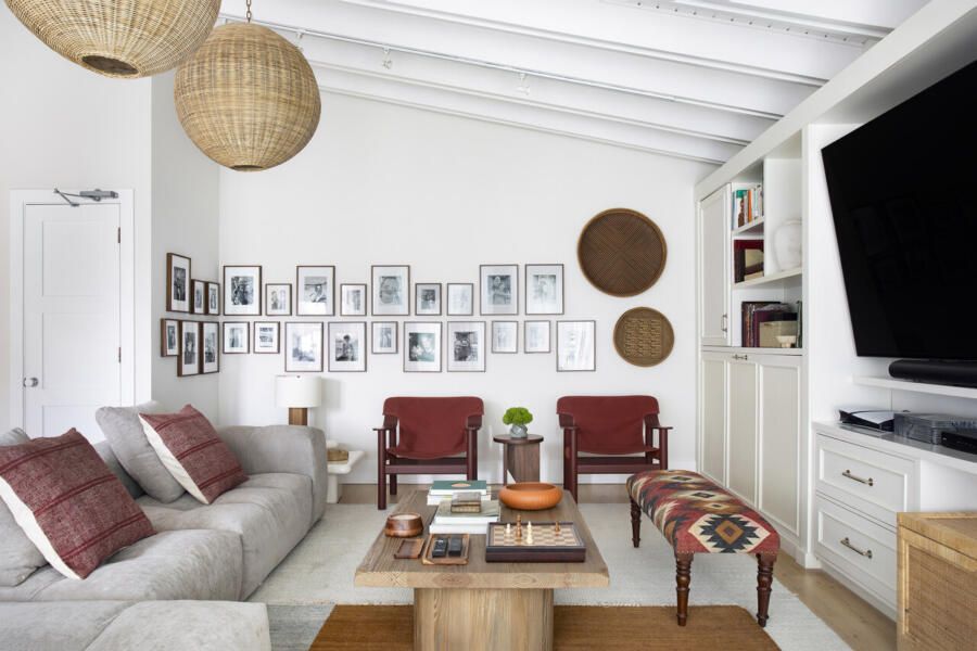 O family room foi pensado como um espaço descontraído, onde os filhos adolescentes pudessem receber amigos com conforto. A estante branca existente foi mantida e serviu como ponto de equilíbrio para a nova composição. A paleta cromática segue o conceito coastal de maneira sutil: tons terrosos aparecem nas poltronas e nos acessórios, enquanto nuances suaves de azul e verde surgem no tapete sobreposto, trazendo frescor sem cair na obviedade. A parede atrás das poltronas ganhou uma galeria de fotos da família, adicionando camadas de memória afetiva, enquanto o banco longo com assento em tapete Kilim e a madeira presente na mesa de centro e no baú aquecem o ambiente.