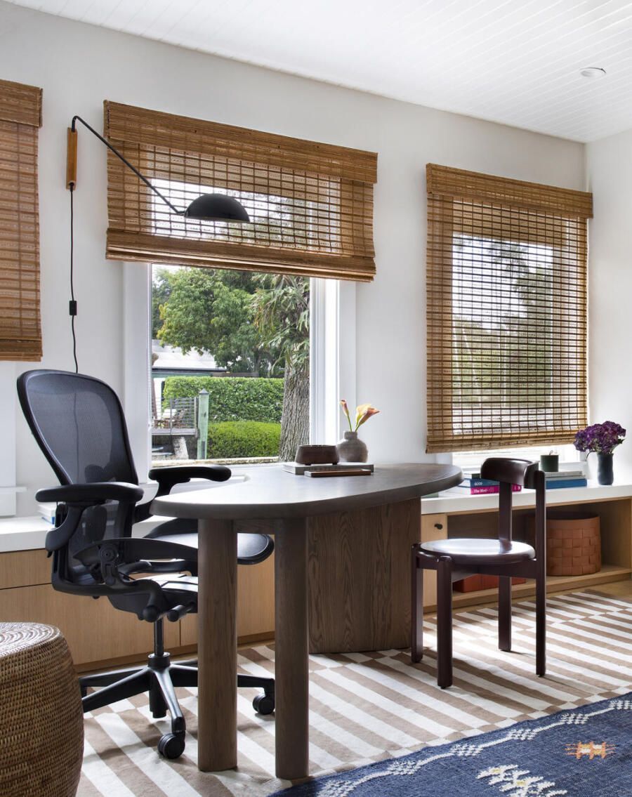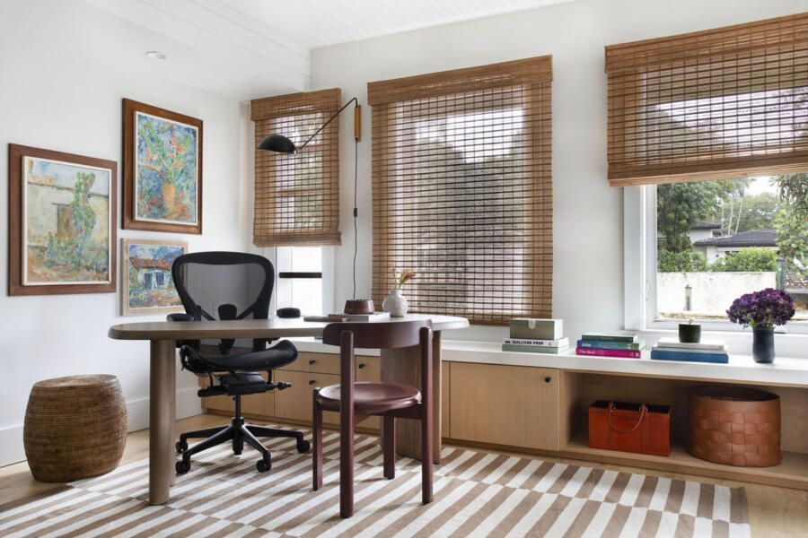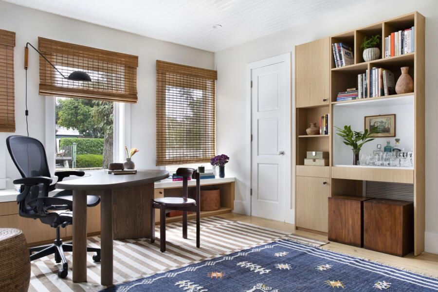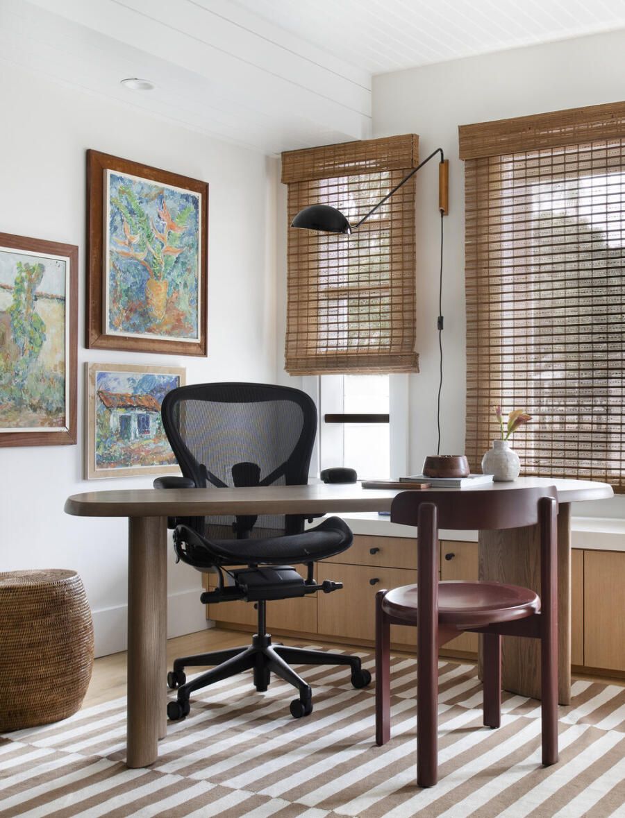 No home office, que também cumpre a função de quarto de hóspedes, o desafio foi aproveitar ao máximo uma área compacta. A solução veio com marcenaria sob medida, uma escrivaninha menor de formato orgânico sobreposta a um móvel baixo sob as janelas e uma nova estante criada a partir da remoção parcial de uma parede. A escrivaninha curva reforça a sensação de fluidez, enquanto o sofá-cama, o pufe de couro e o mix de tapetes ajudam a compor uma atmosfera acolhedora e informal, alinhada ao espírito coastal da casa.