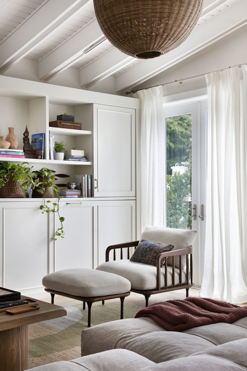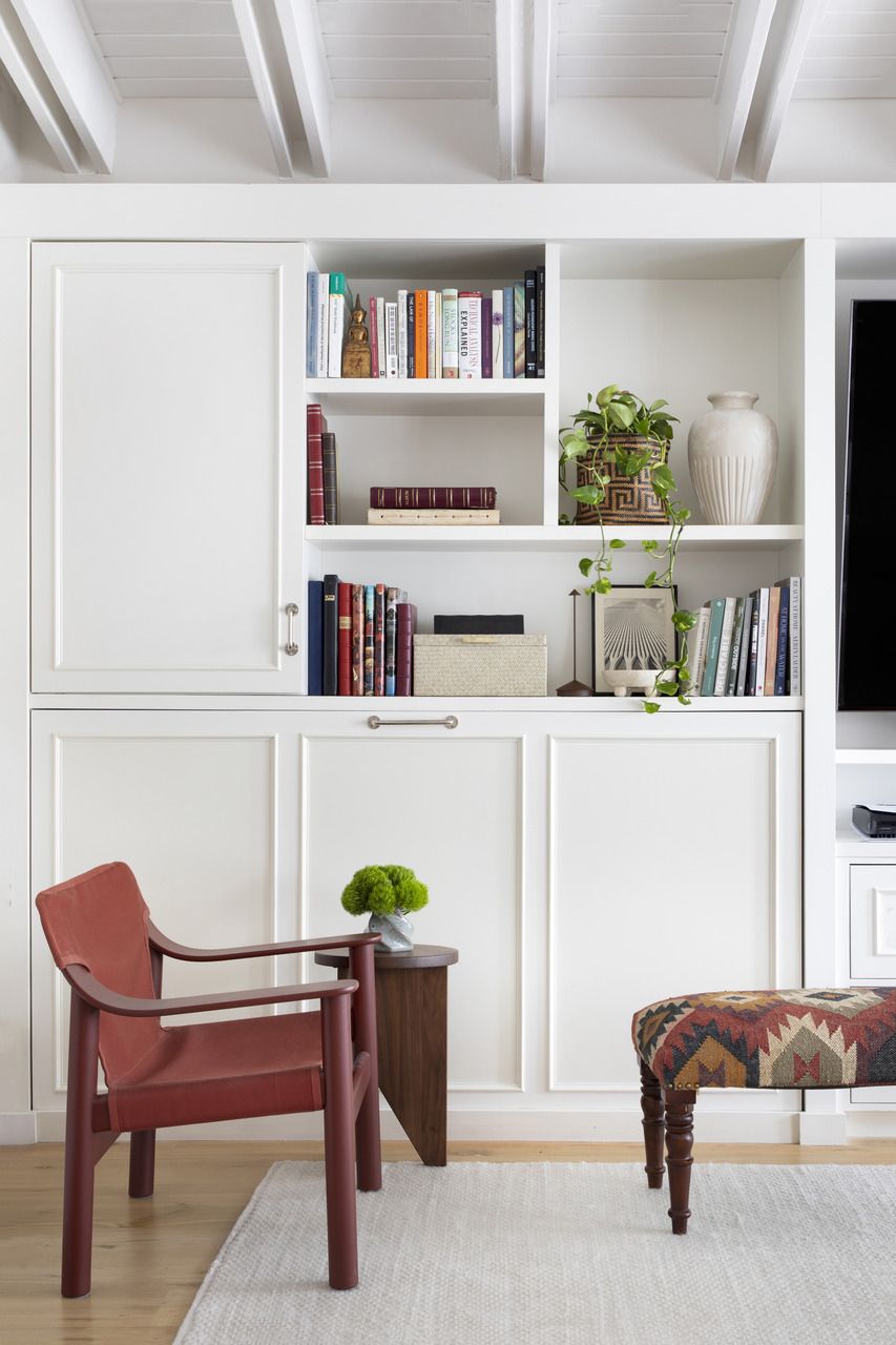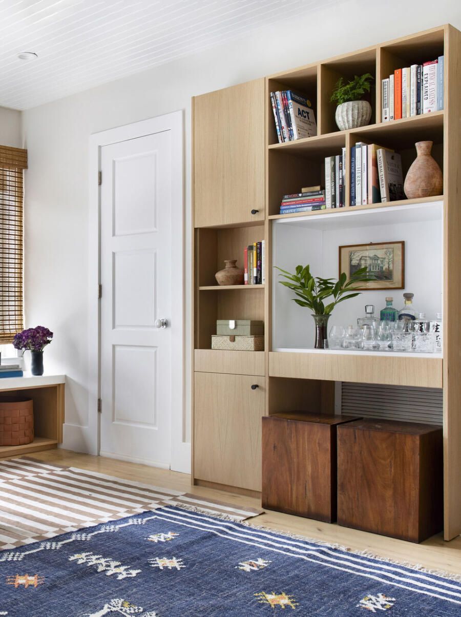 No home office, que também cumpre a função de quarto de hóspedes, o desafio foi aproveitar ao máximo uma área compacta. A solução veio com marcenaria sob medida, uma escrivaninha menor de formato orgânico sobreposta a um móvel baixo sob as janelas e uma nova estante criada a partir da remoção parcial de uma parede. A escrivaninha curva reforça a sensação de fluidez, enquanto o sofá-cama, o pufe de couro e o mix de tapetes ajudam a compor uma atmosfera acolhedora e informal, alinhada ao espírito coastal da casa.