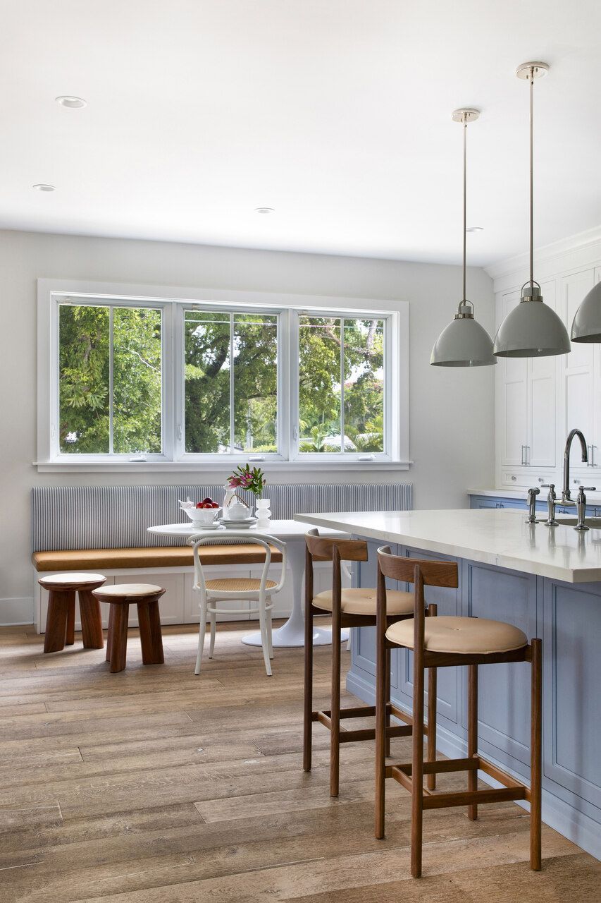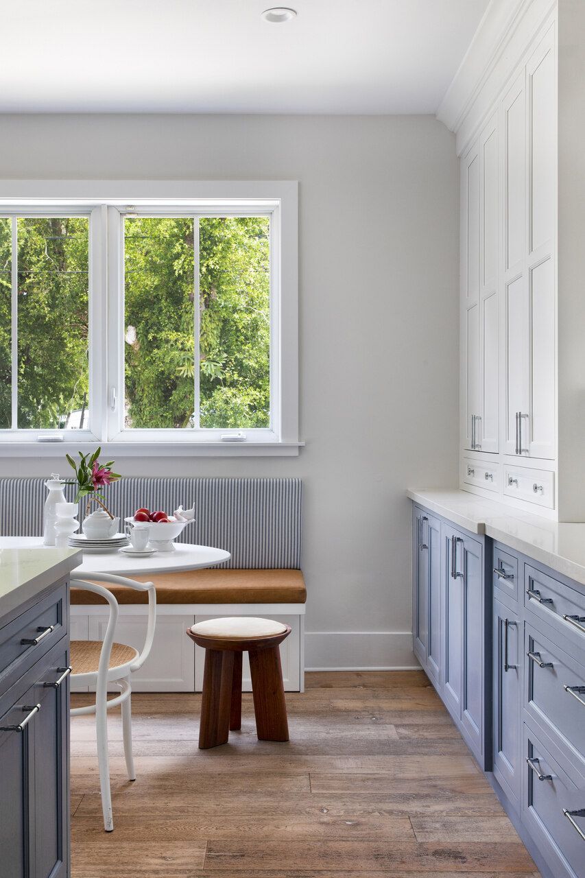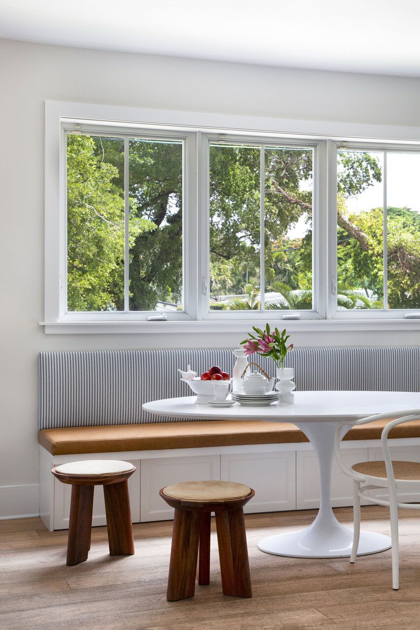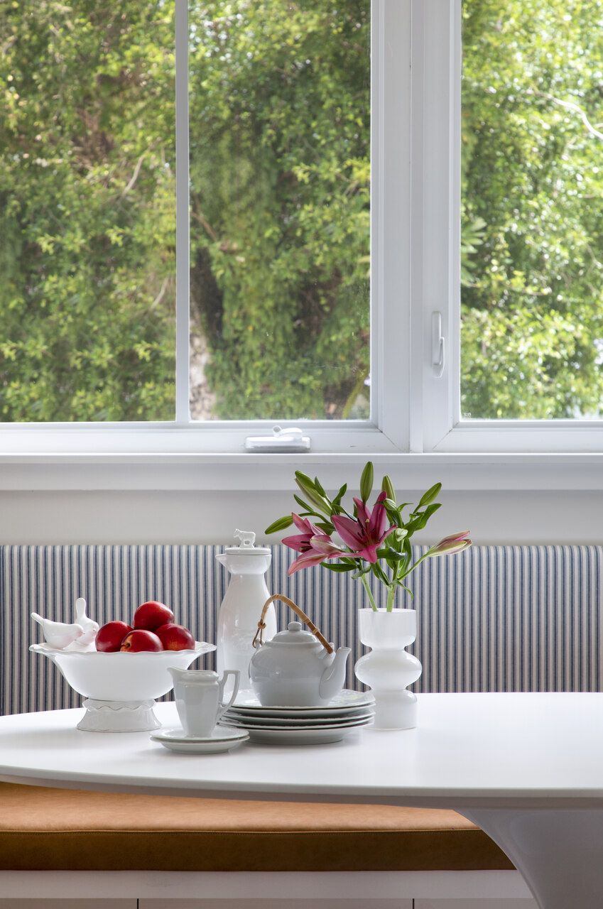 A cozinha, originalmente toda branca, passou por uma transformação cuidadosa, sem necessidade de reforma completa. Os armários inferiores ganharam um tom de azul claro, enquanto os superiores permaneceram brancos, garantindo leveza visual. O frontão da bancada foi atualizado com azulejos estampados, e luminárias, banquetas e puxadores foram substituídos. Um dos destaques do espaço é o banco desenhado sob medida sob a janela, com assento em couro e encosto em tecido listrado azul e branco, formando uma charmosa copa com a mesa oval Saarinen, cadeiras Thonet brancas e banquinhos de madeira.