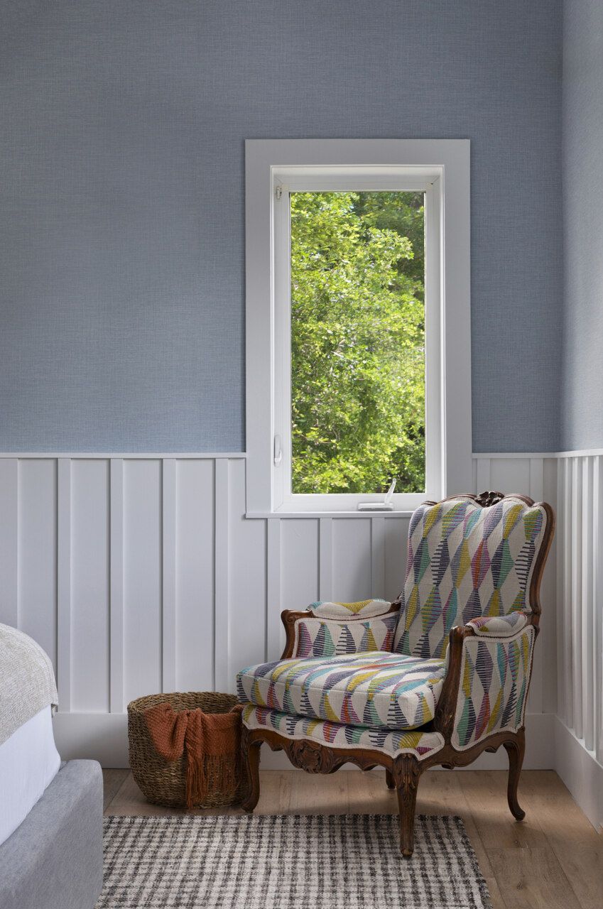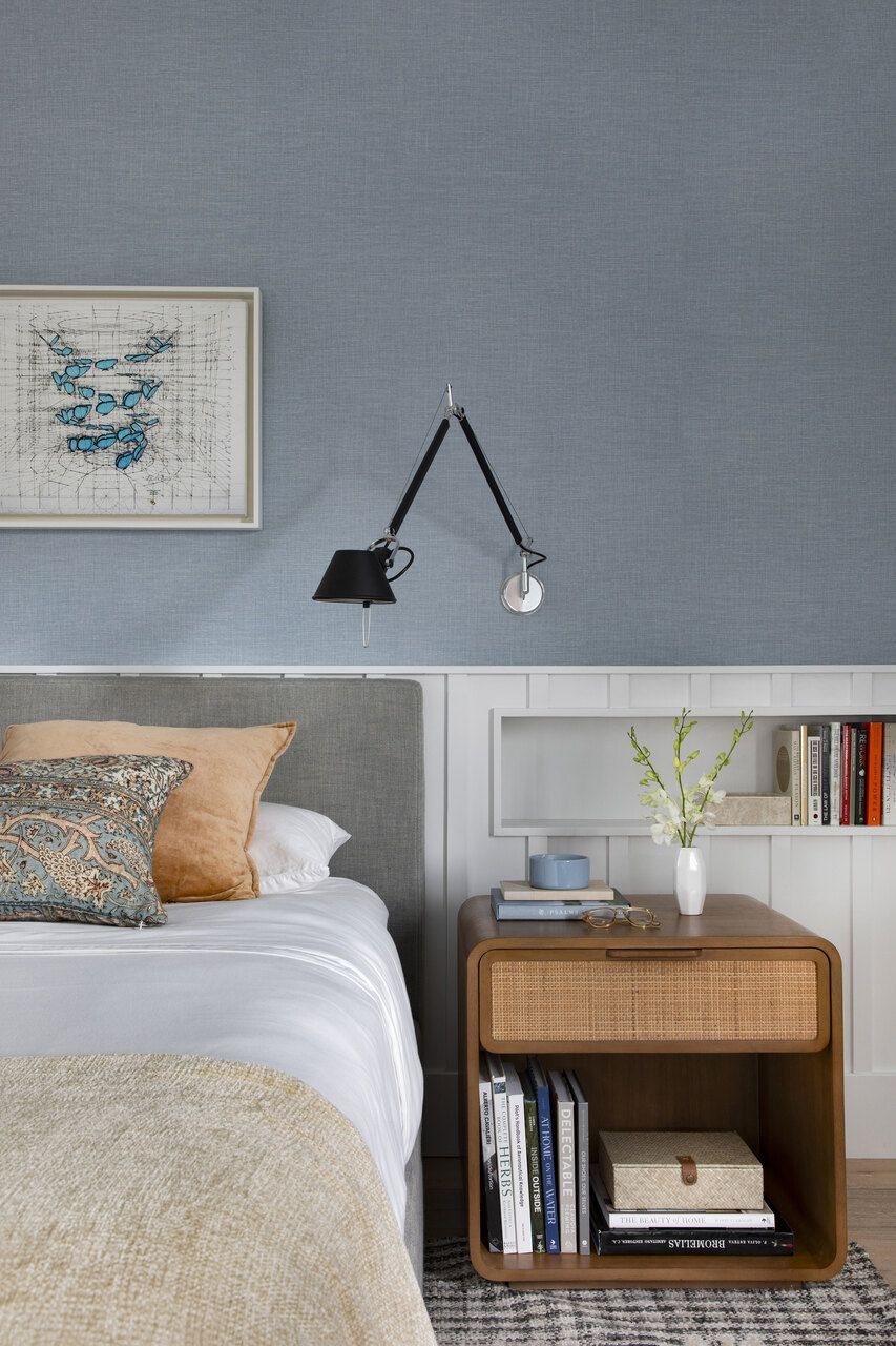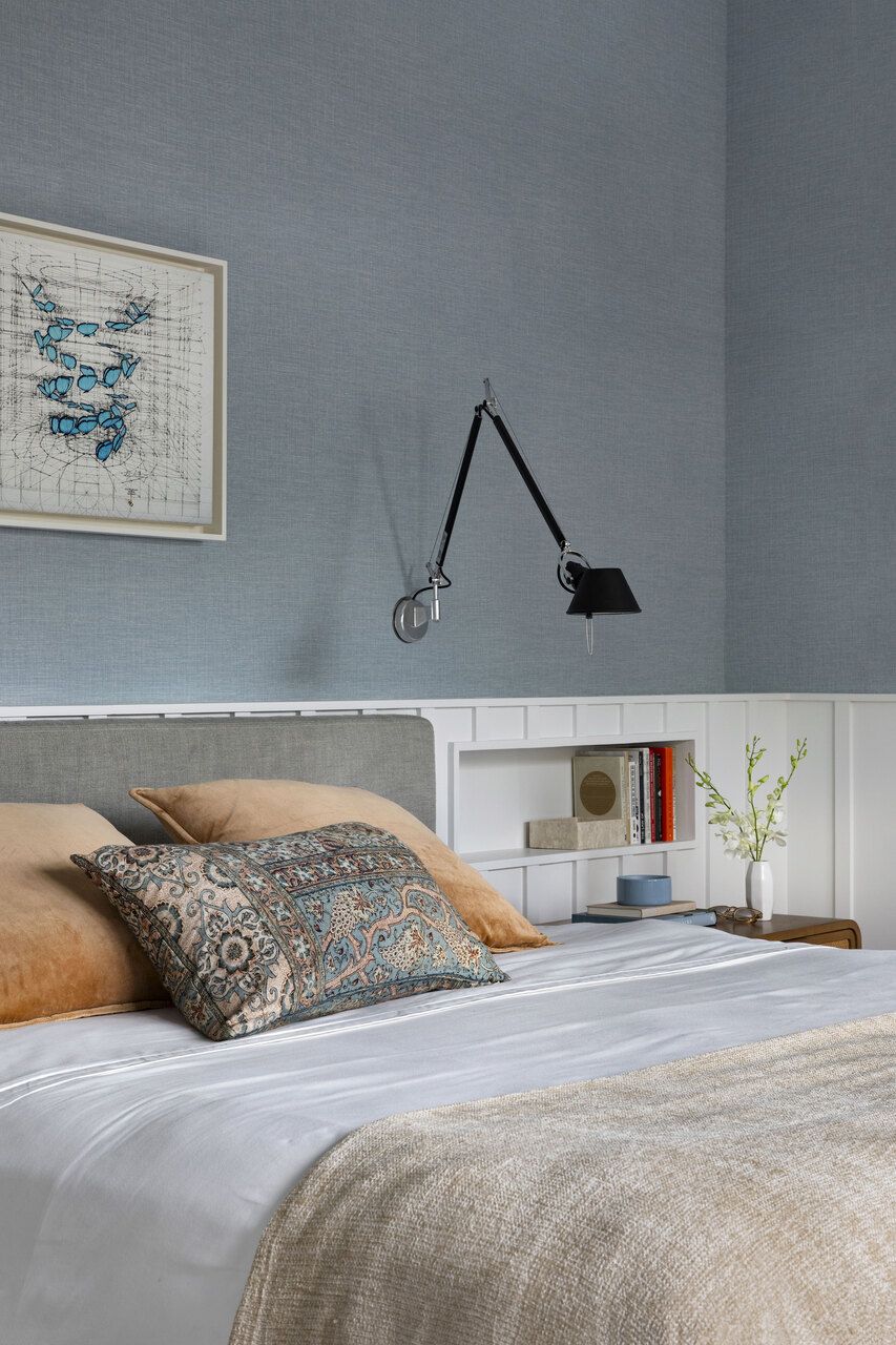 Já a suíte master concentrou as principais alterações de planta. Para melhorar a circulação e o uso do espaço, Daniela fechou uma das portas de acesso ao closet, liberando área nas laterais da cama para mesinhas maiores. O ambiente ganhou painéis brancos que percorrem o quarto, papel de parede azul claro com textura de palhinha e uma pequena estante embutida. O resultado é uma casa que equilibra conforto, identidade e contemporaneidade construída em etapas, mas já plenamente conectada ao modo de viver de seus moradores.
