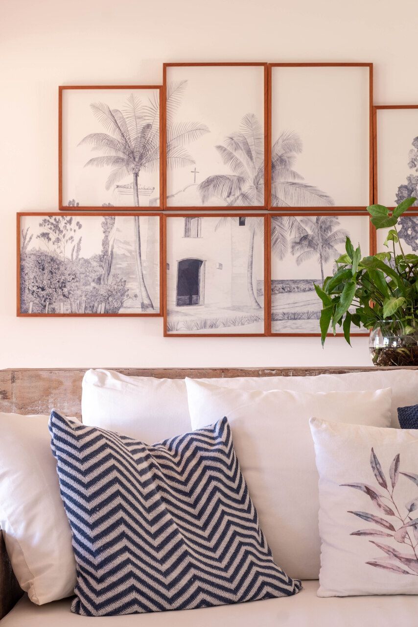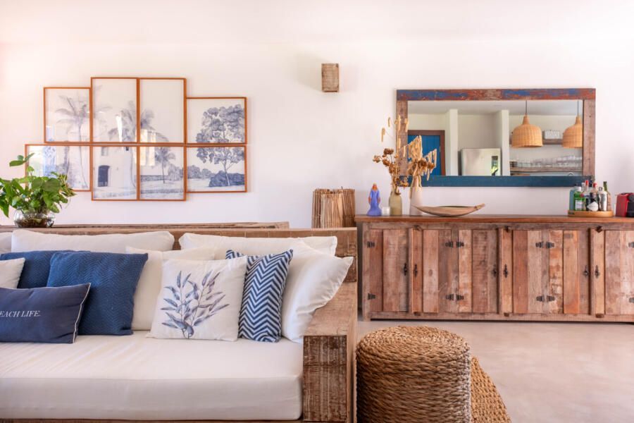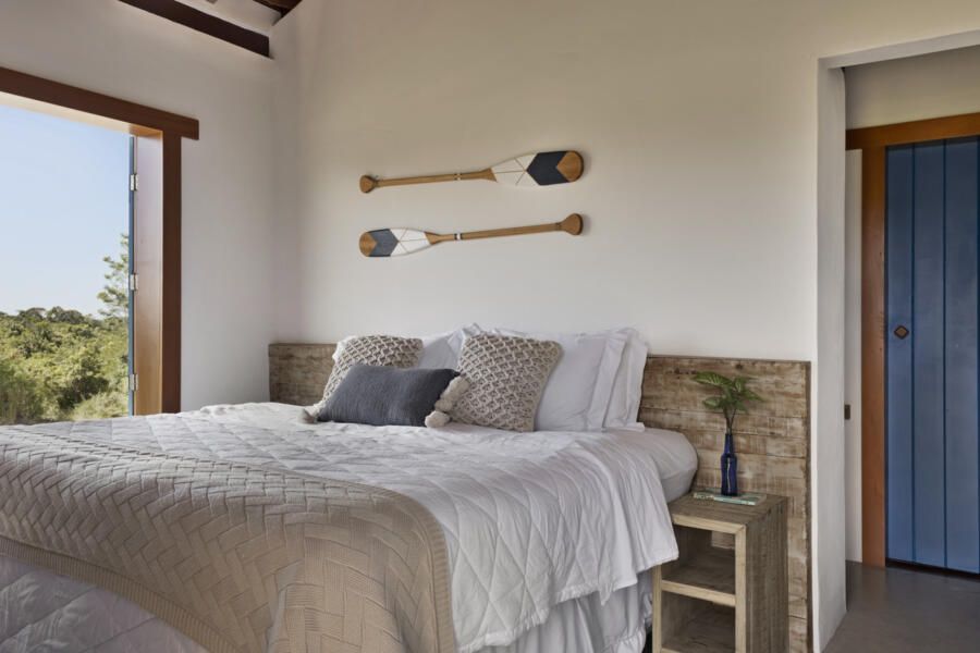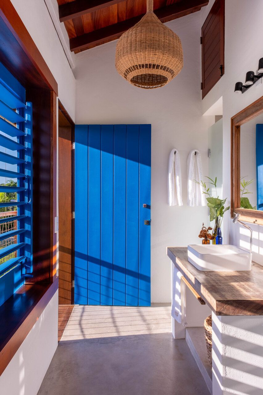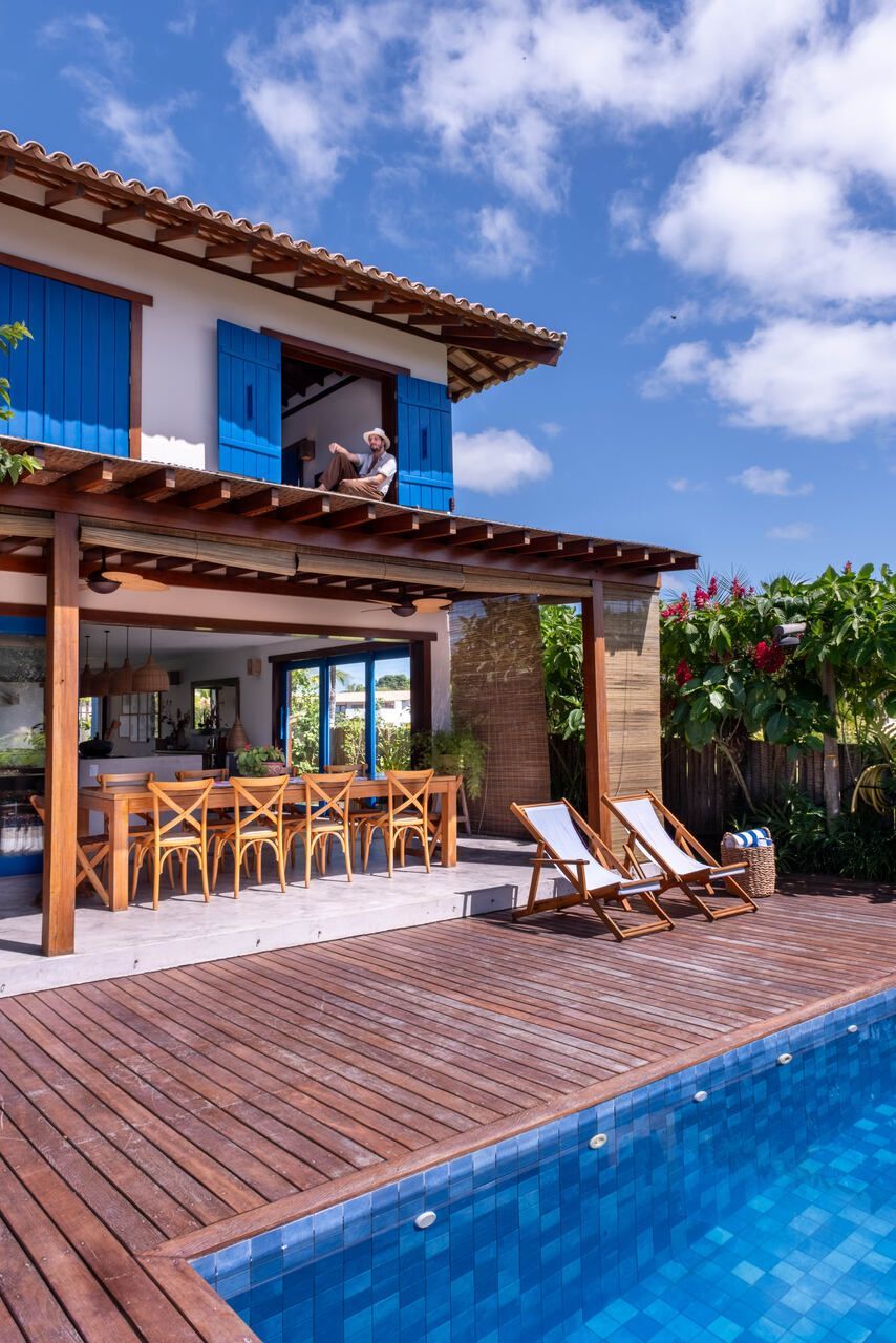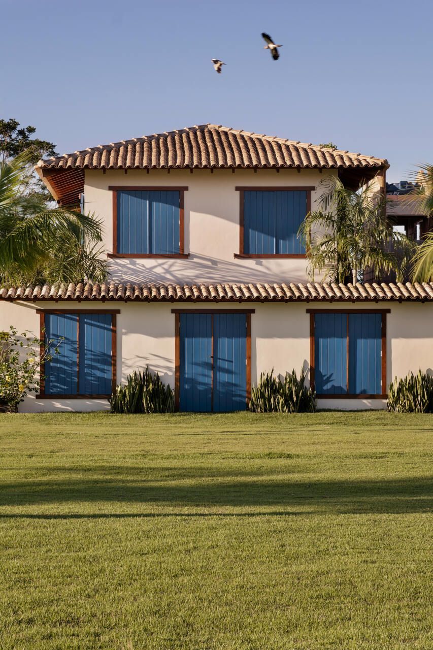 A escolha dos materiais reflete o estilo acolhedor e a inspiração colonial brasileira: caixilharia de madeira pintada de azul, reboco rústico nas fachadas, ladrilhos de Sergipe, decks de tatajuba e prateleiras em madeira patinada. A casa valoriza a produção regional e materiais locais — um aspecto que também reforça sua pegada sustentável.