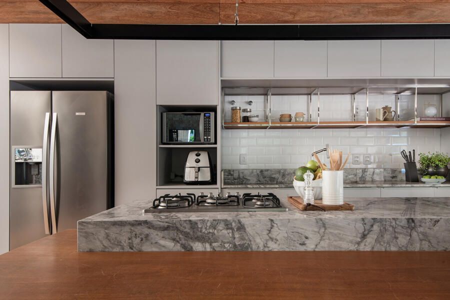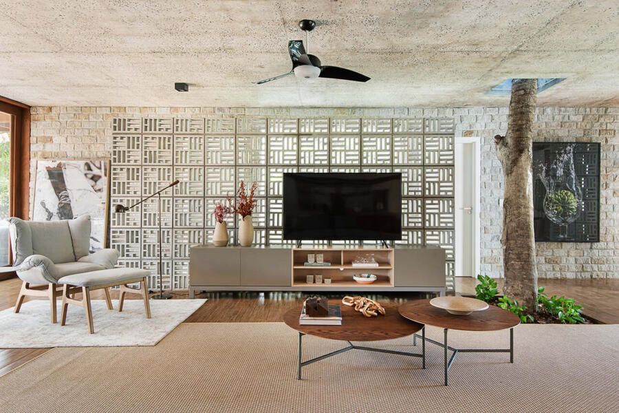 “Logo na entrada, o living se agrega à única cozinha da casa, e através de portas de correr com 3m de largura, se abrem para a varanda gourmet e o jardim dos fundos, ou seja, todos os espaços sociais tem a possibilidade de integração total. As quatro suítes da casa estão resguardadas por uma parede de cobogós de cimento que percorre toda a extensão do terreno – da ponta de entrada até o fundo. A ventilação está garantida através dos elementos vazados, e o charme interno dessas peças foi incorporado ao living integrado.”