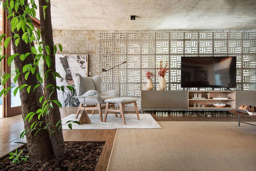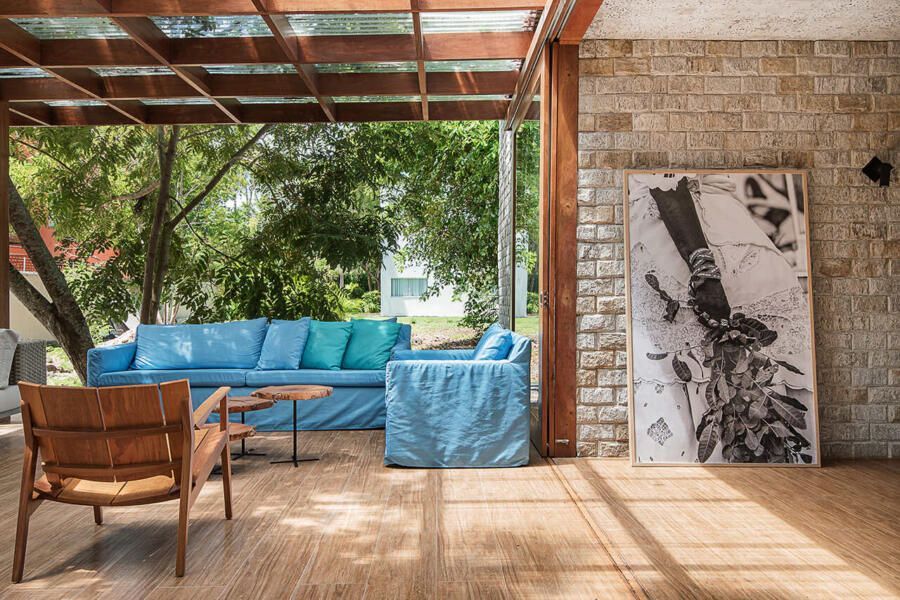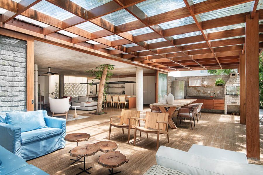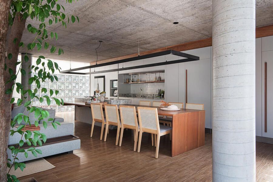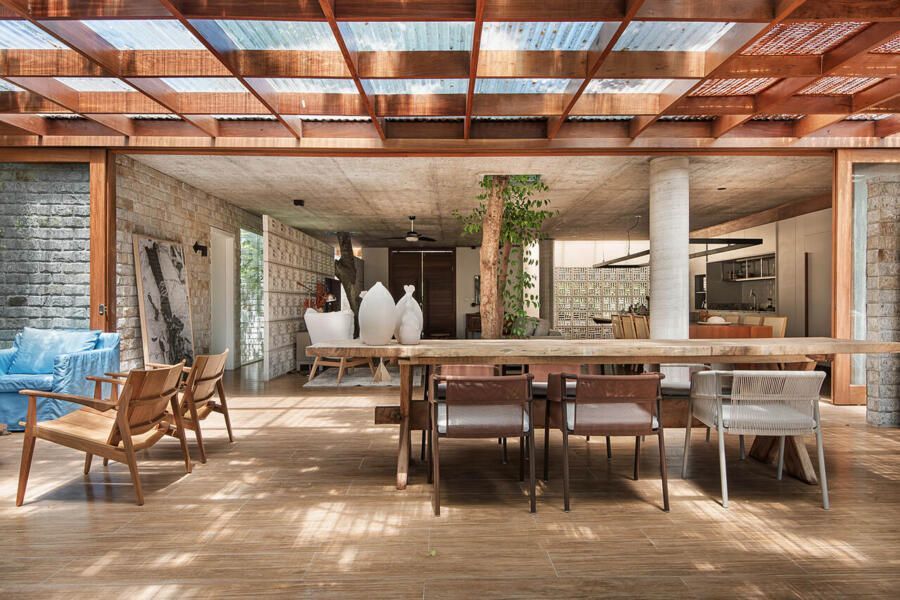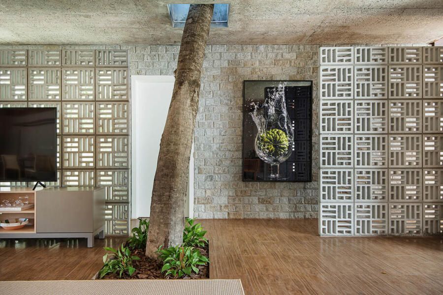 “A solução adotada pelos arquitetos foi integrar os caules destas árvores de tal forma que eles convivessem com a decoração, sem prejudicar a funcionalidade dos espaços, e nem estrangular as raízes da vegetação. Outro desejo foi a valorização da ventilação natural e na integração do verde do terreno com todos os cômodos da casa.”