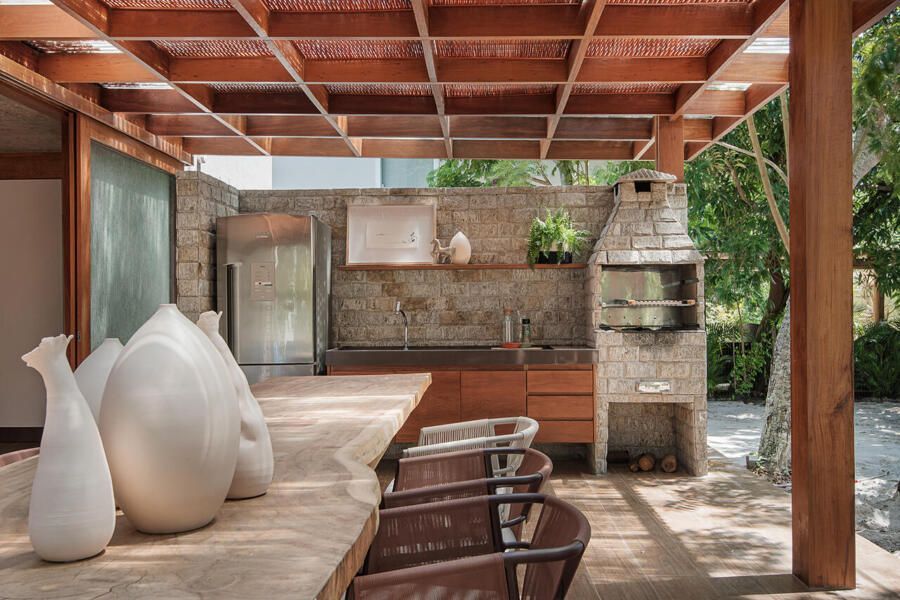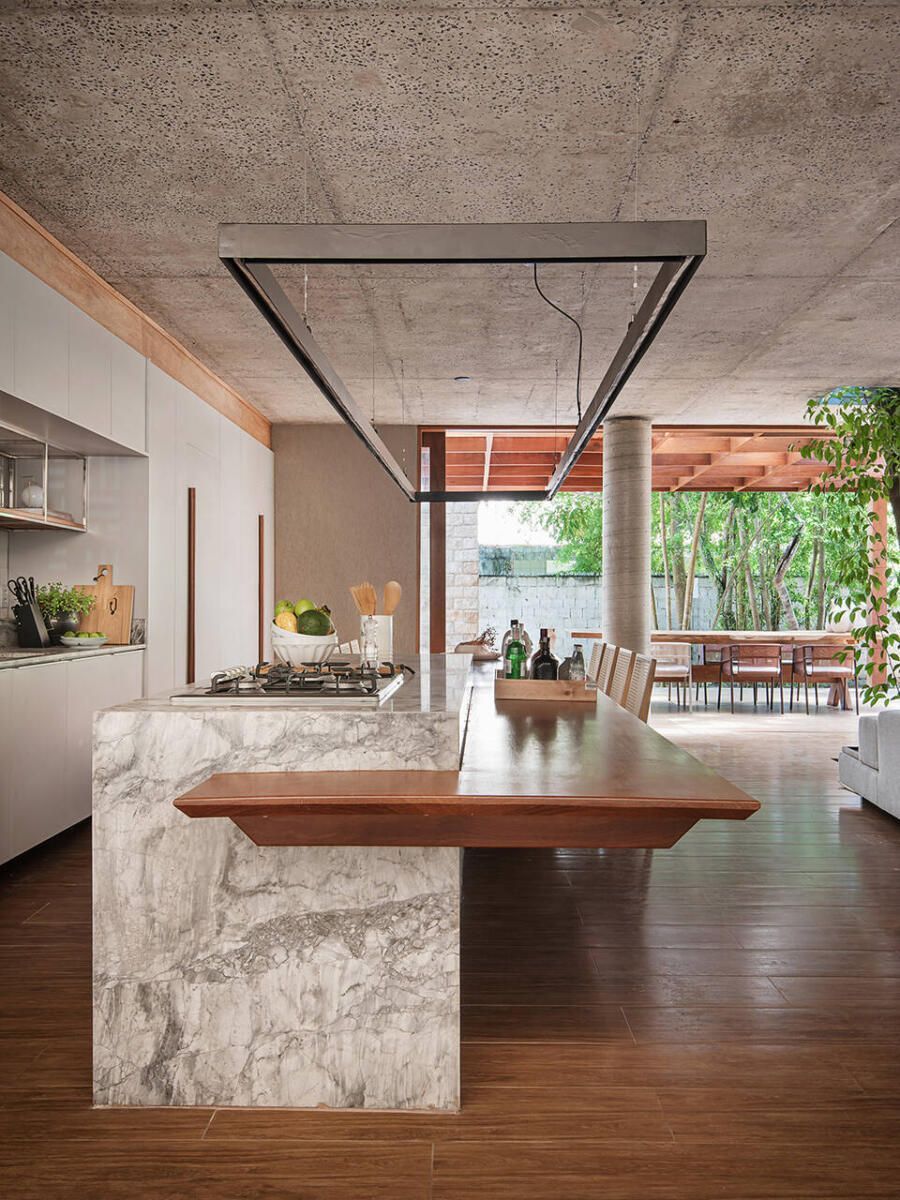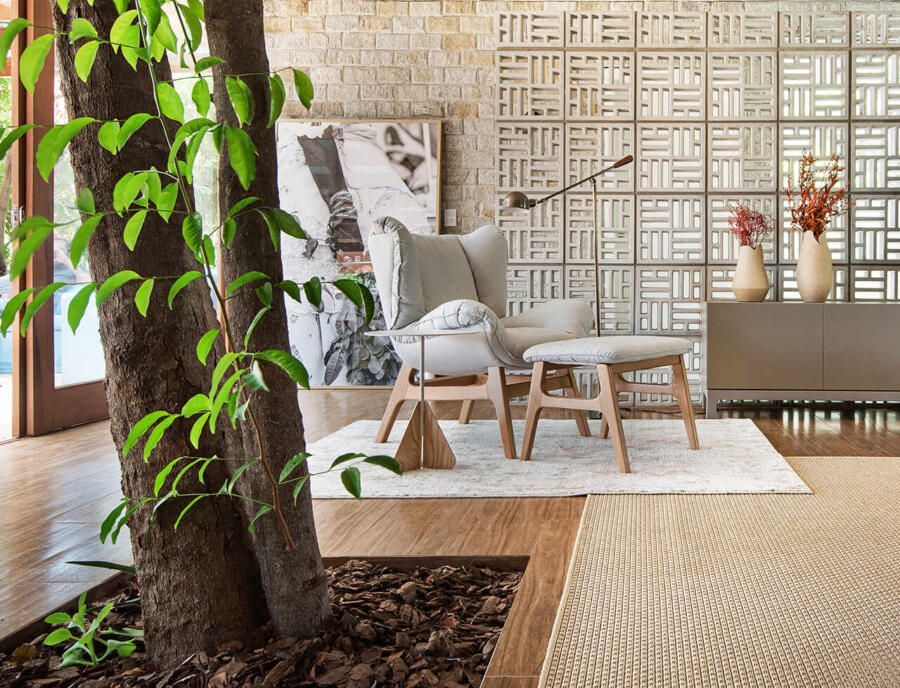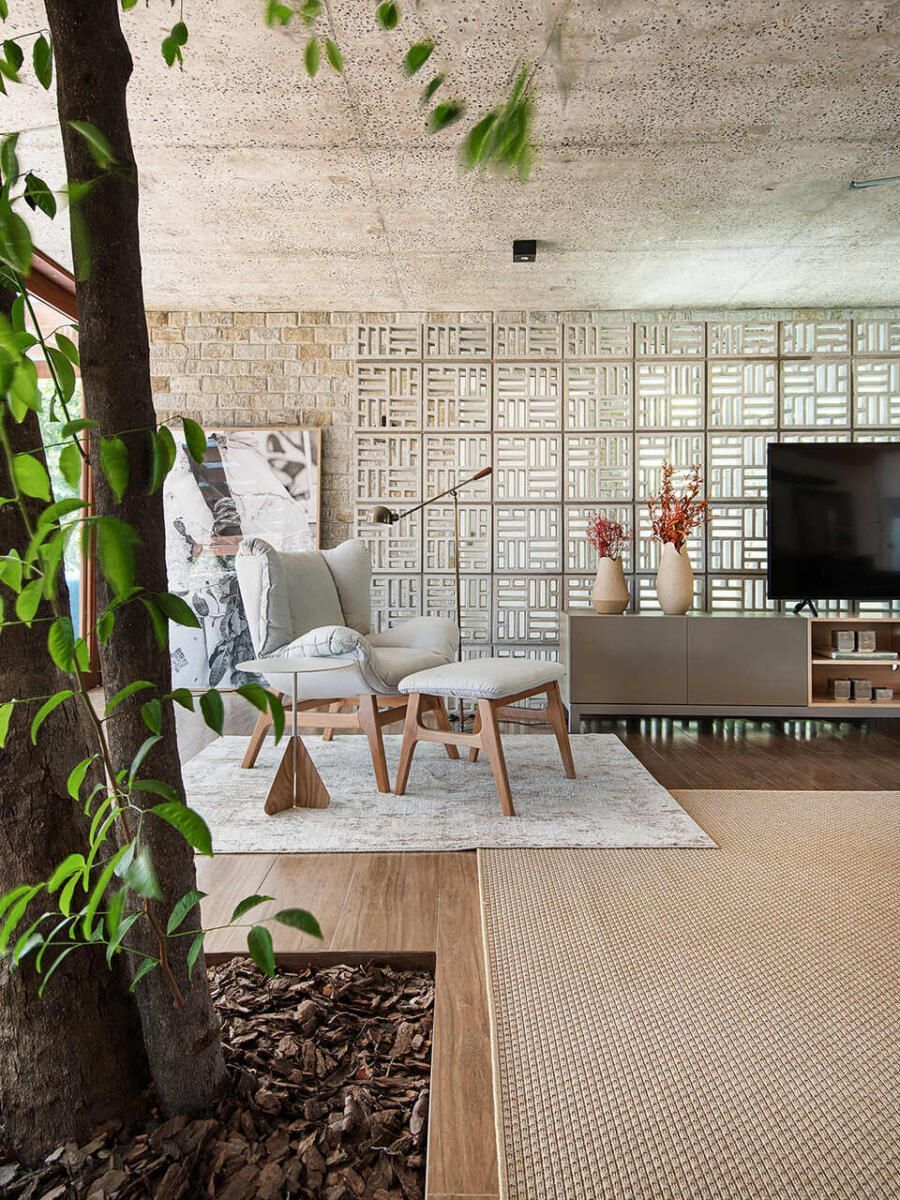 “A solução adotada pelos arquitetos foi integrar os caules destas árvores de tal forma que eles convivessem com a decoração, sem prejudicar a funcionalidade dos espaços, e nem estrangular as raízes da vegetação. Outro desejo foi a valorização da ventilação natural e na integração do verde do terreno com todos os cômodos da casa.”