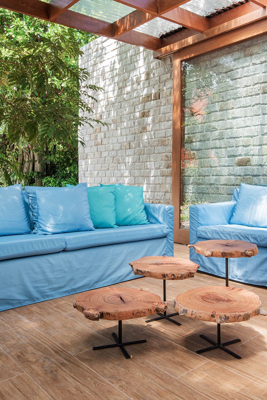 Na decoração, muitas peças de design, como a mesa de centro Releve de Luciana Catani e poltrona com puff Juloe no conjunto de estar. Na varanda, cadeiras contemporâneas Drift da dupla internacional Adolini e Simonini se encaixam na mesa de madeira rústica confeccionada pelo dono da casa. As poltronas Brincantes de madeira maciça de Paulo Foggiato faz companhia aos estofados de brim azul e uma chaise de corda náutica. Nas paredes, fotografias do baiano Guto Estevez.