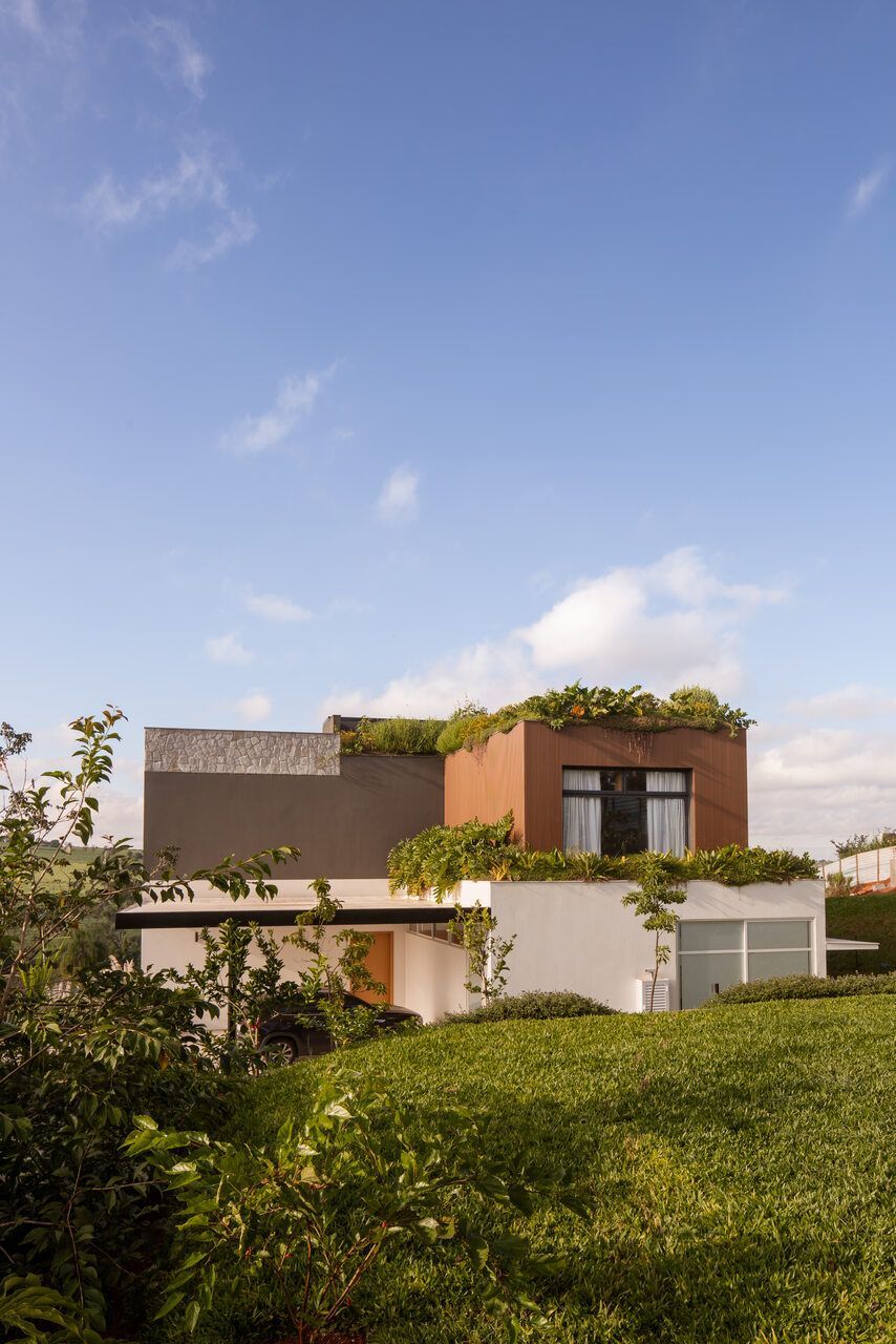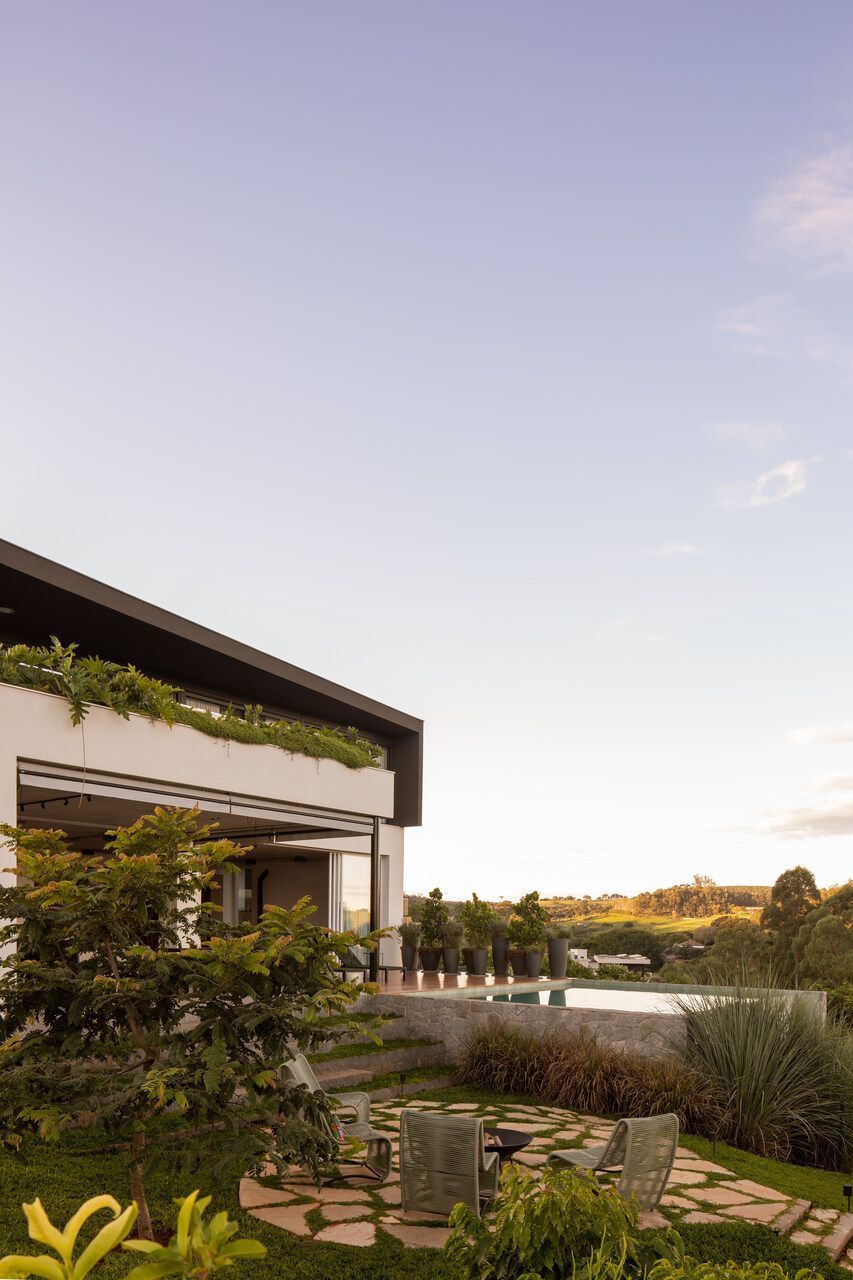 O paisagismo, assinado por Olivia Uliano, atua como extensão da arquitetura, costurando os volumes construídos com o entorno natural do condomínio e reforçando a sensação de refúgio. No rooftop, a vista aberta para o campo sintetiza o espírito do projeto: uma casa feita para viver, permanecer e compartilhar.