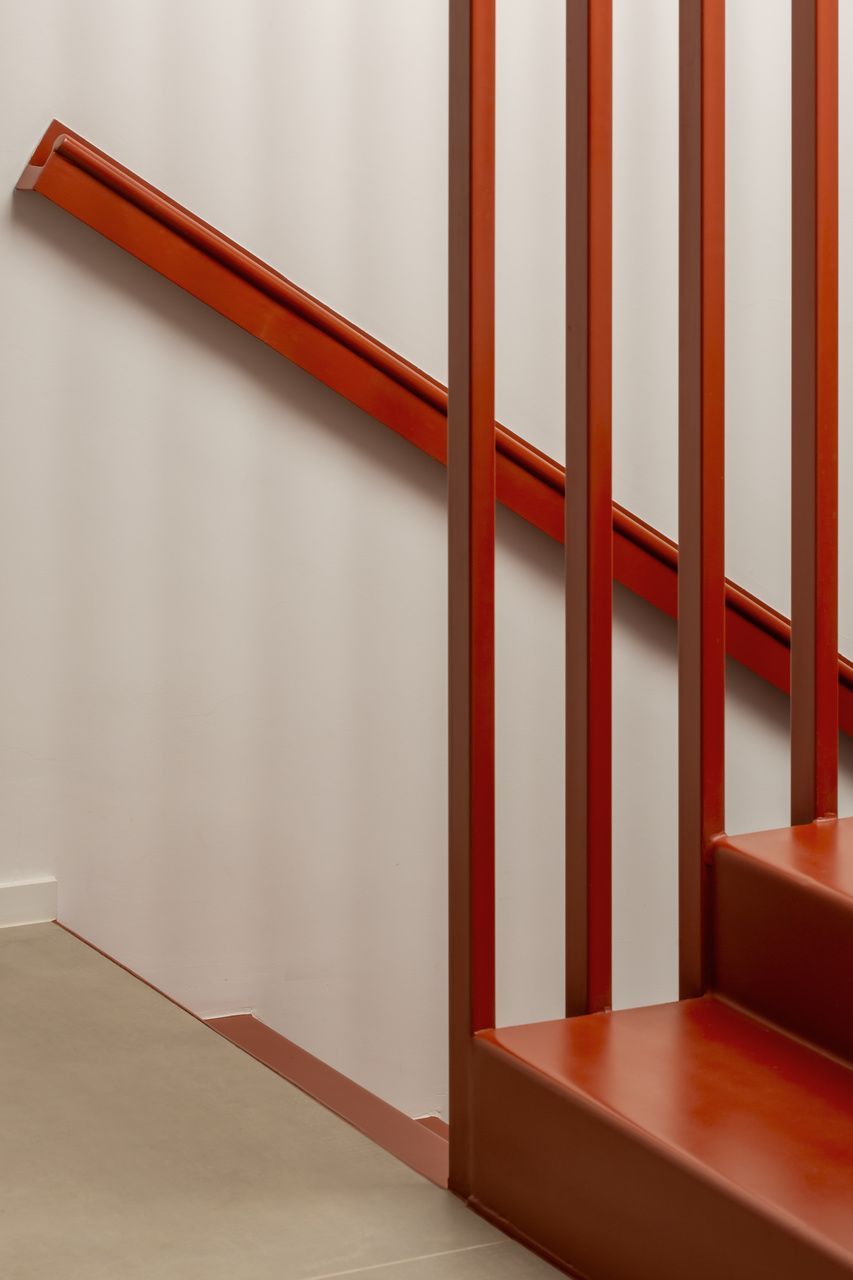 A presença dos filhos influenciou diretamente o desenho da casa, que incorpora elementos lúdicos e inesperados. O mais emblemático deles é o escorregador integrado à escada, um pedido dos clientes para trazer leveza e diversão ao dia a dia. A piscina e a área verde ampla completam o cenário, oferecendo liberdade para que os adolescentes e seus amigos ocupem a casa com naturalidade. Os materiais escolhidos reforçam essa ideia de uma arquitetura prática, honesta e acolhedora. Cada acabamento foi pensado para equilibrar estética, funcionalidade e fácil manutenção, sem excessos.