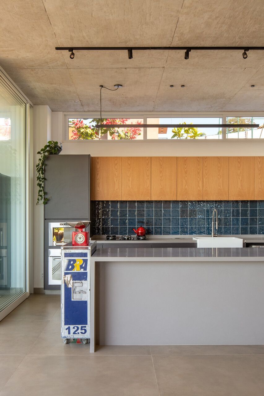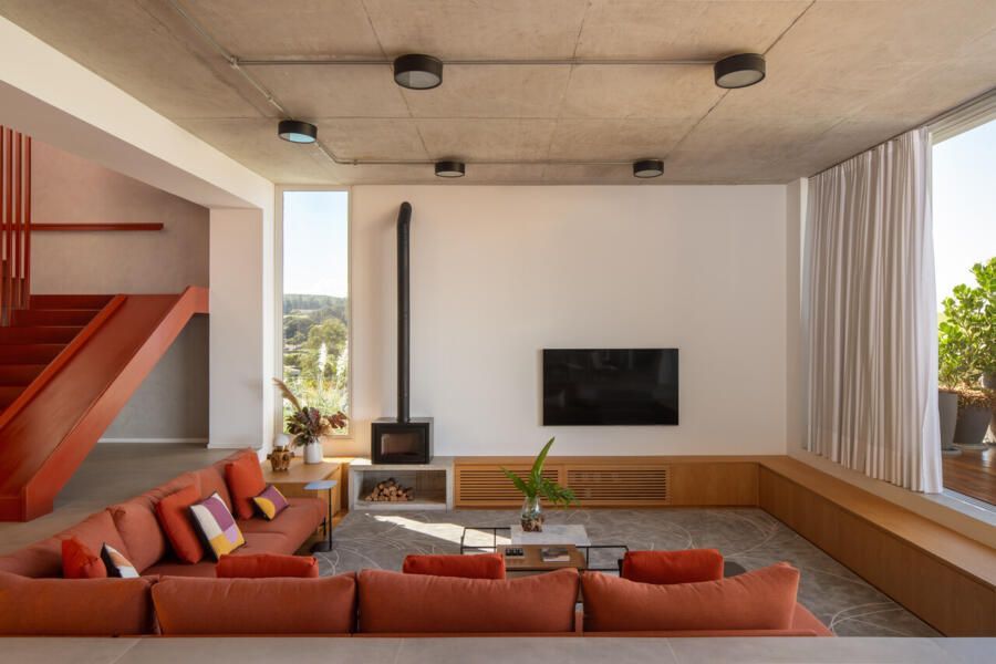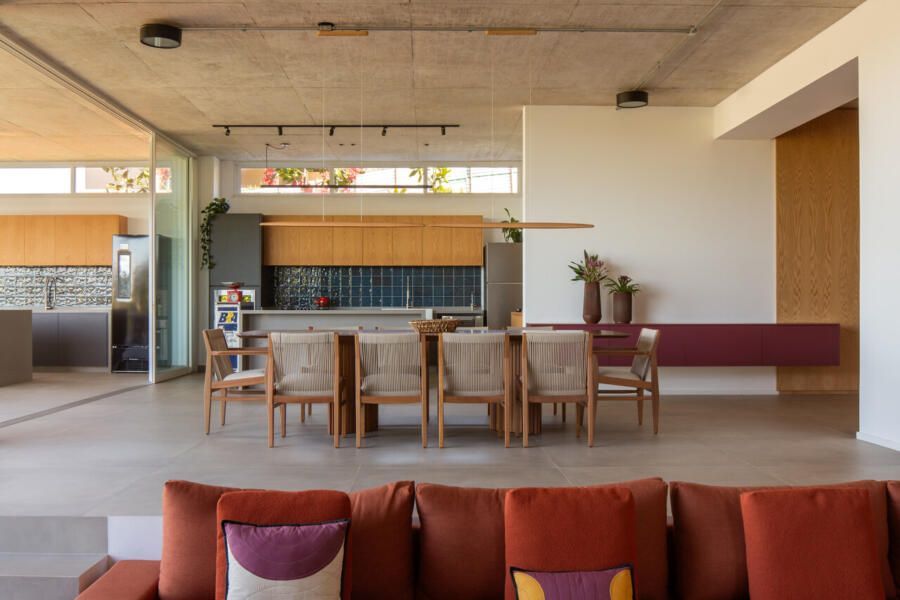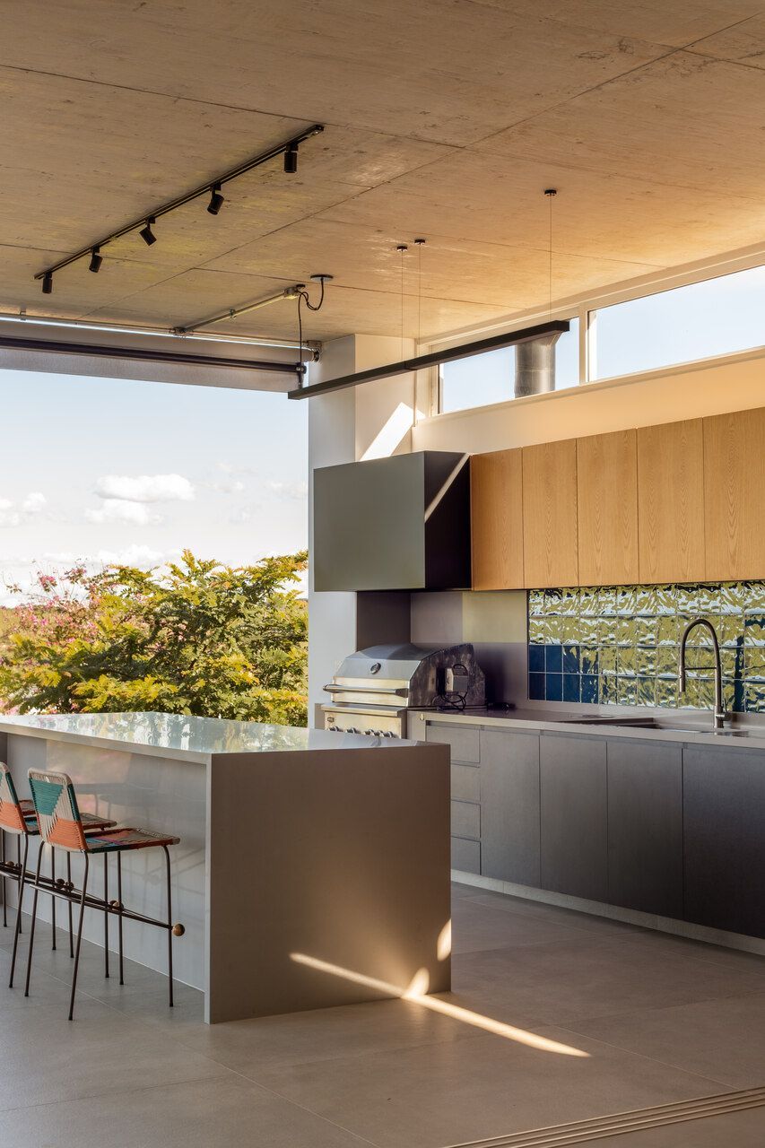 Um dos grandes desafios do projeto foi lidar com o terreno em declive, garantindo facilidade de acesso, privacidade em relação às casas vizinhas e, ao mesmo tempo, o melhor aproveitamento da vista livre. A solução veio por meio de uma implantação cuidadosa, que organiza os ambientes de forma fluida e valoriza as áreas comuns como o verdadeiro coração da casa. Cozinha, estar e espaços externos se conectam visual e fisicamente, criando cenários ideais para encontros longos, despretensiosos e cheios de vida.