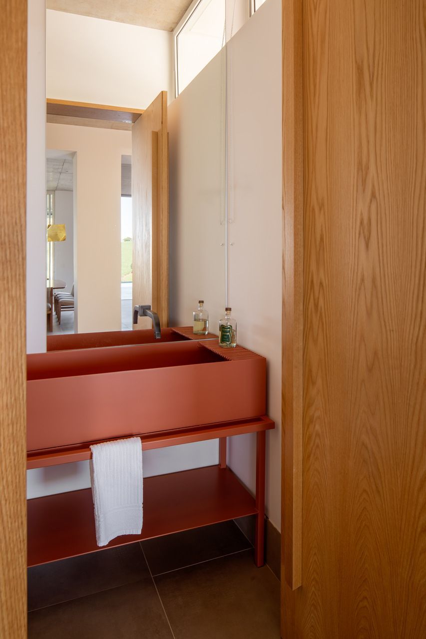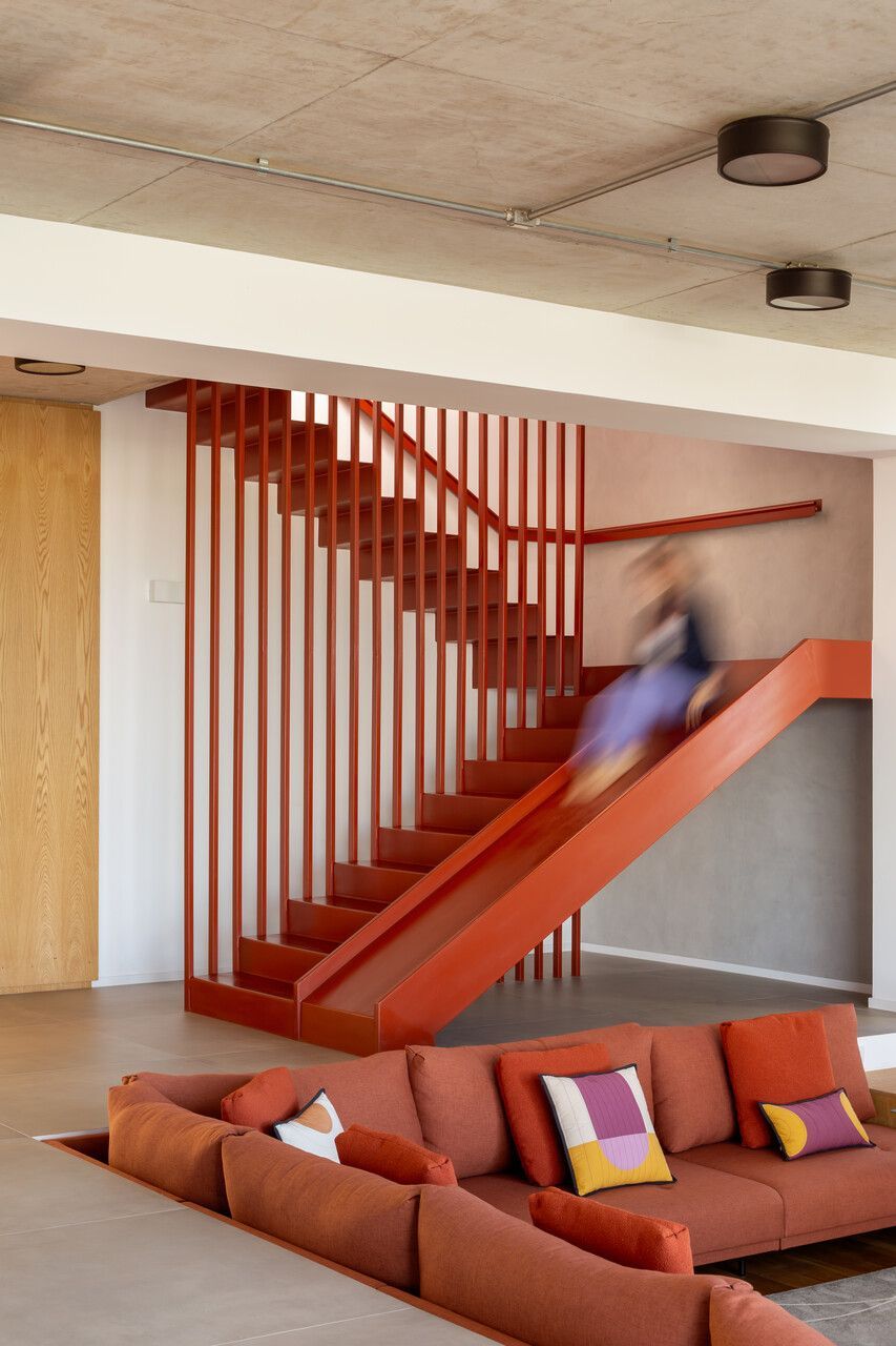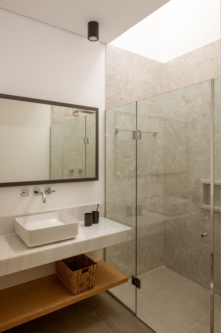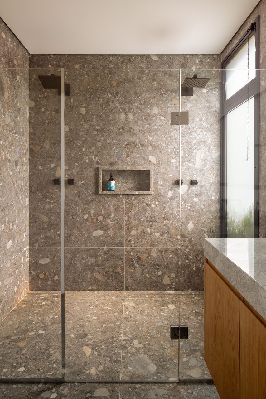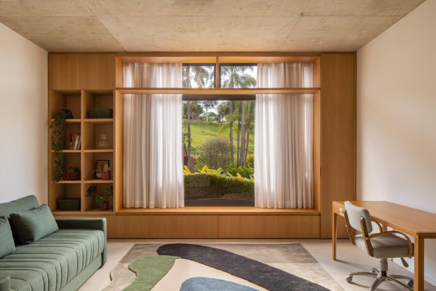 A presença dos filhos influenciou diretamente o desenho da casa, que incorpora elementos lúdicos e inesperados. O mais emblemático deles é o escorregador integrado à escada, um pedido dos clientes para trazer leveza e diversão ao dia a dia. A piscina e a área verde ampla completam o cenário, oferecendo liberdade para que os adolescentes e seus amigos ocupem a casa com naturalidade. Os materiais escolhidos reforçam essa ideia de uma arquitetura prática, honesta e acolhedora. Cada acabamento foi pensado para equilibrar estética, funcionalidade e fácil manutenção, sem excessos.