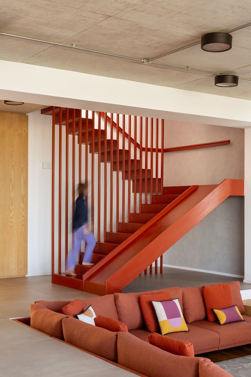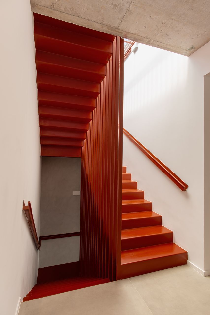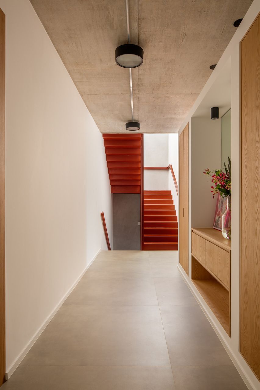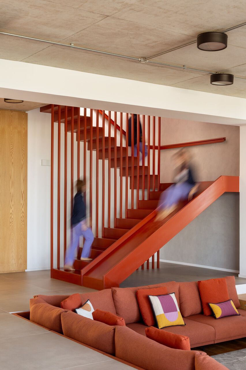 A presença dos filhos influenciou diretamente o desenho da casa, que incorpora elementos lúdicos e inesperados. O mais emblemático deles é o escorregador integrado à escada, um pedido dos clientes para trazer leveza e diversão ao dia a dia. A piscina e a área verde ampla completam o cenário, oferecendo liberdade para que os adolescentes e seus amigos ocupem a casa com naturalidade. Os materiais escolhidos reforçam essa ideia de uma arquitetura prática, honesta e acolhedora. Cada acabamento foi pensado para equilibrar estética, funcionalidade e fácil manutenção, sem excessos.