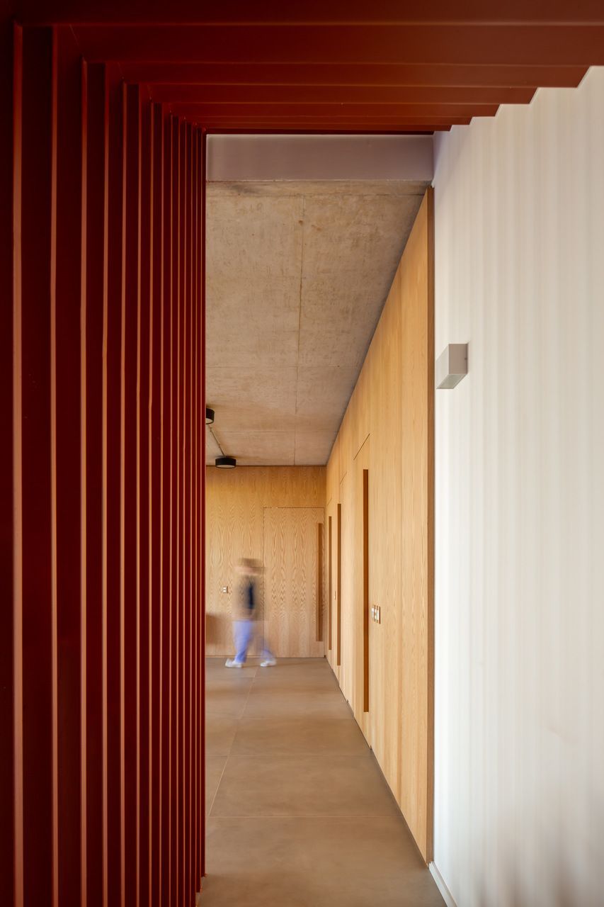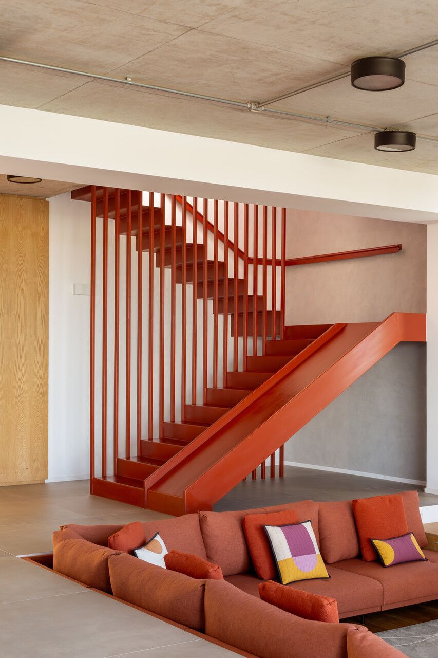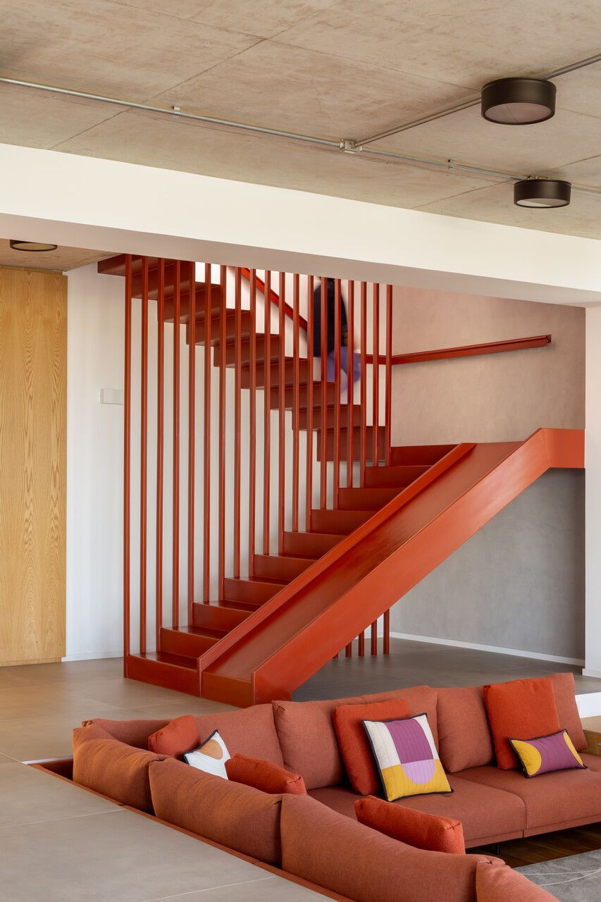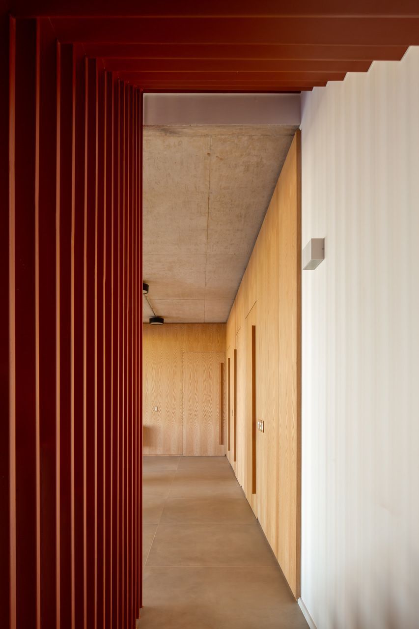 A presença dos filhos influenciou diretamente o desenho da casa, que incorpora elementos lúdicos e inesperados. O mais emblemático deles é o escorregador integrado à escada, um pedido dos clientes para trazer leveza e diversão ao dia a dia. A piscina e a área verde ampla completam o cenário, oferecendo liberdade para que os adolescentes e seus amigos ocupem a casa com naturalidade. Os materiais escolhidos reforçam essa ideia de uma arquitetura prática, honesta e acolhedora. Cada acabamento foi pensado para equilibrar estética, funcionalidade e fácil manutenção, sem excessos.