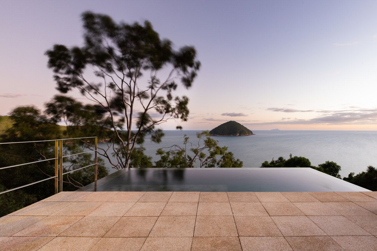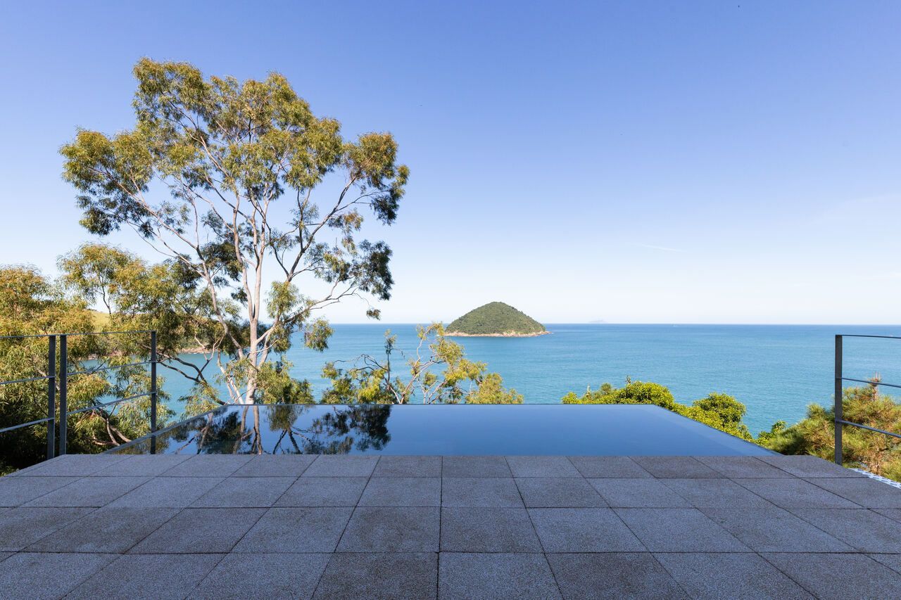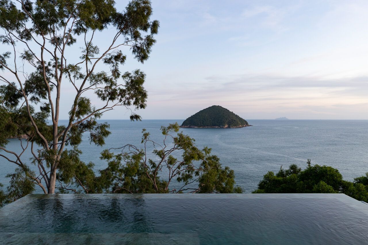 A piscina como fundo infinito de frente para o mar, a mais de 60m de altura do nível do mar, parece suspensa sob a copa das árvores. Seu tom azulado torna ainda imersa na paisagem e é um dos atrativos da casa para quem quer flanar entre as aguas e o ar.